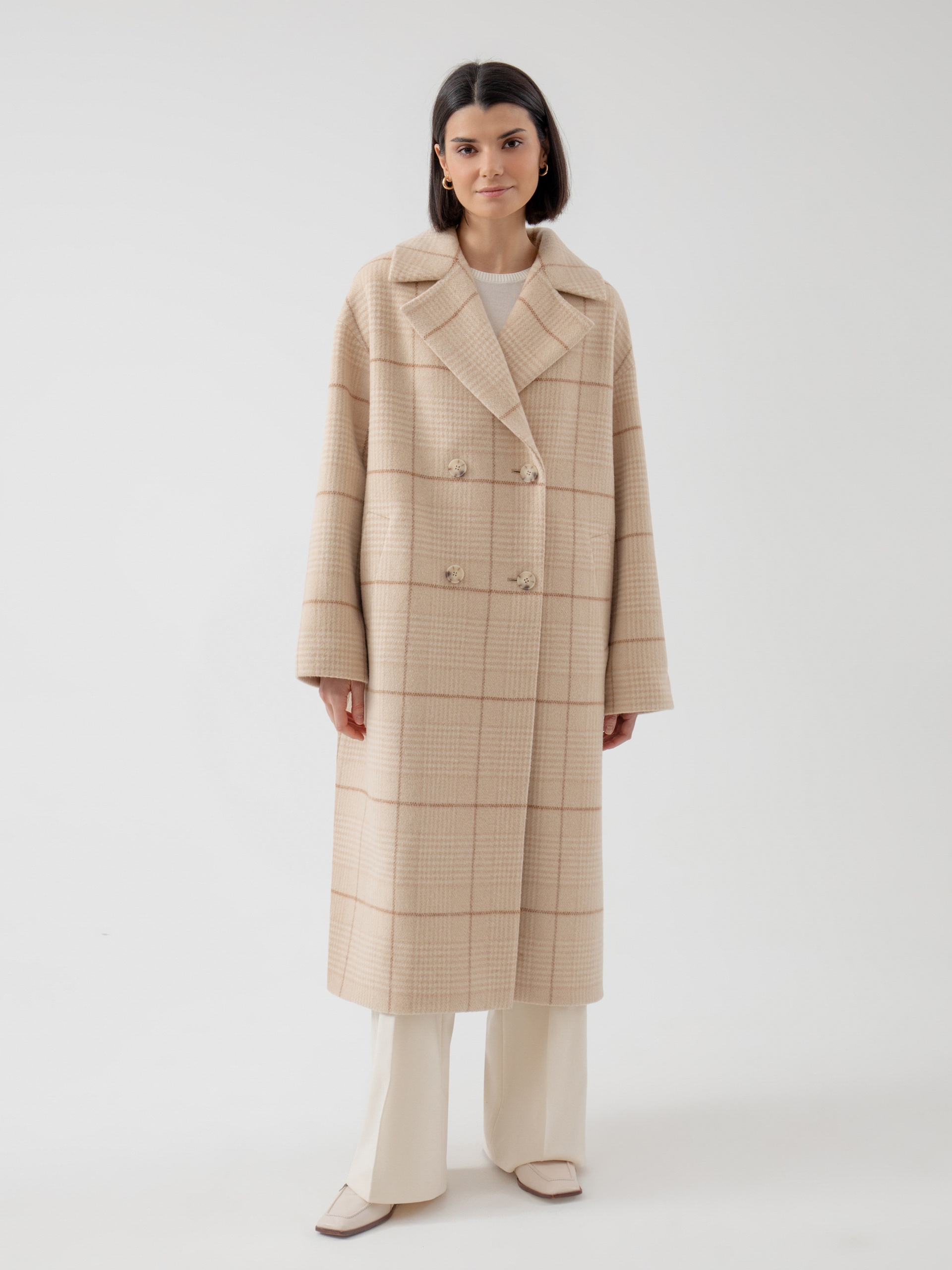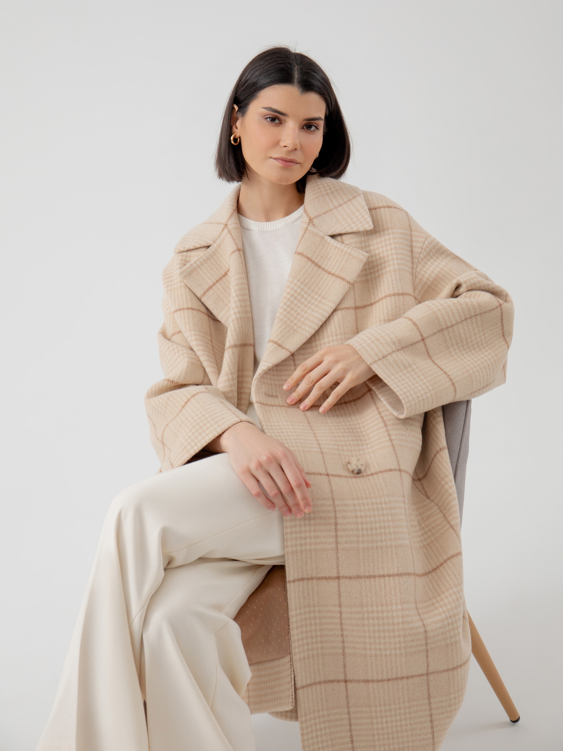 Объемное пальто силуэта "удлиненный кокон" из премиальной шерстяной ткани в бежево-коричневую клетку. Пальто имеет универсальную длину до колена, классический английский воротник и надежную застежку на ряд стильных пуговиц под натуральный рог. Пальто выполнено из мягкой шерстяной ворсовой ткани, а для наилучшего сохранения тепла и надежной защиты от непогоды используется мембрана RaftPro, которая отлично защищает от ветра. Произведено в Санкт-Петербурге.