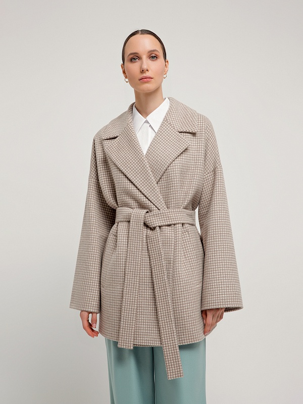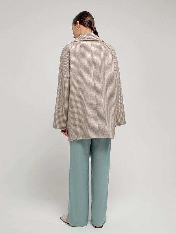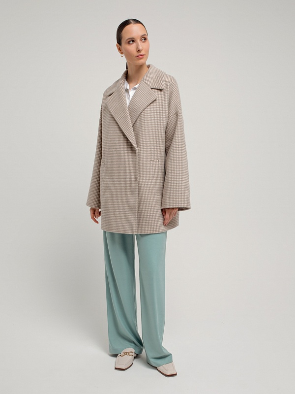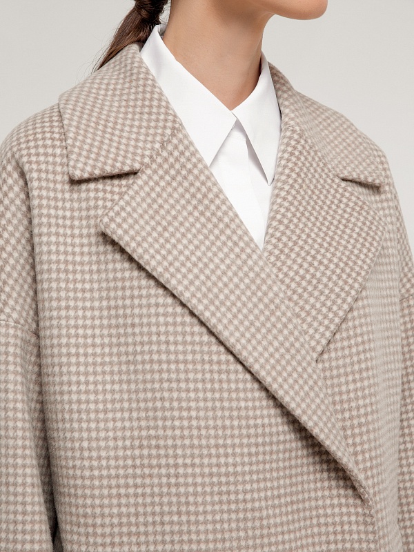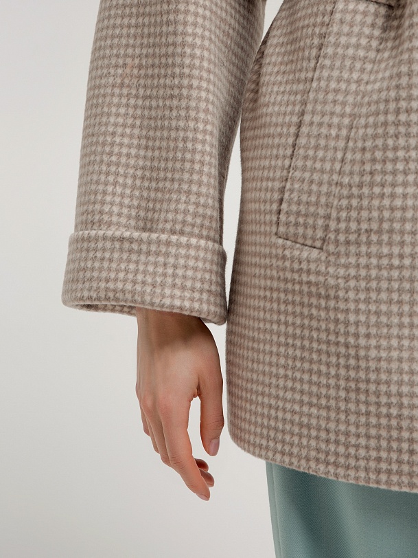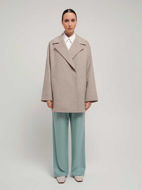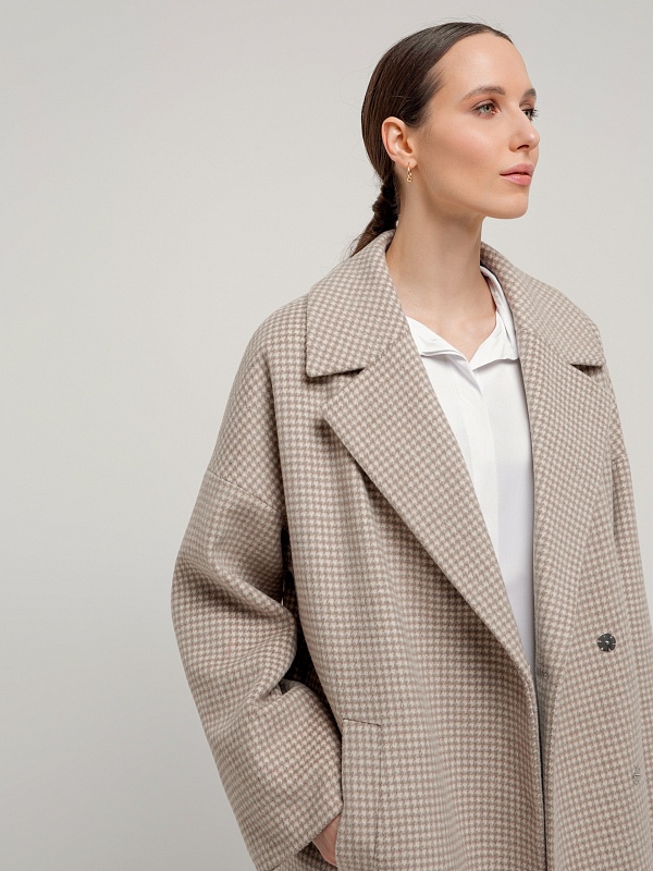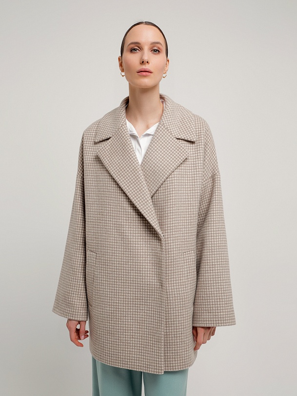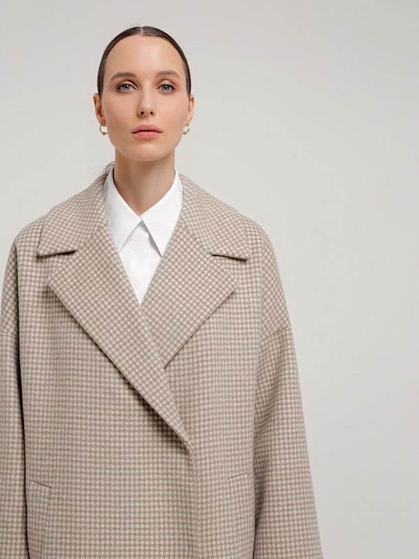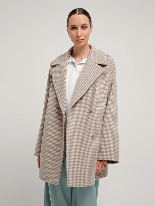 Двубортное укороченное пальто прямого силуэта из шерстяной ткани бежево-молочного цвета. Широкий английский воротник, два ряда крупных пуговиц, рубашечный рукав с широкой подгибкой низа и глубокие карманы с листочками делают пальто невероятно комфортным в носке, а цвет и форма делают его очень стильным. Длина пальто выше колена. Пальто произведено из шерстяной ткани с ворсом dogtooth. Произведено в Санкт-Петербурге.
