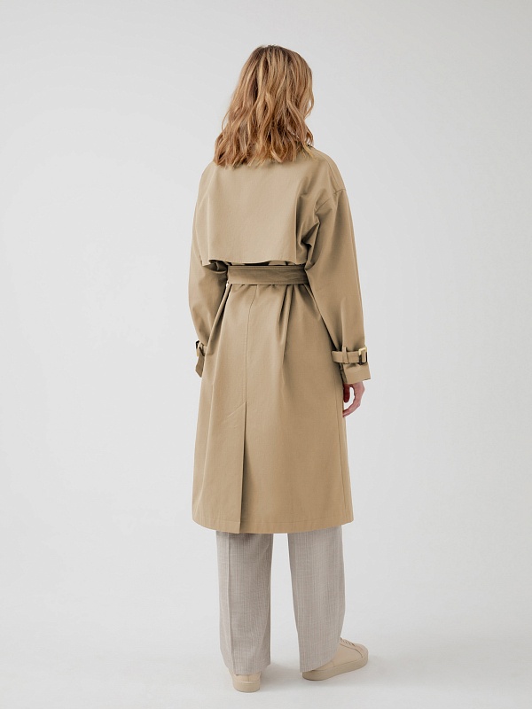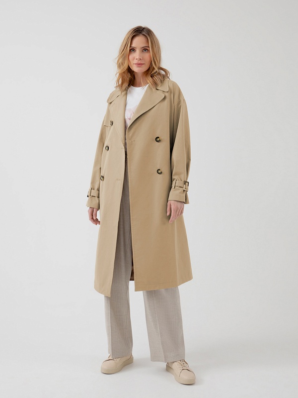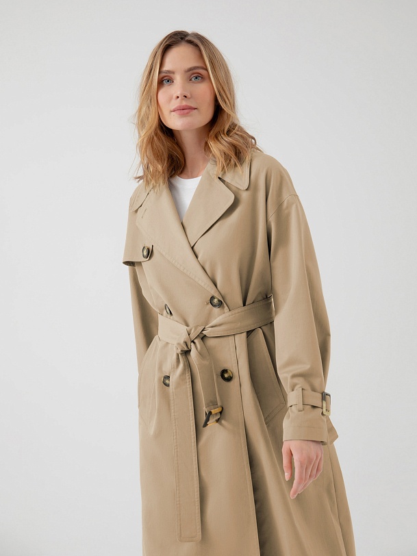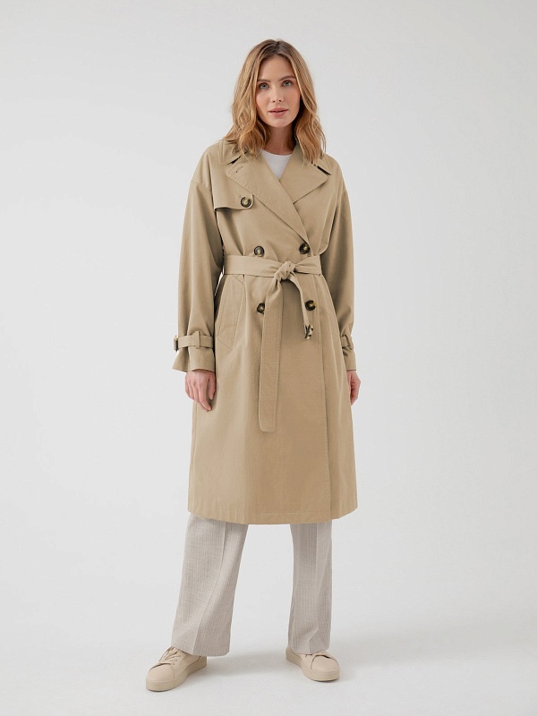 Двубортный тренч прямого силуэта в благородном бежевом цвете. Тренч выполнен из премиальной плащевой ткани с высоким содержанием хлопка в составе. В комплекте к тренчу прилагается пояс, который не только служит дополнительным декором, но и с легкостью меняет силуэт на более женственный, подчеркивая талию и придавая утонченности образу. Застегивается тренч на два ряда крупных глянцевых пуговиц под натуральный рог. В качестве дополнительной защиты от внешних факторов на тренче располагается пуговица, которая позволяет поднять английский воротник и, зафиксировав его, закрыть шею без использования дополнительных теплых аксессуаров. Тренч выполнен на подкладке.