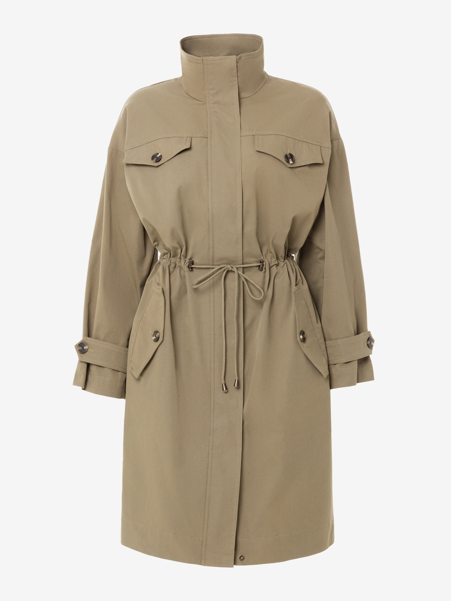 Плащ прямого силуэта из премиальной плащевой ткани в цвете "серебряный шалфей". Воротник-стойка, стильно смотрится и защищает от сильного ветра. В области талии плащ имеет кулиску с завязками, который с легкостью регулирует посадку и делает силуэт как более прилегающим, так и свободным. Тренч имеет четыре кармана с клапанами, которые не только очень функциональные, но и служат дополнительным декором. Спущенный рубашечный рукав очень комфортный и дает возможность с легкостью надевать первым слоем более объемные вещи, не стесняя при этом движений.