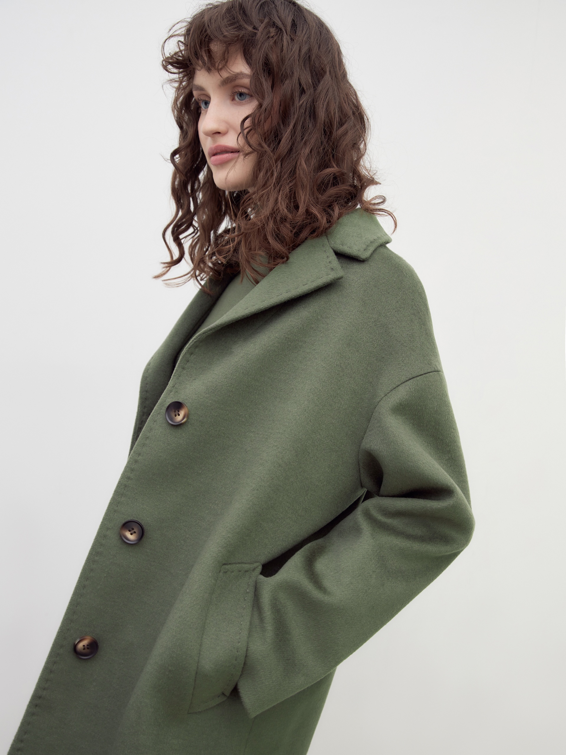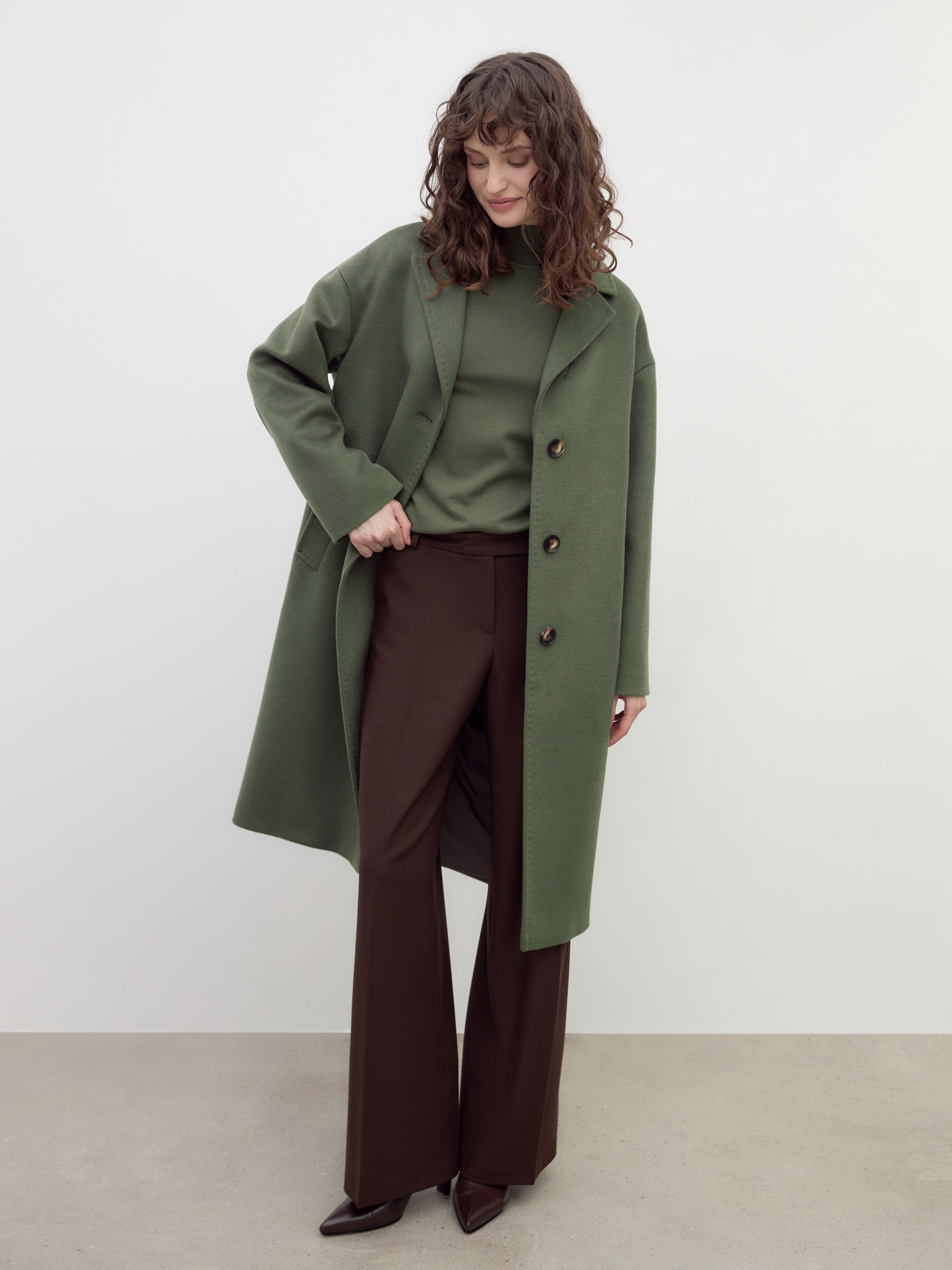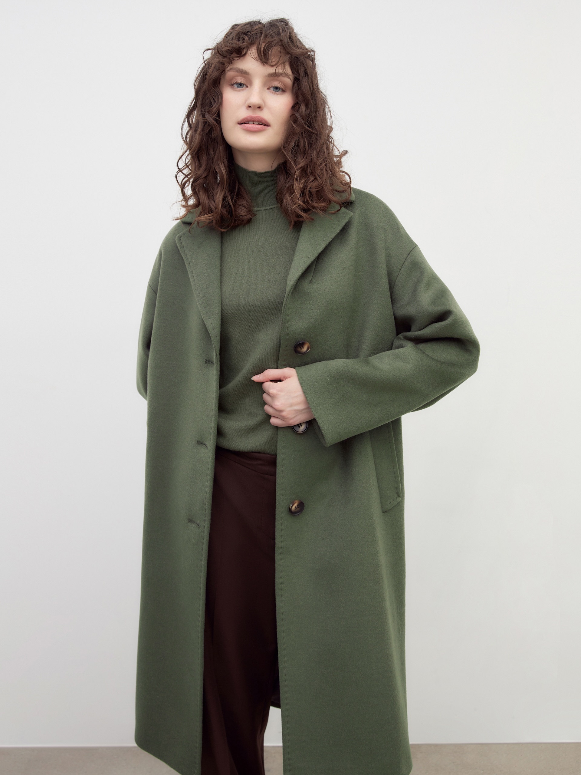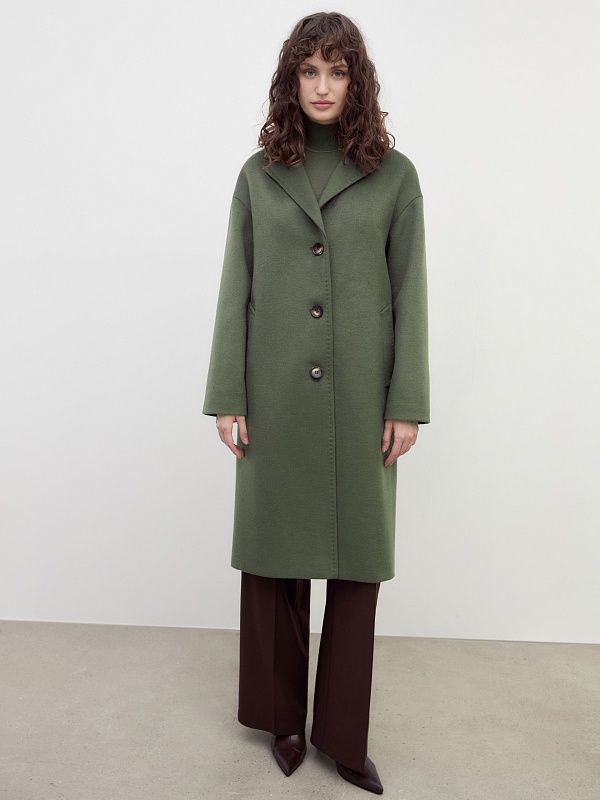 Однобортное пальто прямого силуэта из премиальной пальтовой ткани в благородном цвете хаки. Длина пальто до колена, комфортные и вместительные карманы-листочки, которые при этом не создают дополнительного объема. Классический английский воротник и застежка на ряд роговых пуговиц делают пальто невероятно стильным и комфортным без лишних деталей. Пальто произведено с использованием мембраны RaftPro, которая надежно защитит от ветра. Произведено в Санкт-Петербурге.