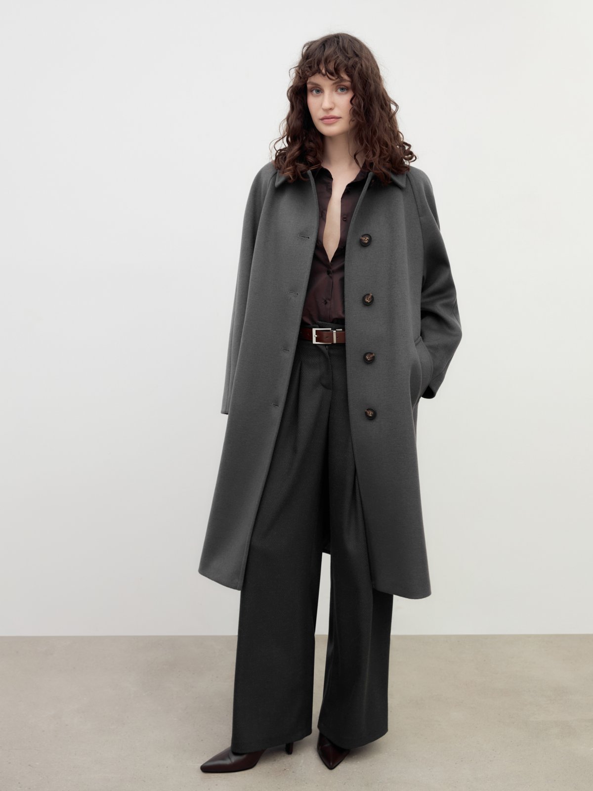 Пальто прямого силуэта из шерстяной ткани благородного серого цвета, длина чуть ниже колена. Классический отложной воротник, что позволяет носить пальто без дополнительных теплых аксессуаров, при этом сохраняя тепло. Комфортный рукав-реглан, застежка на ряд крупных контрастных пуговиц, два глубоких и функциональных кармана с листочками. Пальто выполнено из премиальной ткани с высоким содержанием шерсти и с использованием мембраны RaftPro, которая защитит даже от сильного ветра. Произведено в Санкт-Петербурге.