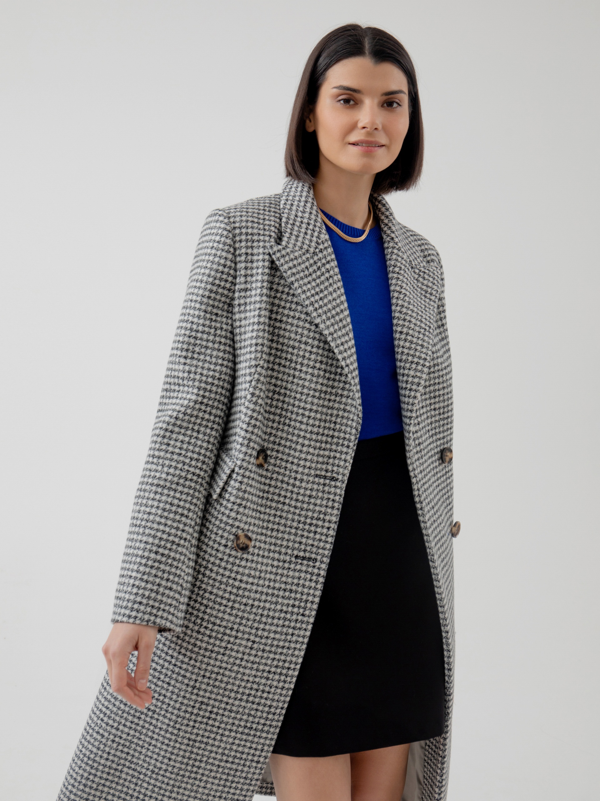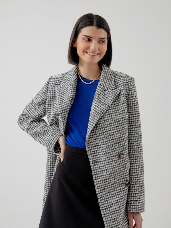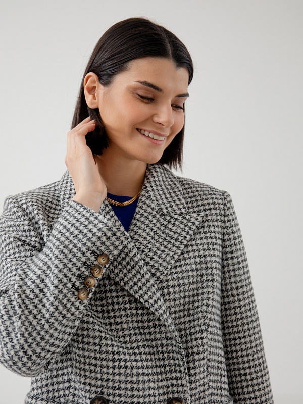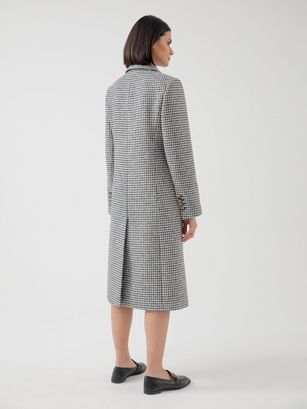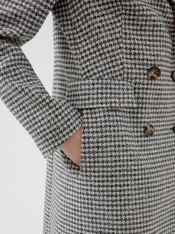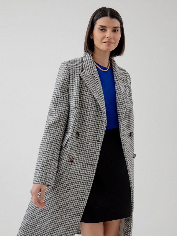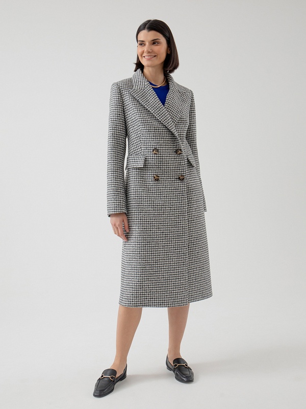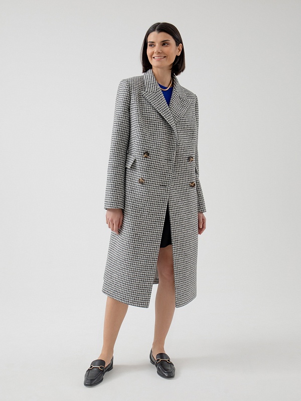 Классическое двубортное пальто полуприлегающего силуэта из премиальной пальтовой ткани в черно-белый "dogtooth". Пальто имеет классический английский воротник, функциональные карманы с клапанами, рельефы в области талии для наилучшей посадки. Пальто очень комфортной длины ниже колена, благодаря чему оно с легкостью впишется как в образ с брюками, так и с платьями. А классический принт "dogtooth" не только является незаменимой классикой, но и будет особенно актуален в этом сезоне. Пальто на подкладке. Произведено в Санкт-Петербурге.