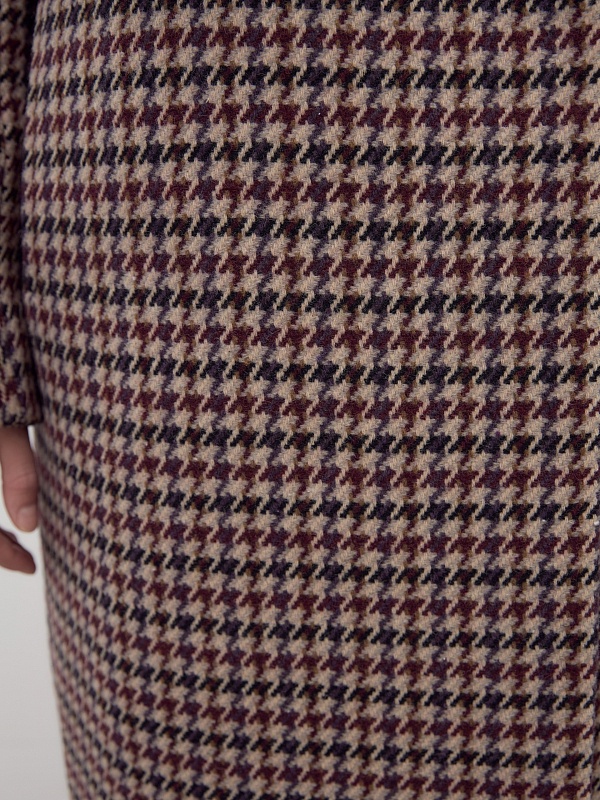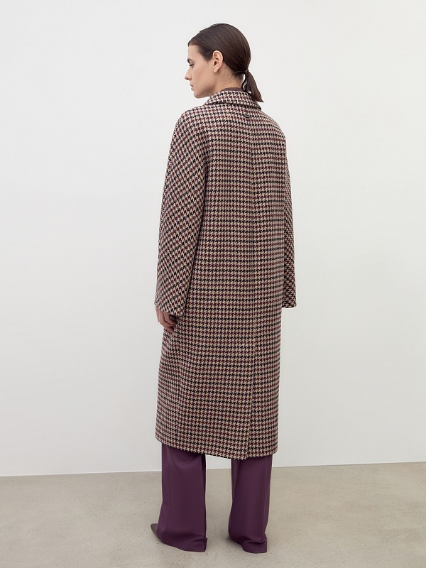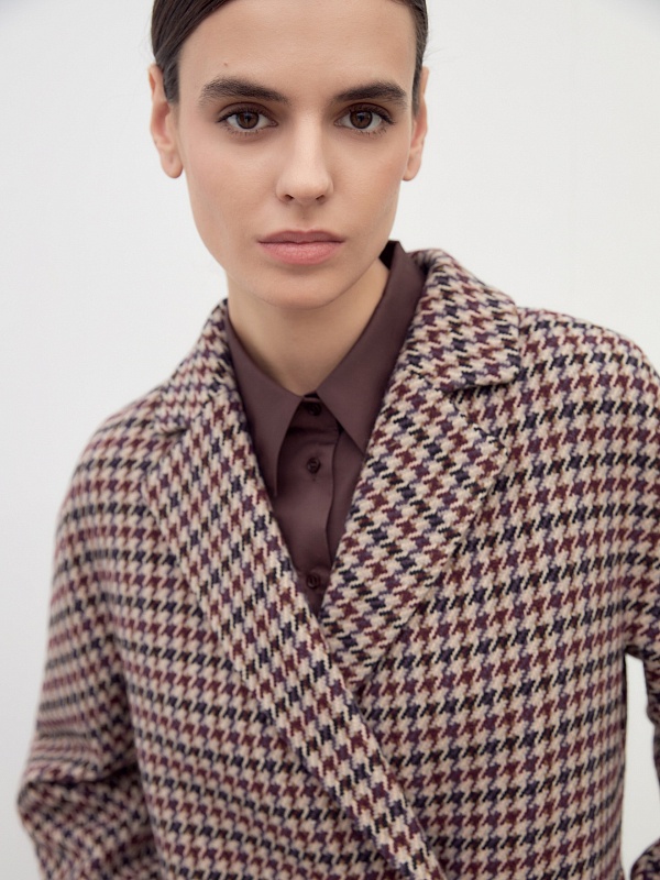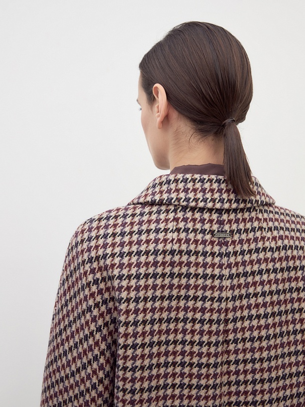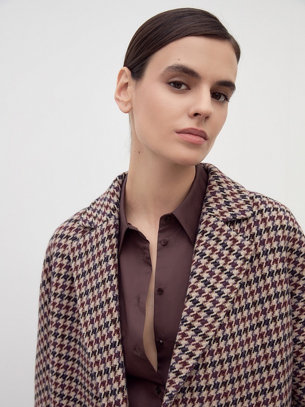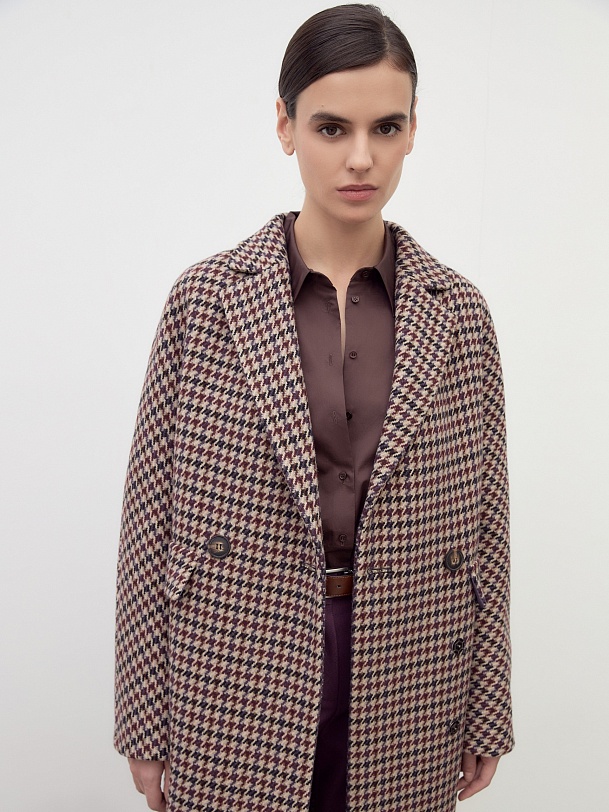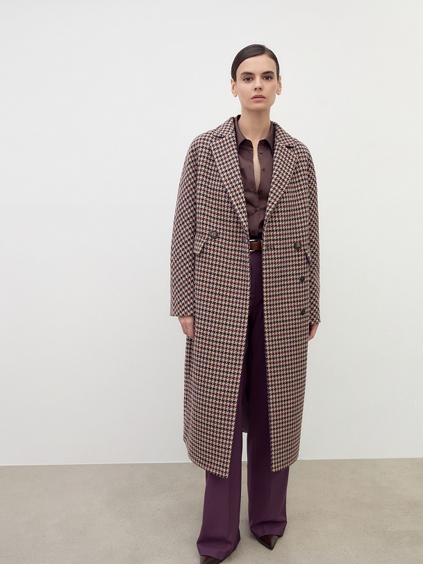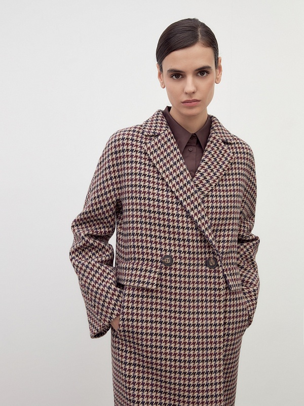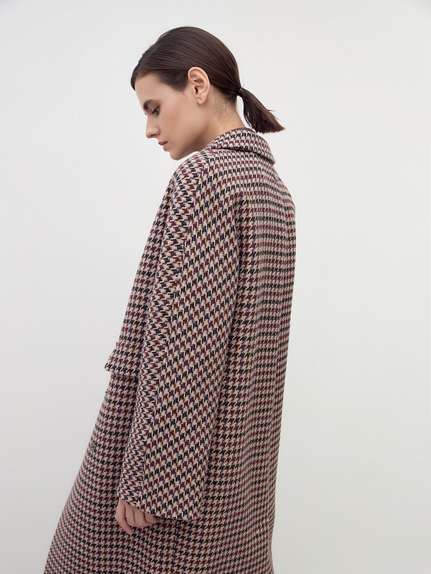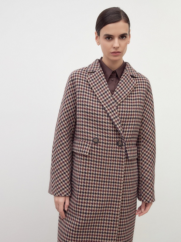 Двубортное пальто силуэта "удлиненный кокон" выполнено из премиальной шерстяной ткани в благородный бежево-чернильный принт "dogtooth". Стильный и комфортный рукав-кимоно позволит носить многослойные образы и при этом не стесняет движений. Рукав имеет широкую подгибку низа, благодаря чему можно подвернуть рукав на необходимую высоту. Пальто застегивается на две круные пуговицы под натуральный рог. Длина пальто миди. Произведено с использованием мембраны RaftPro, которая защитит даже от сильного ветра. Произведено в Санкт-Петербурге.