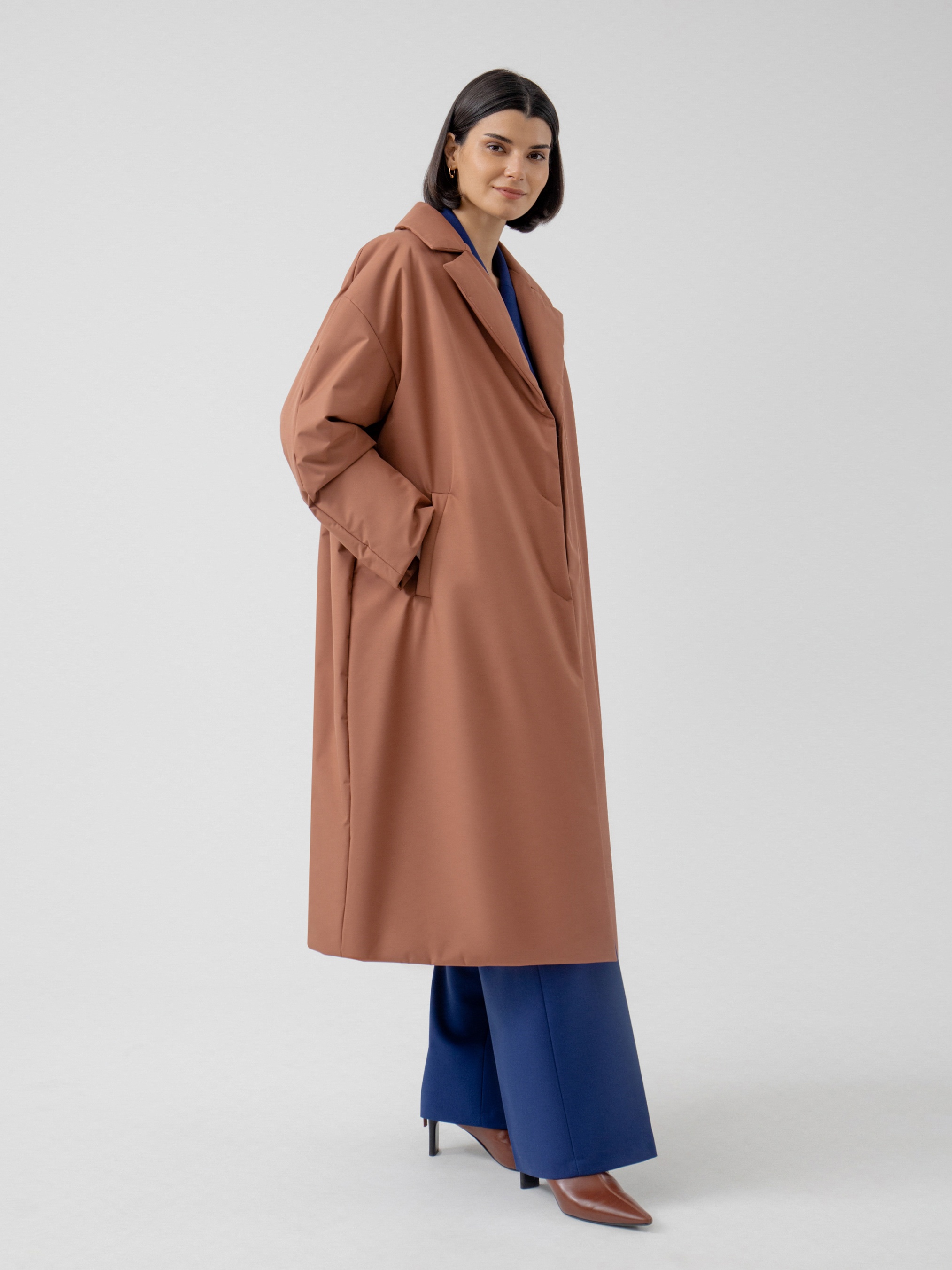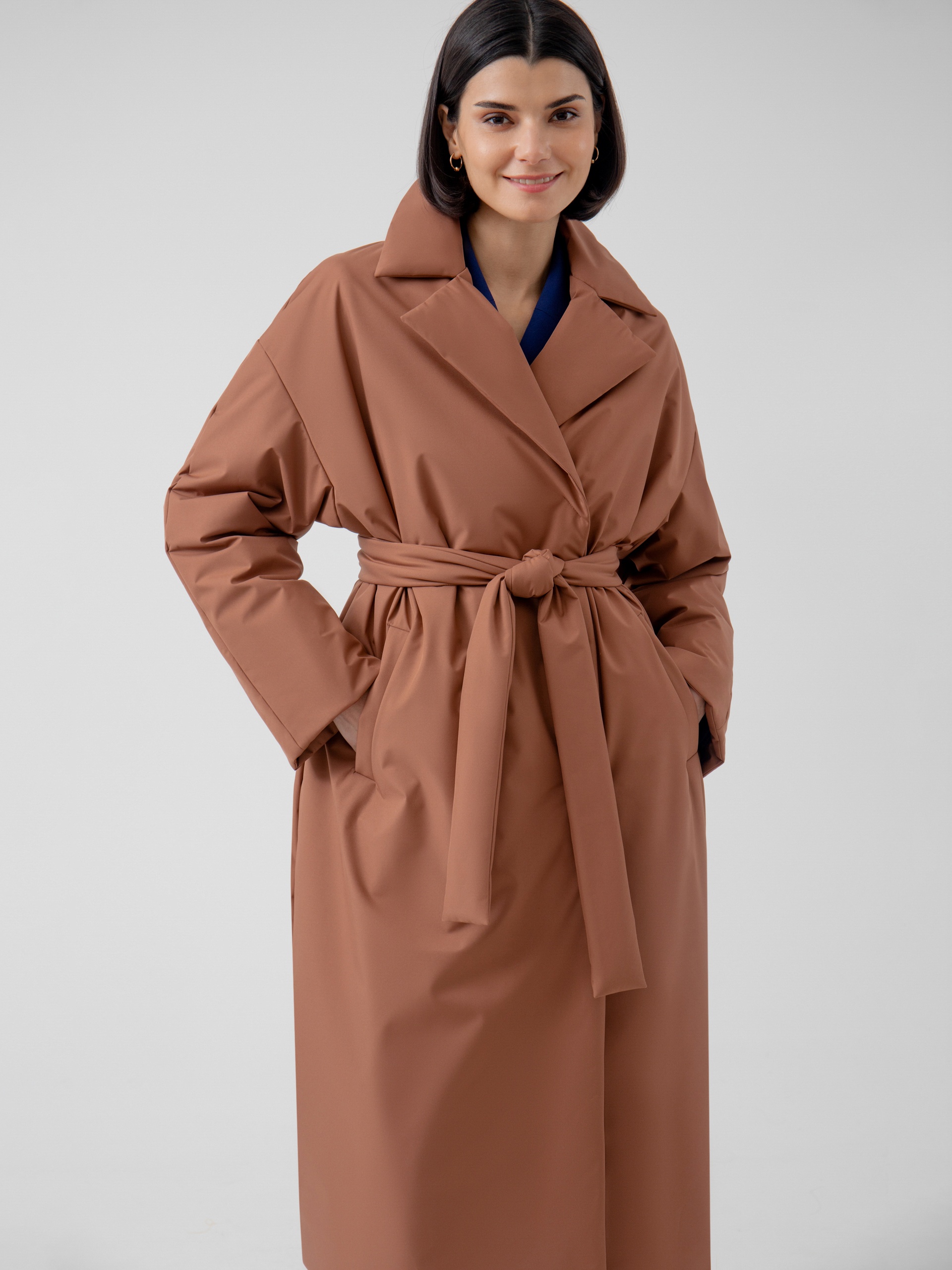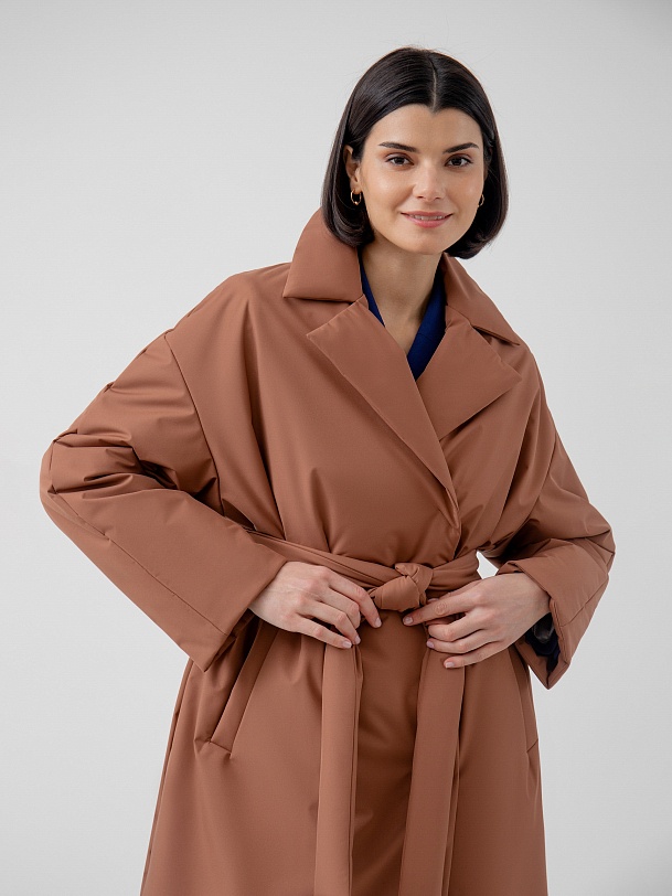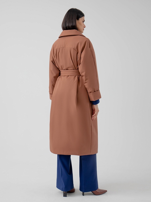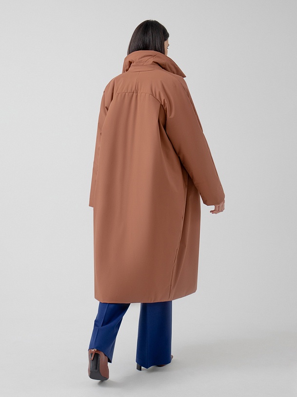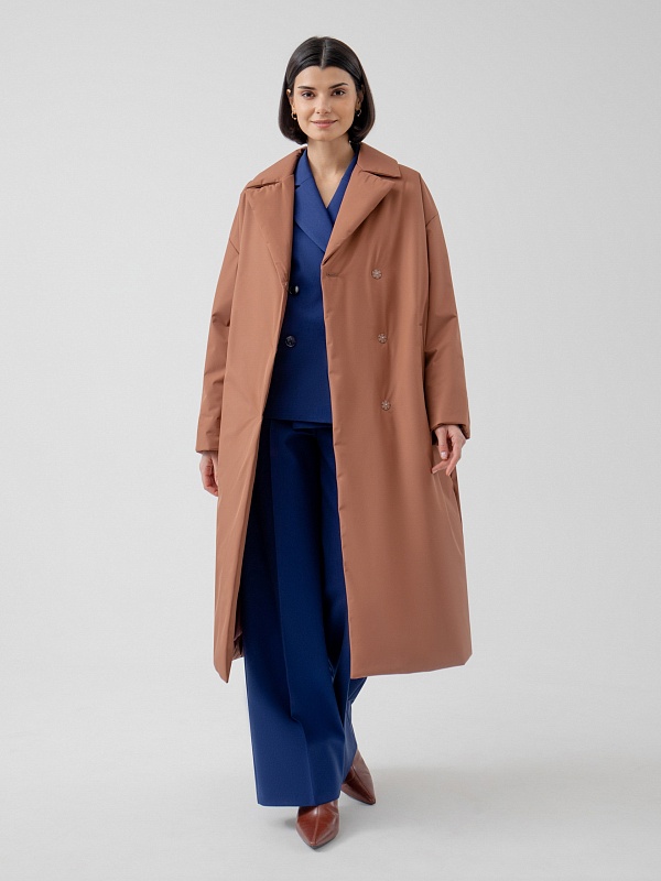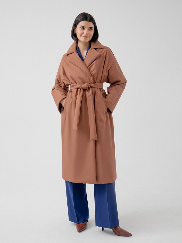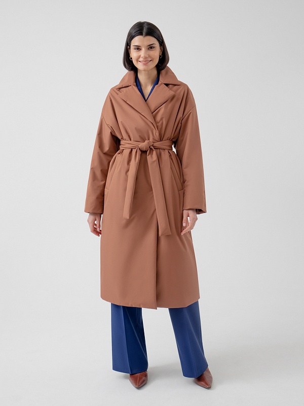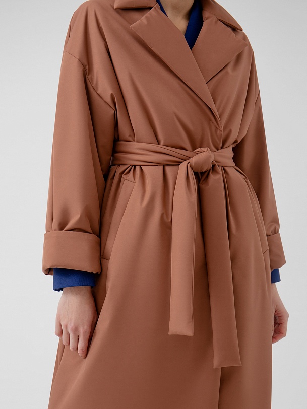 Пальто прямого силуэта из премиальной плащевой ткани. Классический английский воротник, рукав полной длины, спереди рубашечный, сзади реглан, переходящий в декоративную кокетку спинки. По низу рукава отворот, который позволяет легко регулировать длину рукава. Карманы-листочки очень комфортные и глубокие, при этом не создают лишнего объема. Застежка на надежные пришивные кнопки. А в качестве дополнительного декора к пальто прилагается пояс, благодаря которому Вы с легкостью можете изменить силуэт на более женственный. Длина пальто ниже колена. Выполнено из плащевой ткани терракотового цвета с мембранным покрытием, надежно защищающим от ветра. Произведено в Санкт-Петербурге.