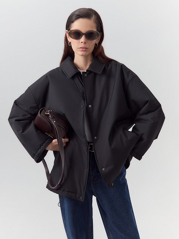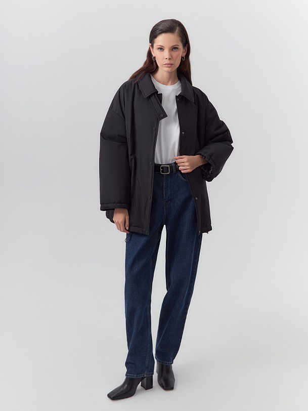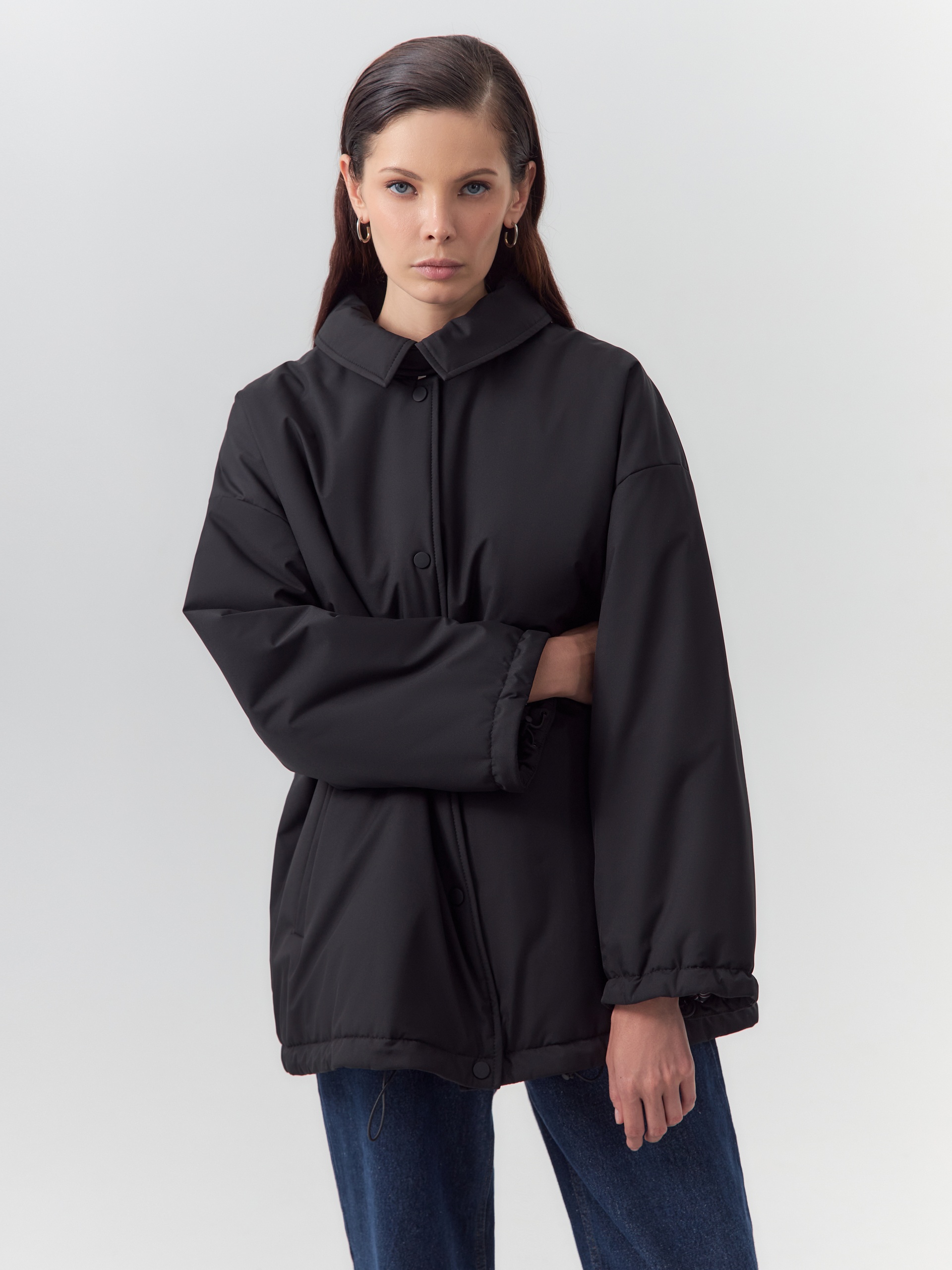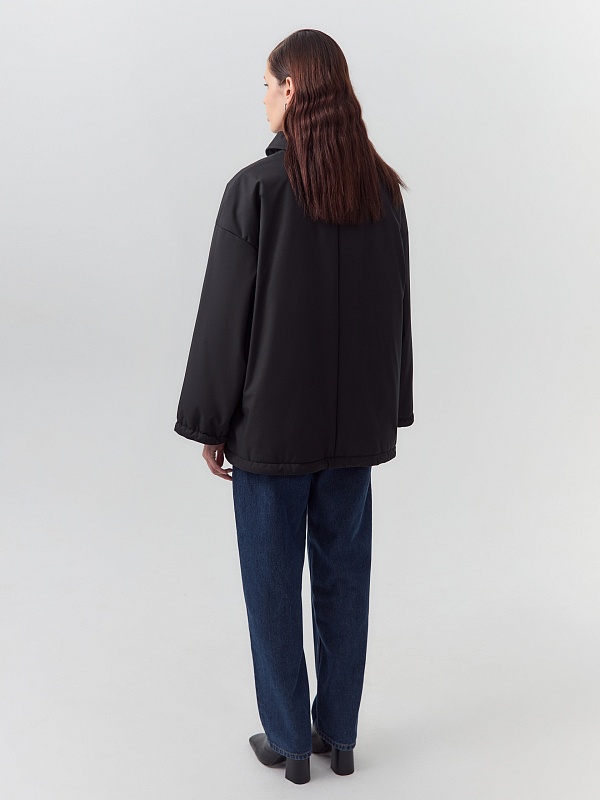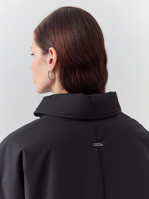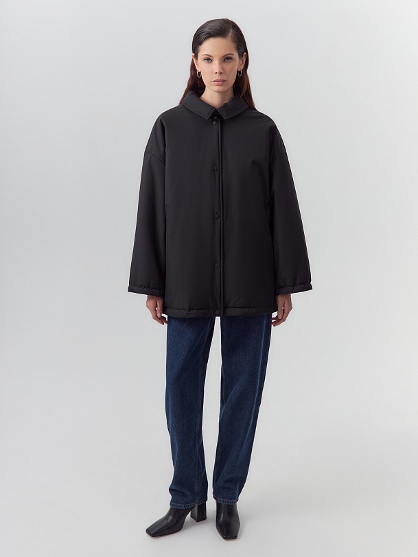 Однобортная объемная куртка из черной плащевой ткани длиной до середины бедра. Куртка выполнена из высокотехнологичной плащевой ткани с мембранным покрытием и на утеплителе, надежно защищающими от холода, ветра и влаги. Объемный оверсайз силуэт отвечает за дополнительный комфорт, а глубокие карманы и резинки по низу изделия и рукава делают модель практичнее и еще теплее. Для дополнительной защиты от непогоды под воротником располагается пата с застежкой на кнопки, которая надежно фиксирует воротник. Застегивается куртка на ряд надежных установочных кнопок. Произведено в Санкт-Петербурге.