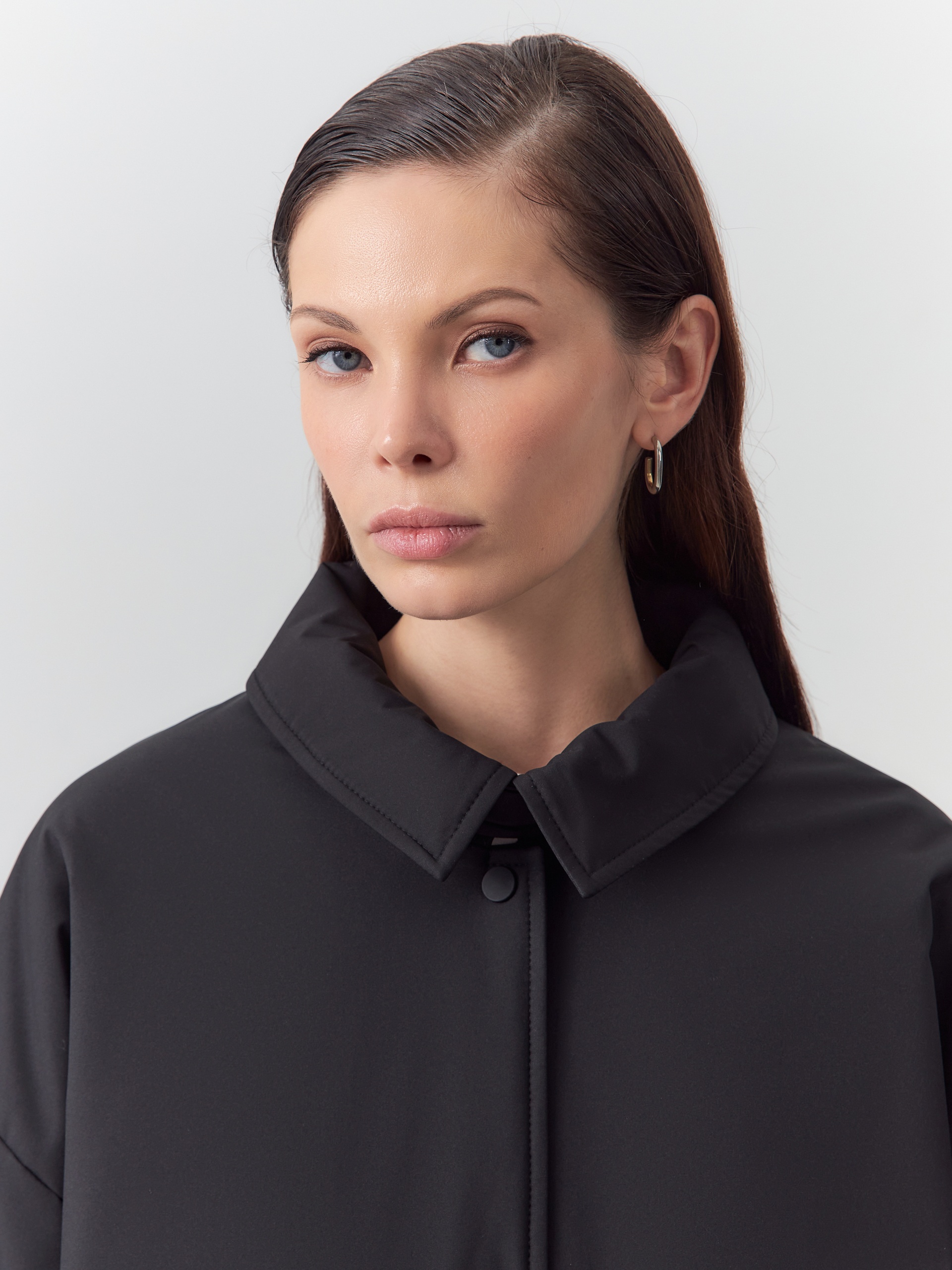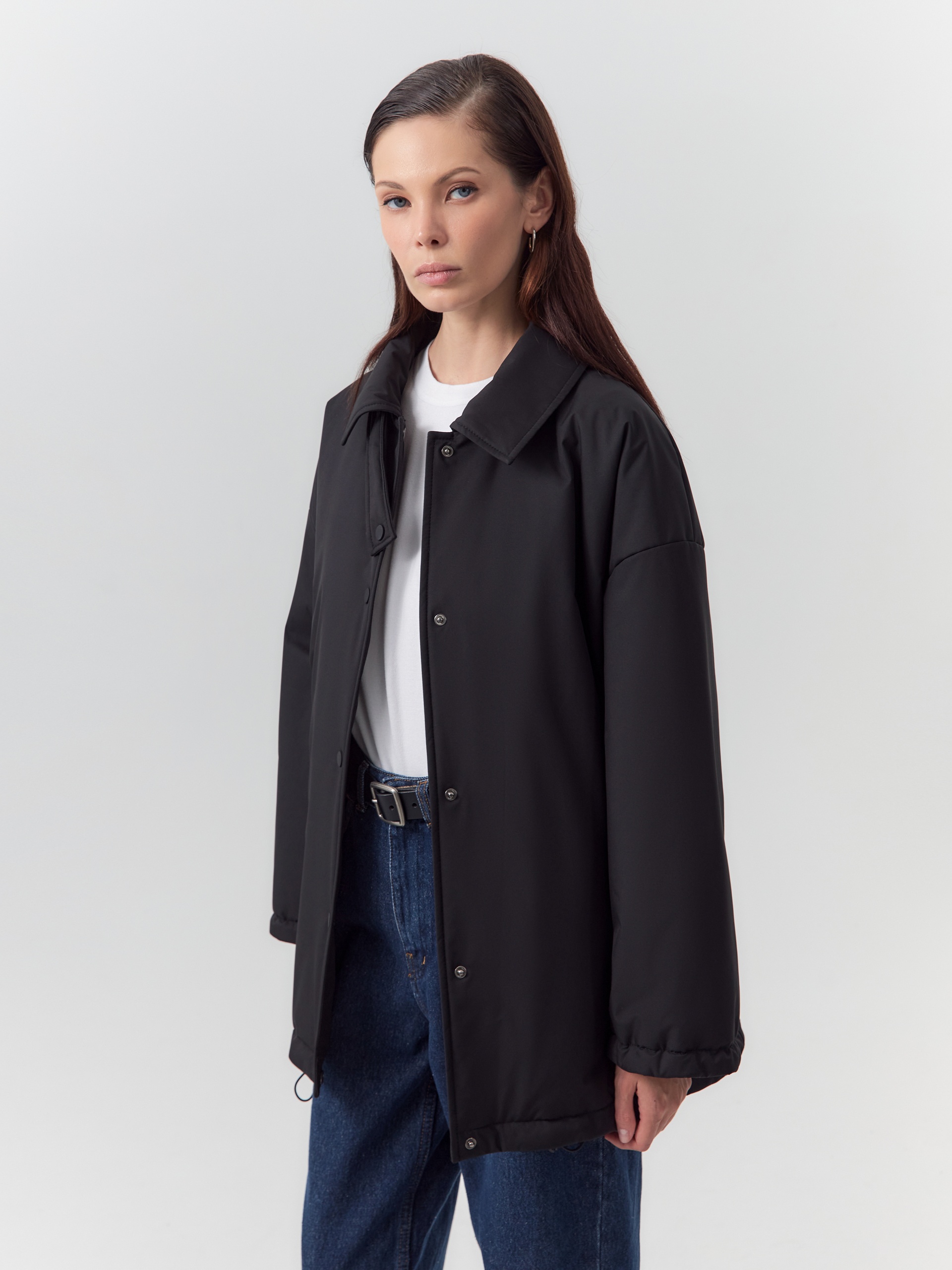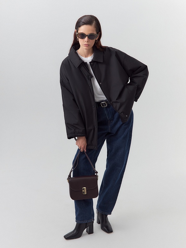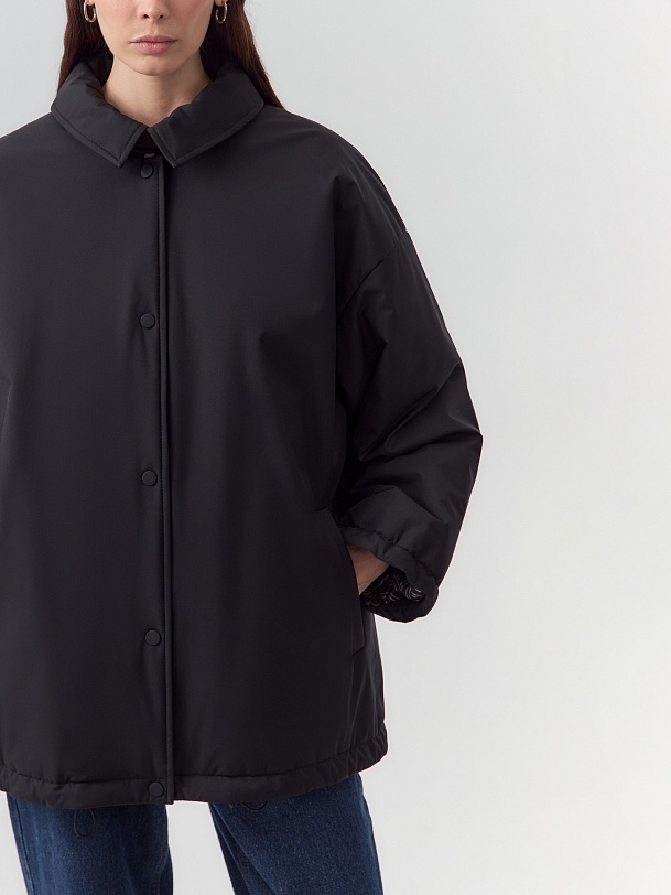 Однобортная объемная куртка из черной плащевой ткани длиной до середины бедра. Куртка выполнена из высокотехнологичной плащевой ткани с мембранным покрытием и на утеплителе, надежно защищающими от холода, ветра и влаги. Объемный оверсайз силуэт отвечает за дополнительный комфорт, а глубокие карманы и резинки по низу изделия и рукава делают модель практичнее и еще теплее. Для дополнительной защиты от непогоды под воротником располагается пата с застежкой на кнопки, которая надежно фиксирует воротник. Застегивается куртка на ряд надежных установочных кнопок. Произведено в Санкт-Петербурге.