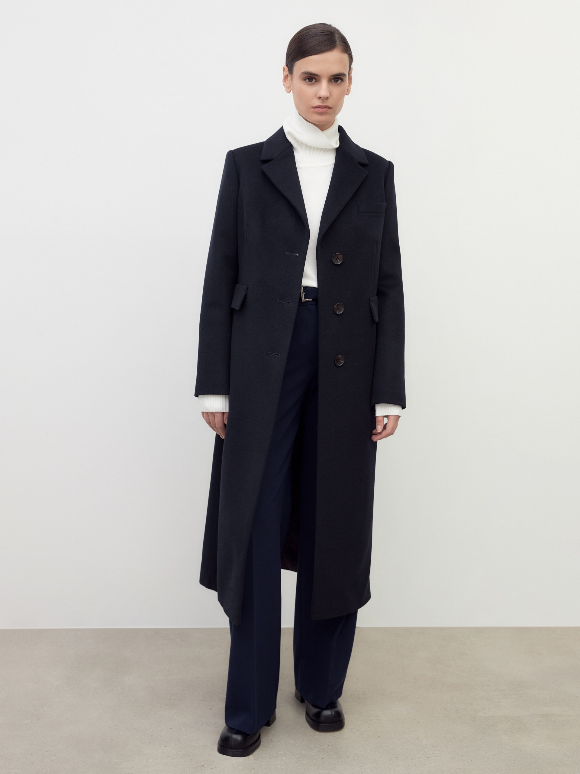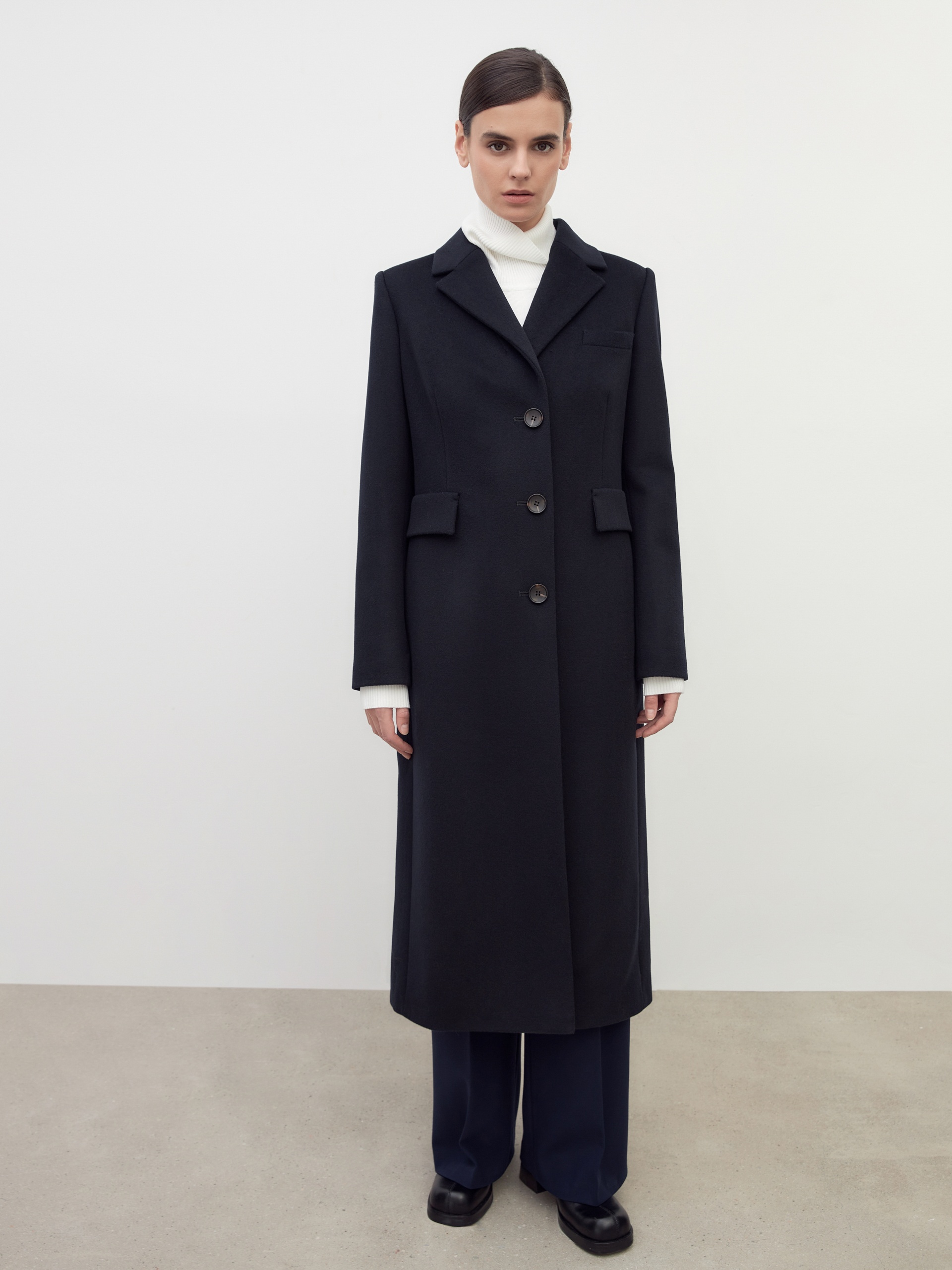 Классическое однобортное пальто из премиальной шерстяной ткани темно-синего цвета. Пальто с английским воротником, втачным рукавом, правильная посадка которого делает плечи зрительно уже, а силуэт женственнее и элегантнее. Пальто имеет два вместительных кармана с клапанами и застегивается на ряд стильных крупных пуговиц под натуральный рог, что обращает внимание к деталям. Пальто выполнено с использованием мембраны RaftPro, которая надежно защитит от ветра и холода. Произведено в Санкт-Петербурге.