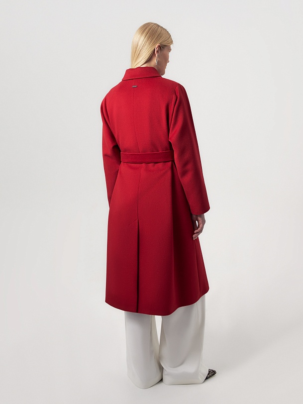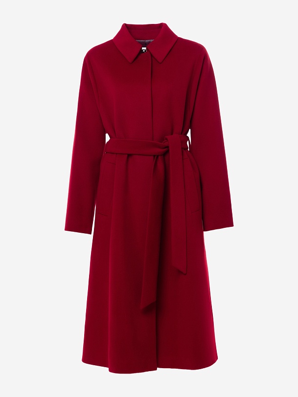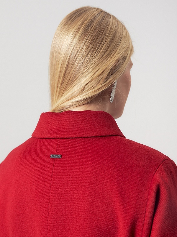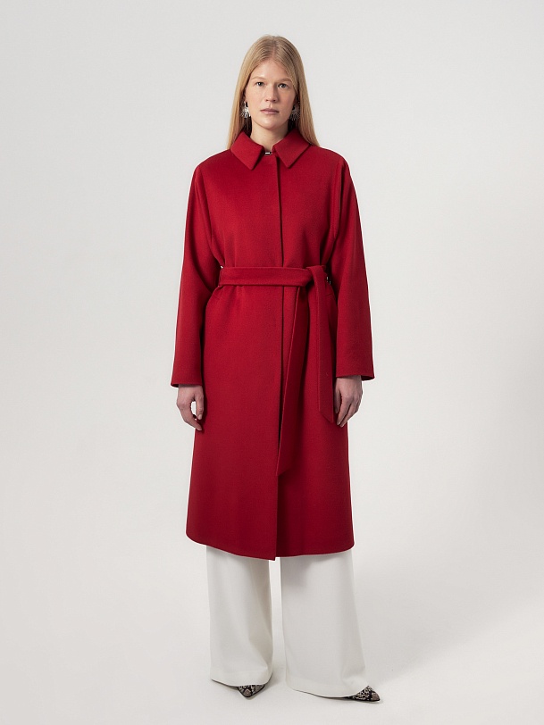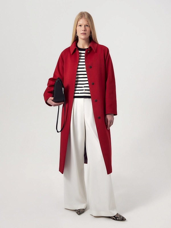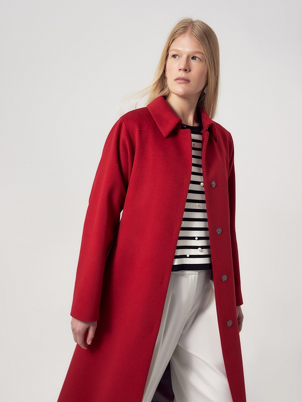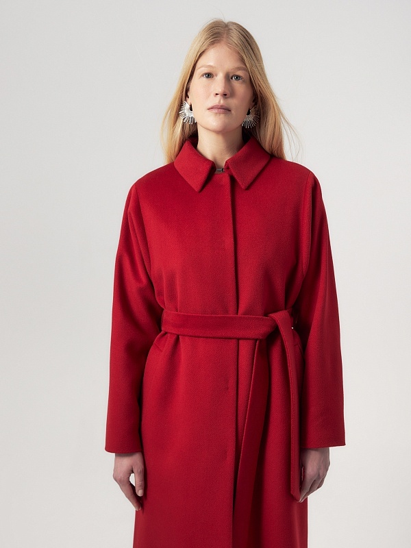 Пальто трапециевидного силуэта из шерстяной ткани в классическом красном цвете. Аккуратный отложной воротник с застежкой на крючок защитит зону декольте от ветра без использования дополнительных теплых аксессуаров. Отрезной рукав-кимоно как новое виденье классического отрезного рукава, при этом рукав остается очень комфортным и не стесняет движений. Низ рукава обработан манжетой. Застежка на ряд пришивных кнопок. В комплекте к пальто идет съемный пояс, который с легкостью подчеркнет силуэт и сделает образ более женственным. Пальто выполнено с использованием мембраны RaftPro, которая надежно защитит от ветра и холода. Произведено в Санкт-Петербурге.