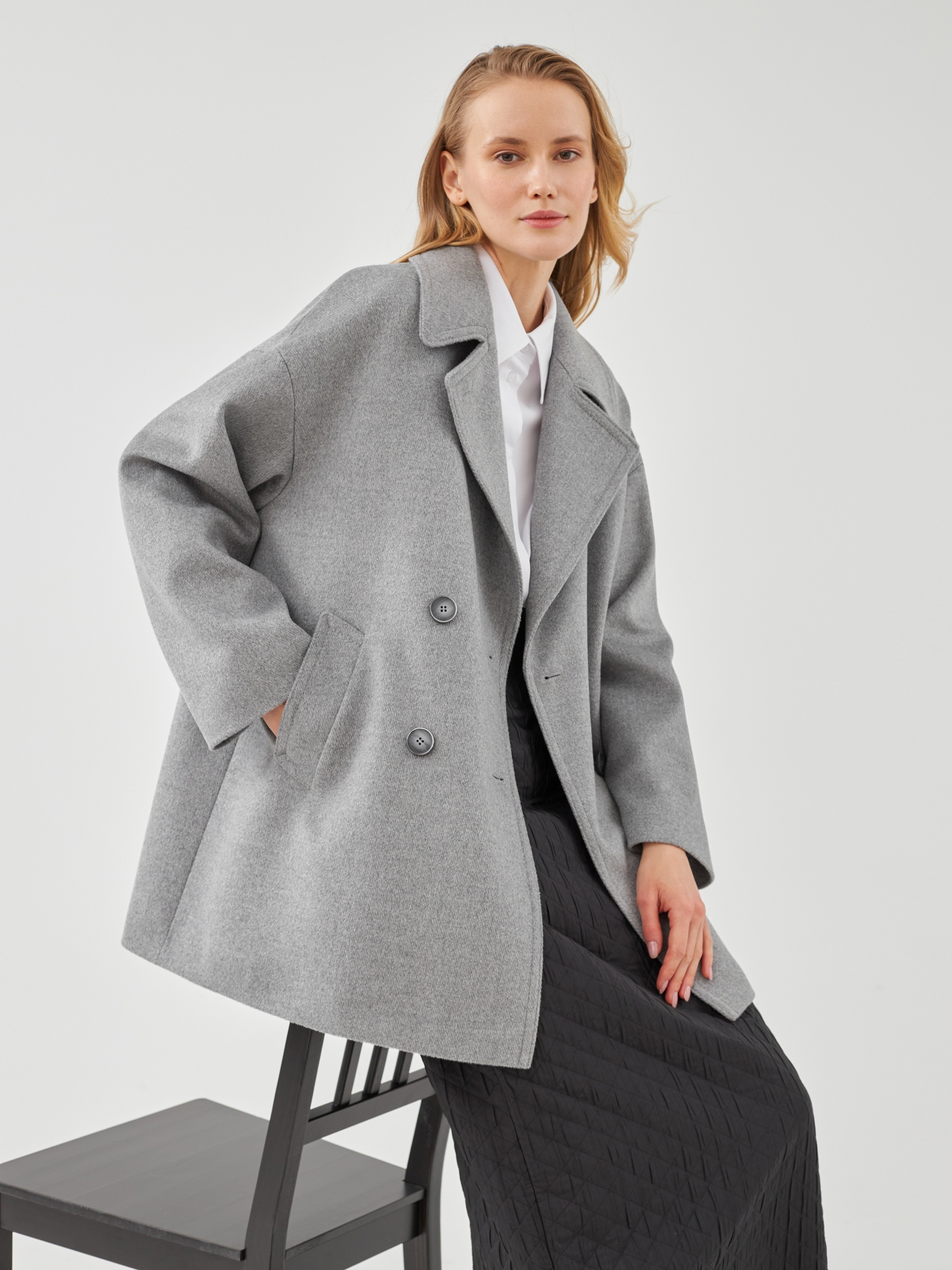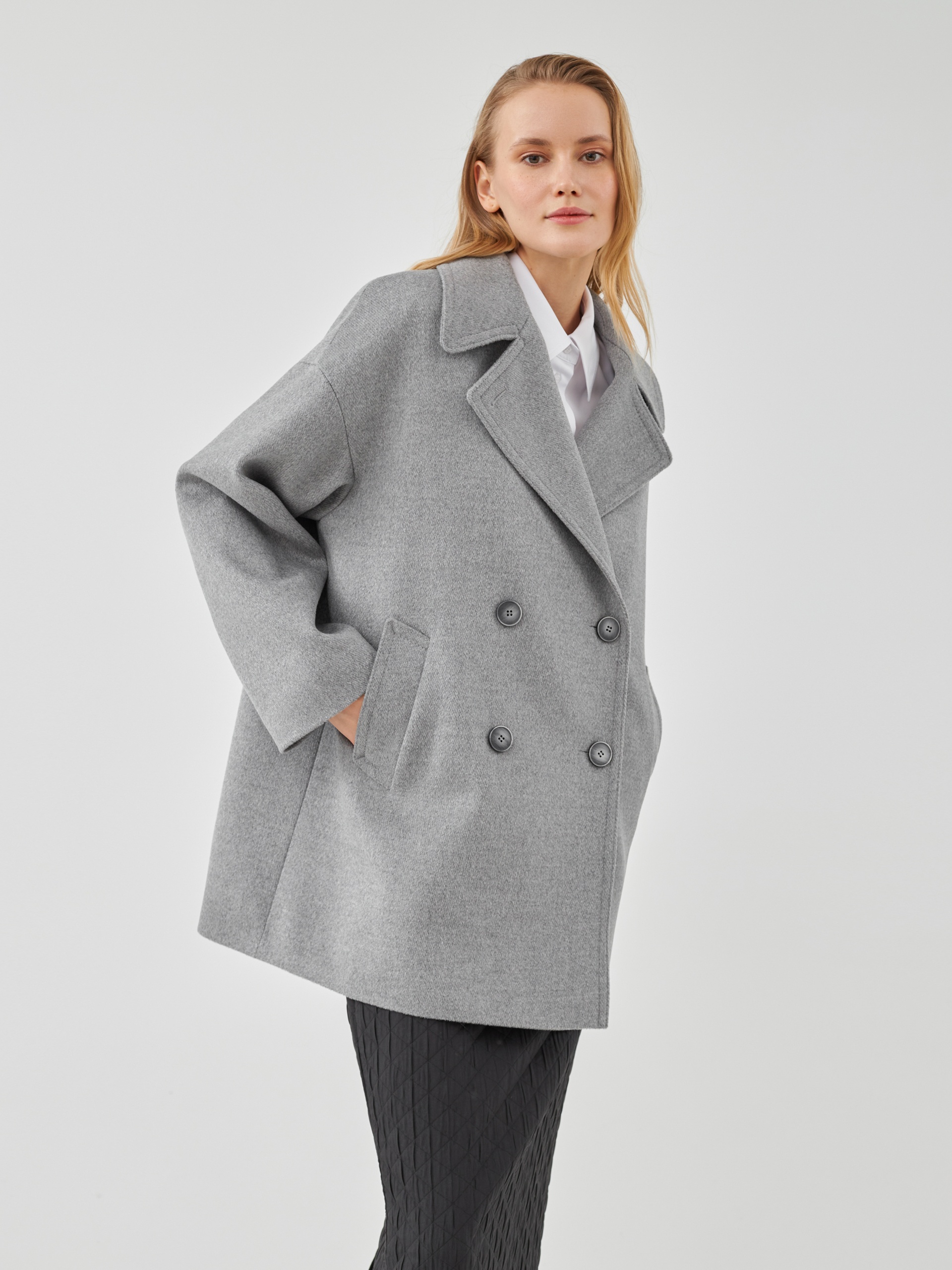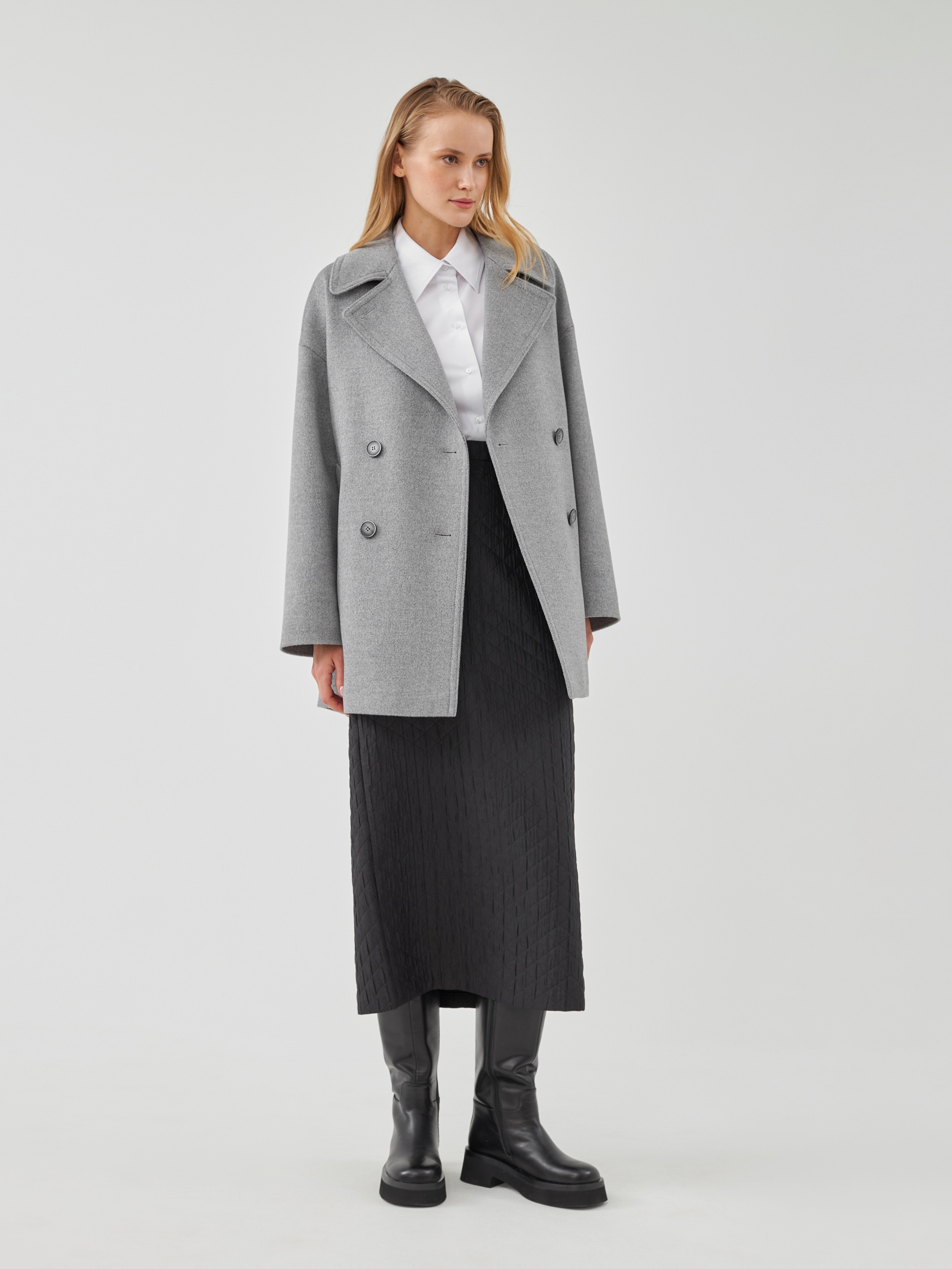 Двубортное полупальто из премиальной шерстяной ткани классического серого цвета с эффектом диагональ. Пальто имеет минимум деталей, английский воротник и комфортный рубашечный рукав, благодаря чему выглядит изысканно и благородно. Длина пальто до середины бедра, что расширяет возможности для формирования образов. Изделие декорировано отделочными строчками, застегивается на два ряда стильных пуговиц. Произведено в Санкт-Петербурге.