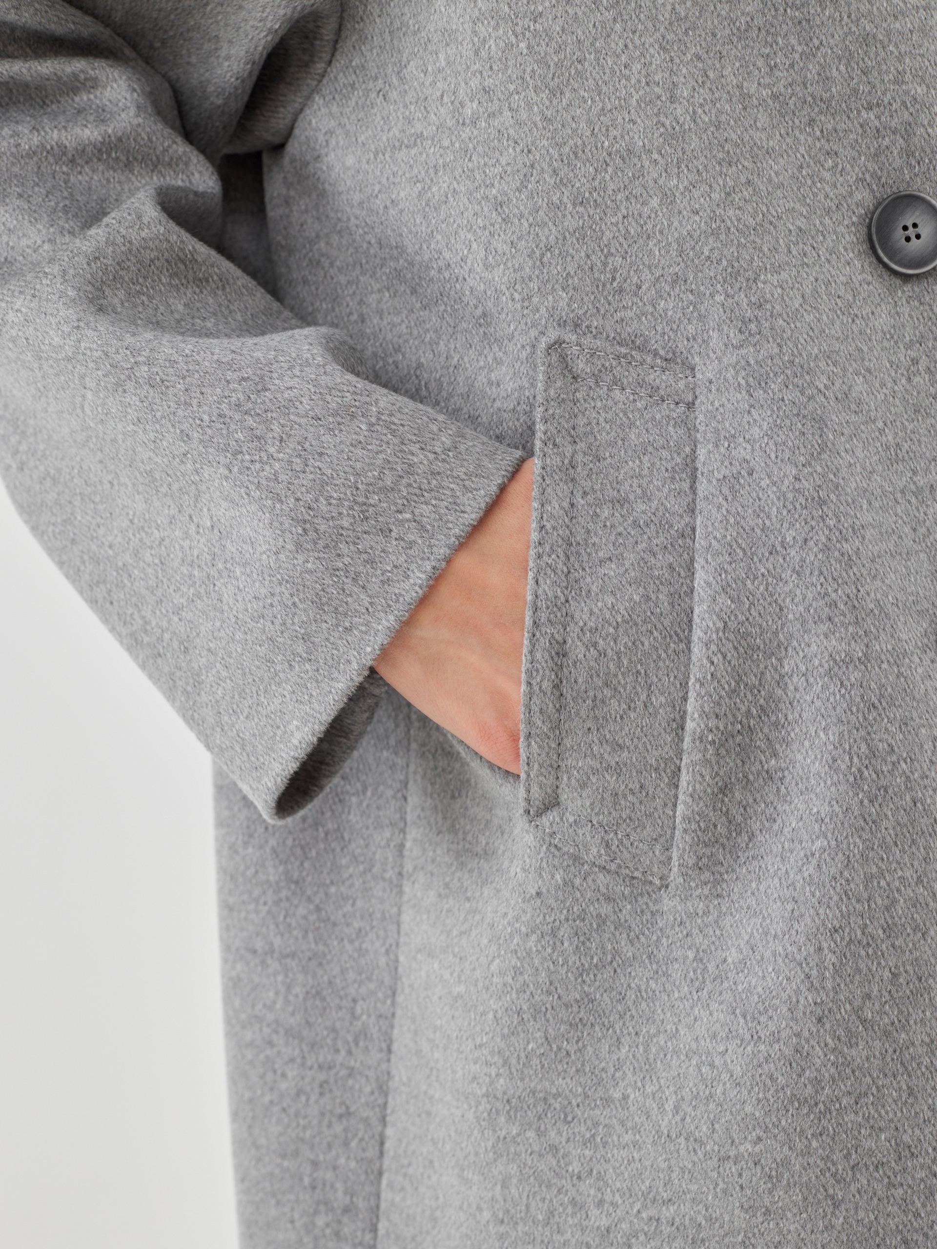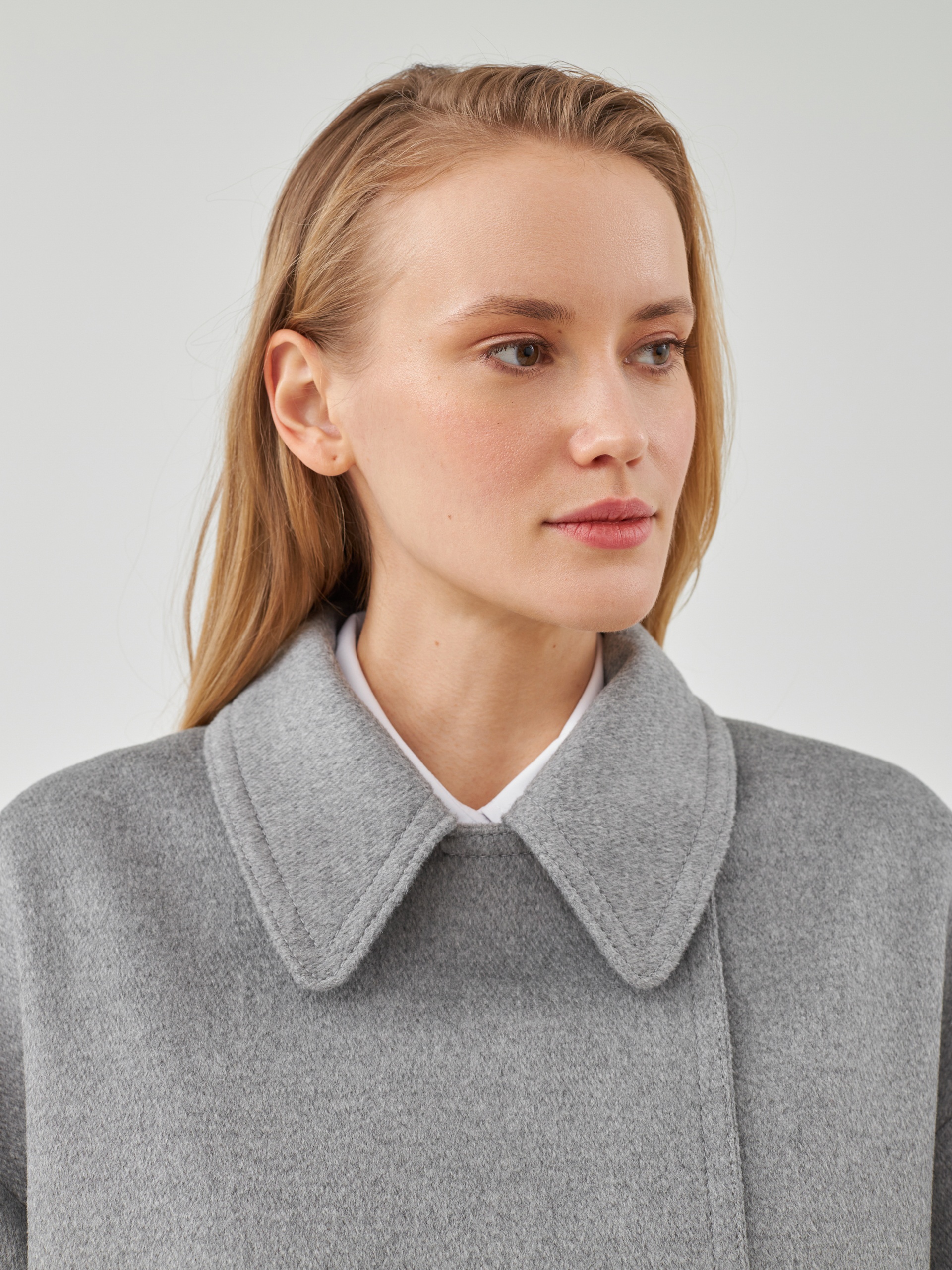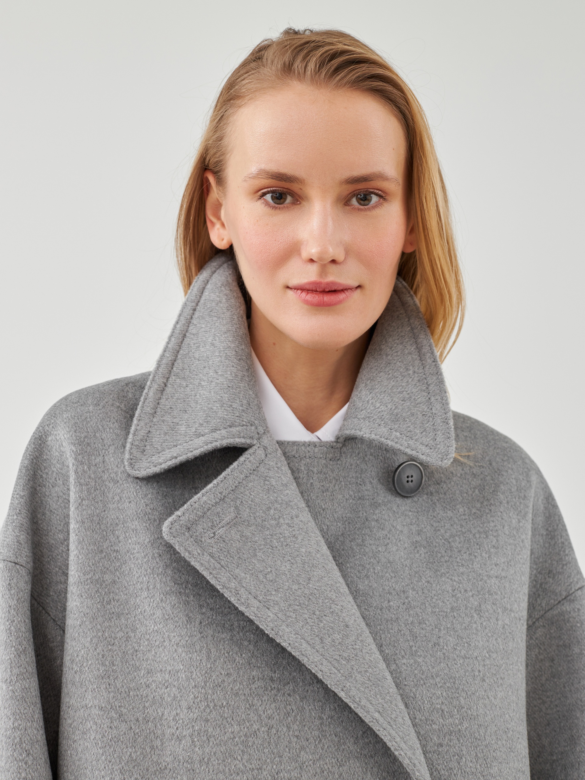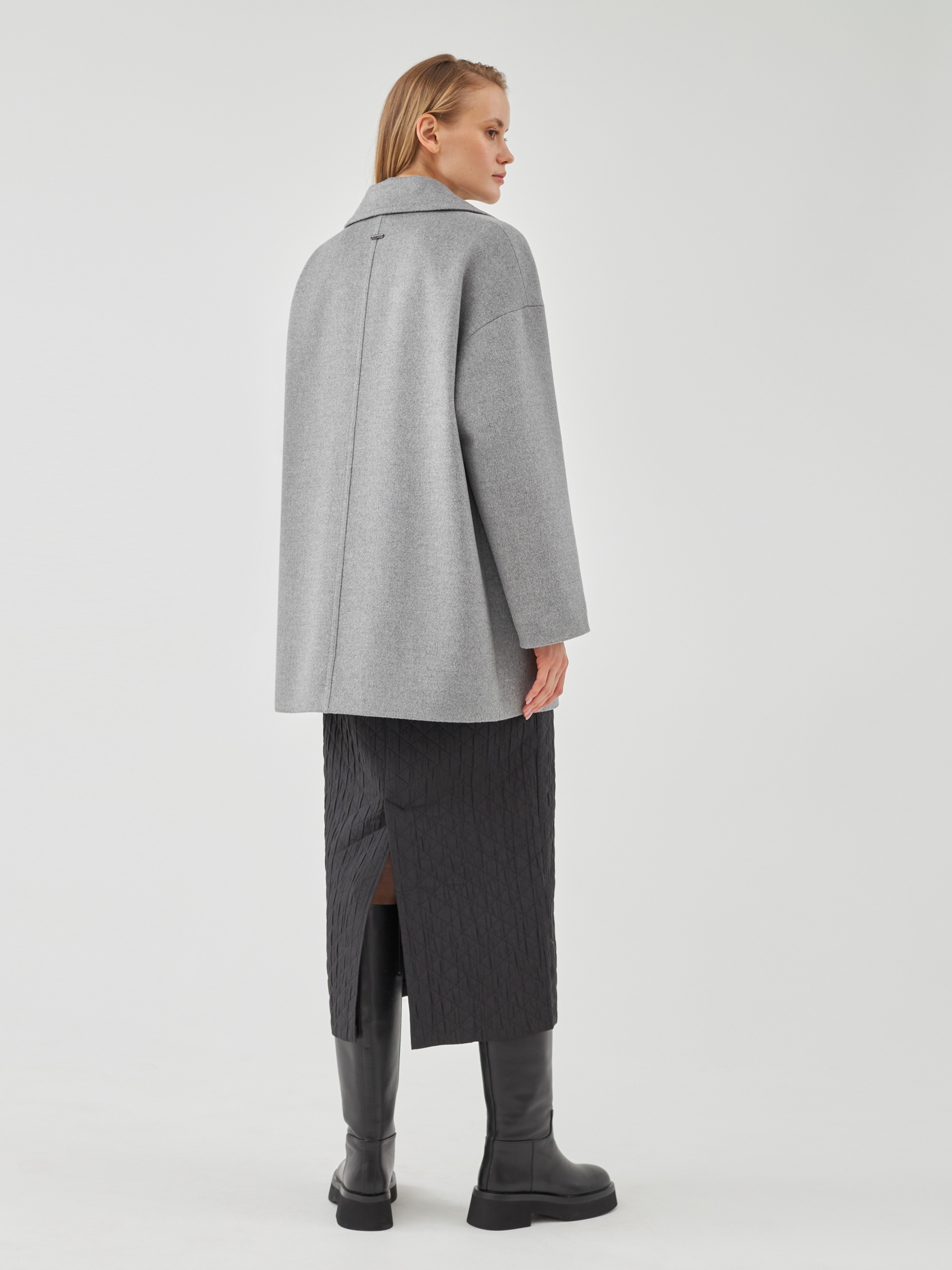 Двубортное полупальто из премиальной шерстяной ткани классического серого цвета с эффектом диагональ. Пальто имеет минимум деталей, английский воротник и комфортный рубашечный рукав, благодаря чему выглядит изысканно и благородно. Длина пальто до середины бедра, что расширяет возможности для формирования образов. Изделие декорировано отделочными строчками, застегивается на два ряда стильных пуговиц. Произведено в Санкт-Петербурге.