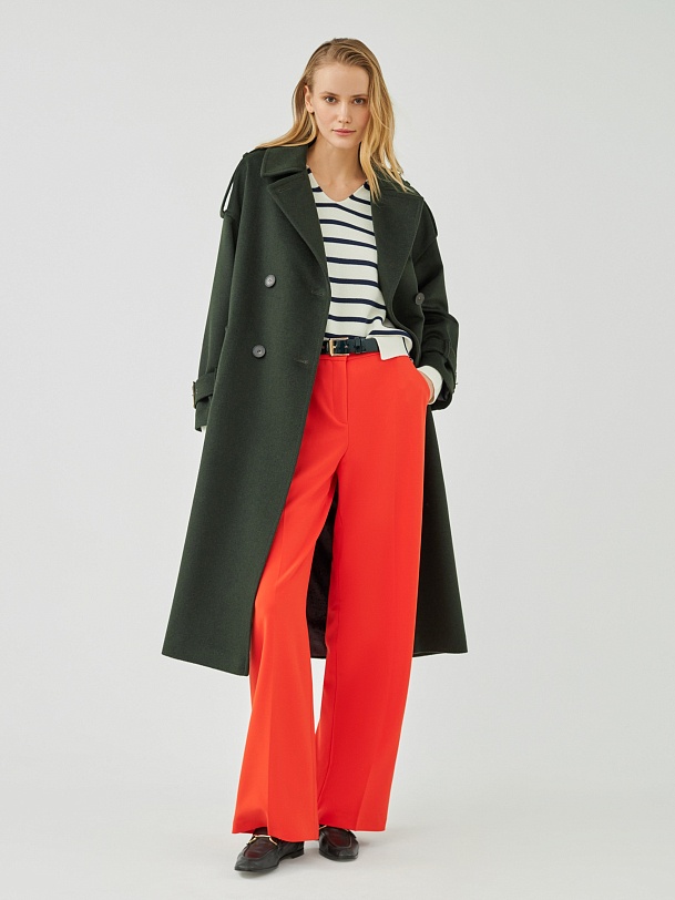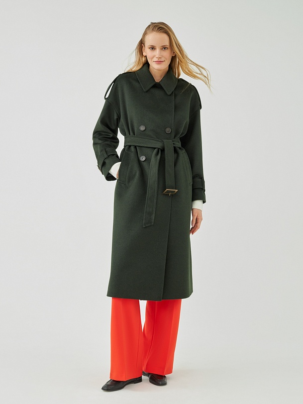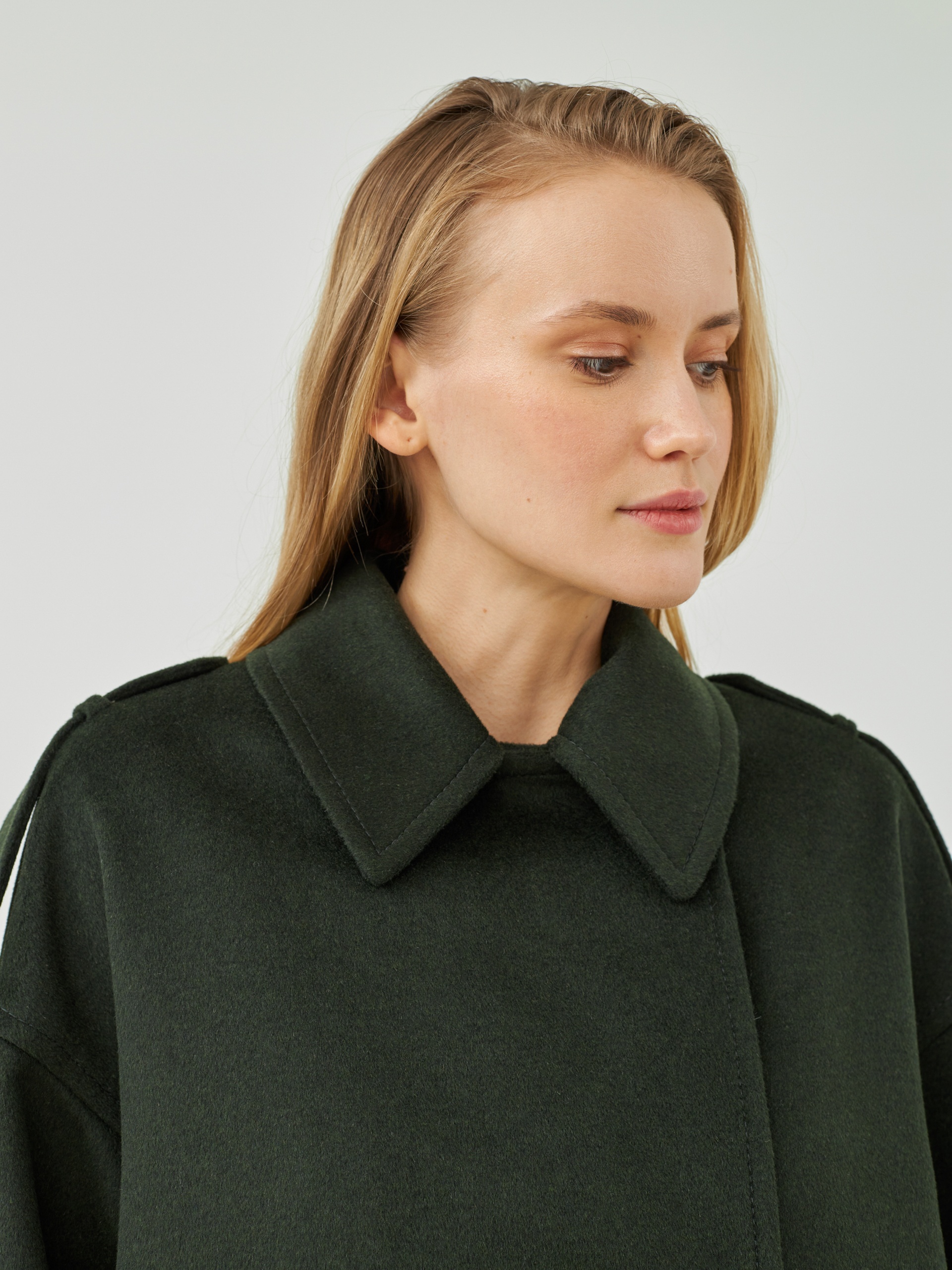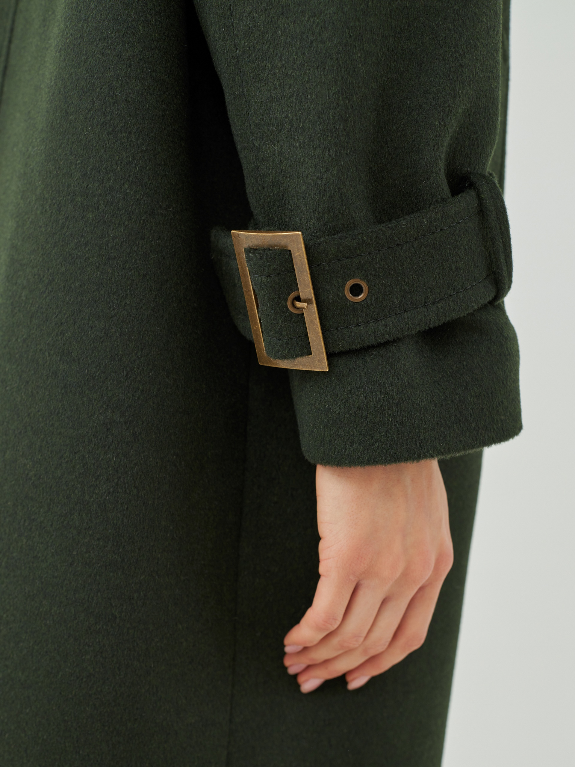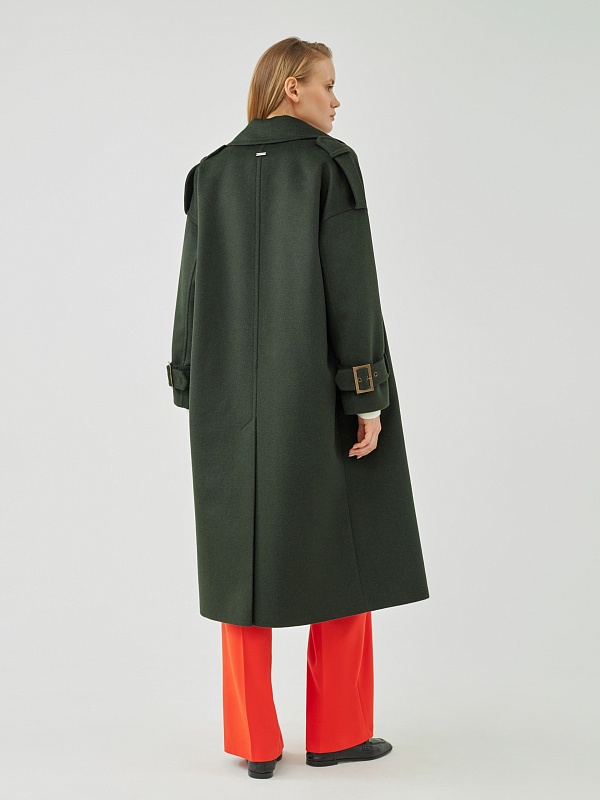 Двубортное пальто прямого силуэта из премиальной шерстяной ткани глубокого темно-зеленого цвета. Пальто имеет длину ниже колена, комфортный рубашечный рукав, классический анлийский воротник. В качестве декоративных элементов пальто имеет погоны, пояс и паты по низу рукава с характерными для образа металлическими пряжками. Застегивается пальто на два ряда крупных пуговиц. Произведено в Санкт-Петербурге.