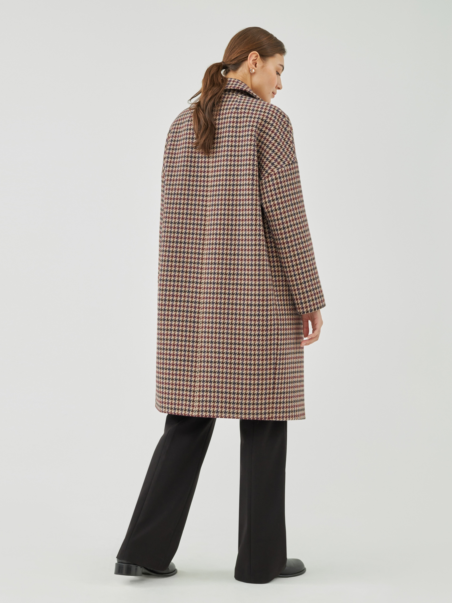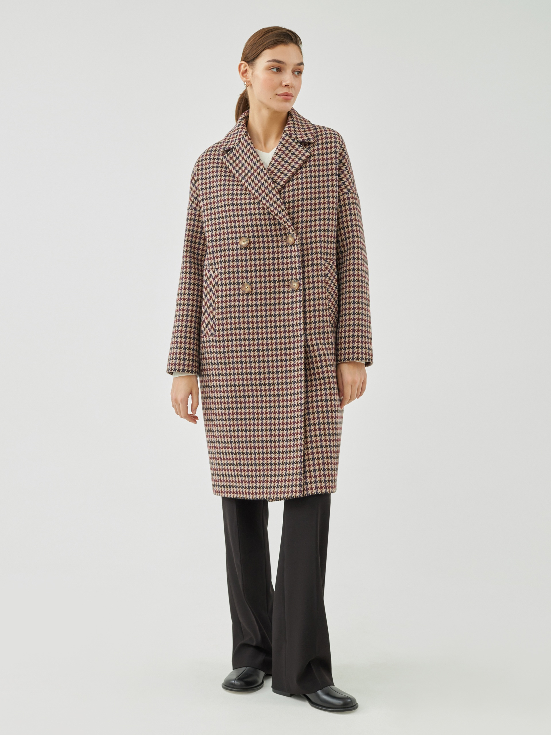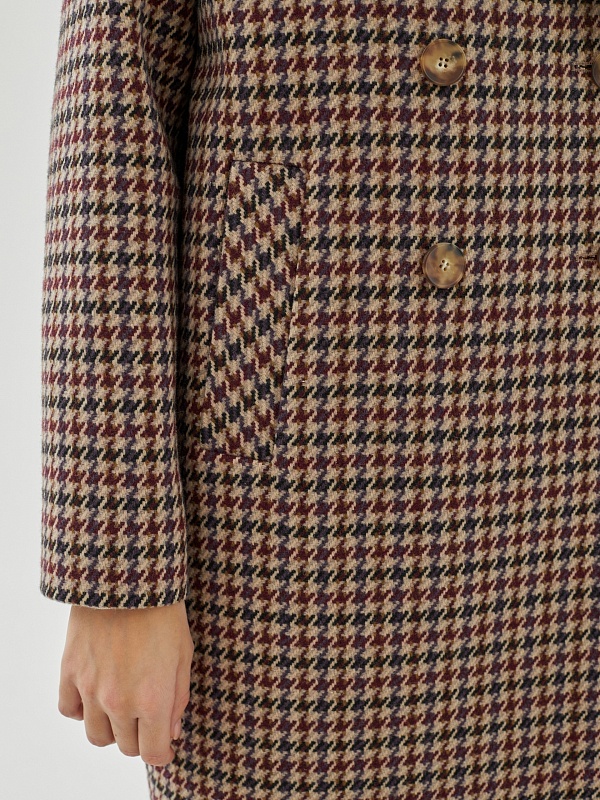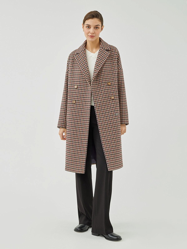 Двубортное пальто прямого силуэта из шерстяной ткани с принтом пье-де-пуль. Английский воротник, комфортный спущенный рукав и оптимальная длина, закрывающая колено, будут не только очень удобны при использовании, но и долго не выйдут из моды. А модный бежево-чернильный цвет добавит весеннего настроения и поможет создать неповторимый образ. Застегивается пальто на ряд стильных крупных пуговиц под натуральный рог. Пальто выполнено с использованием мембраны RaftPro, которая надежно защищает от холода и ветра. Произведено в Санкт-Петербурге.