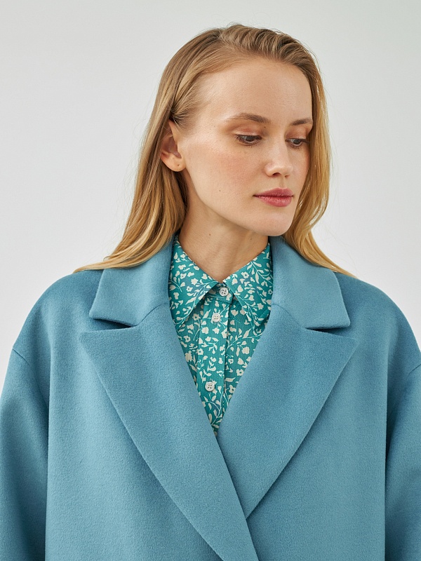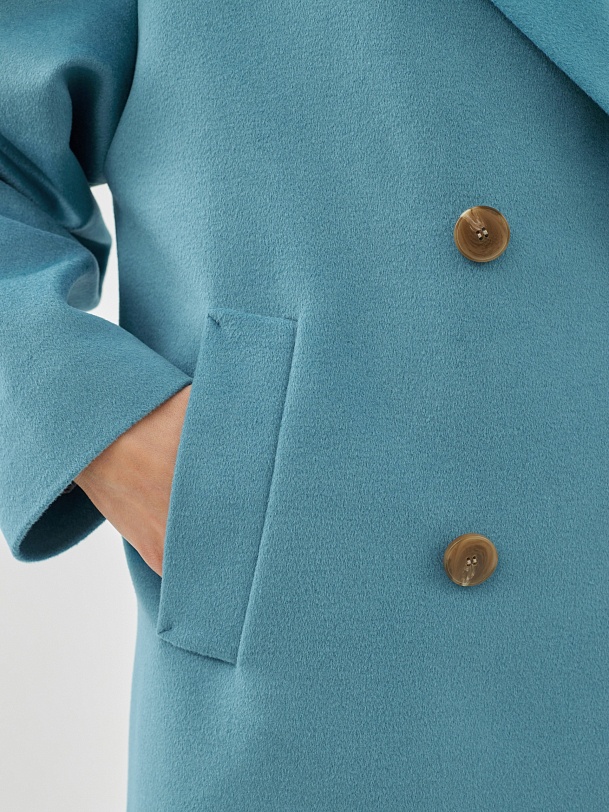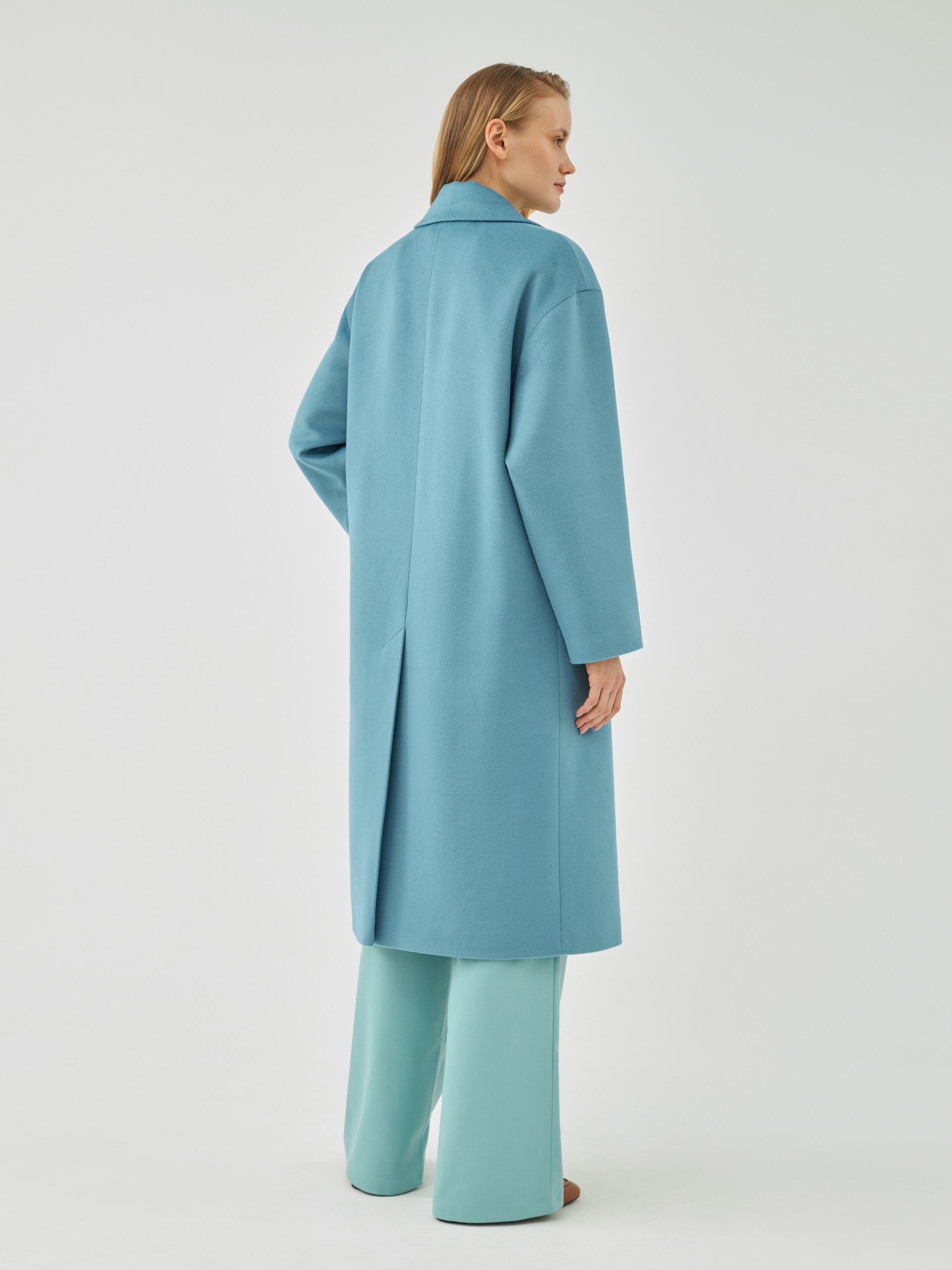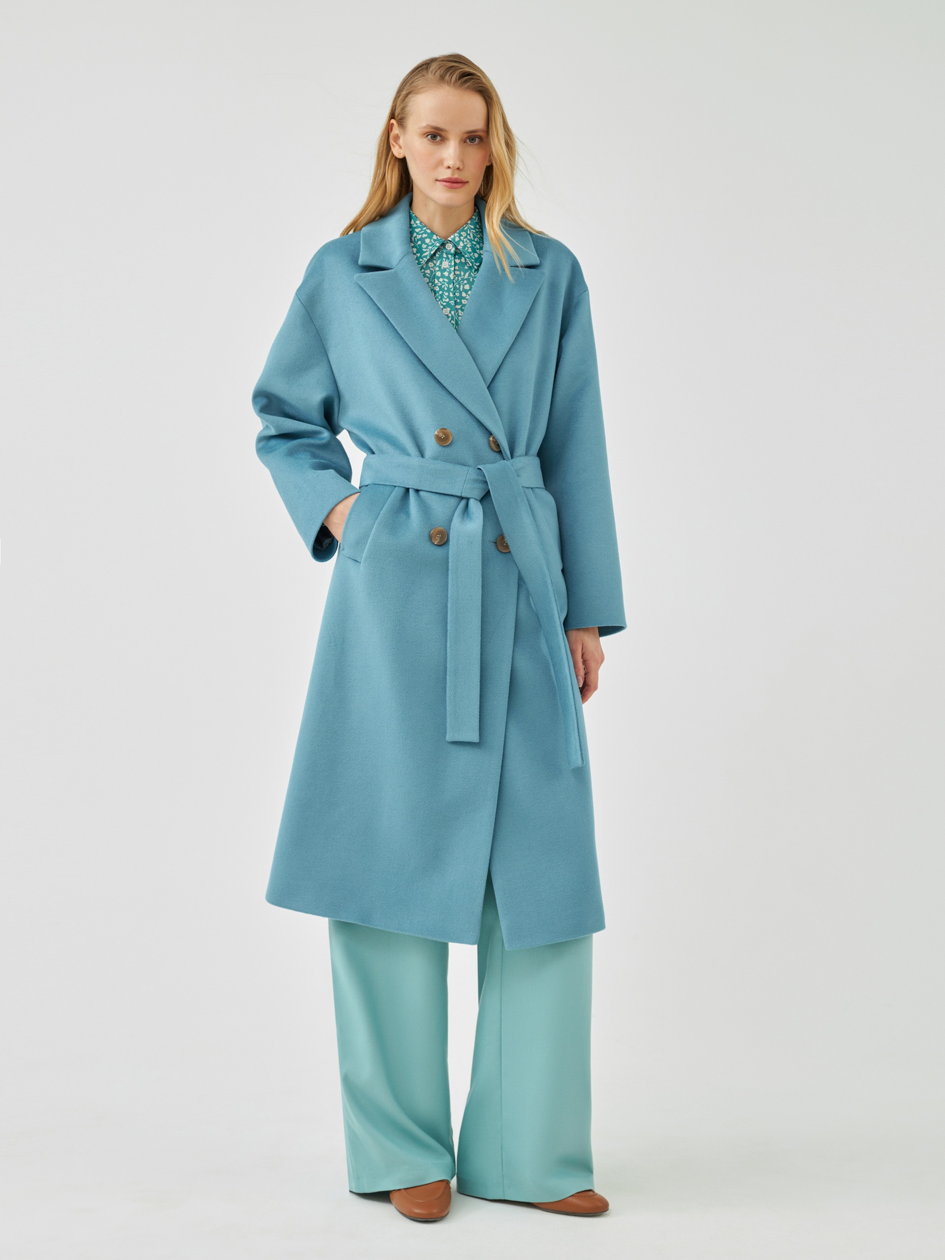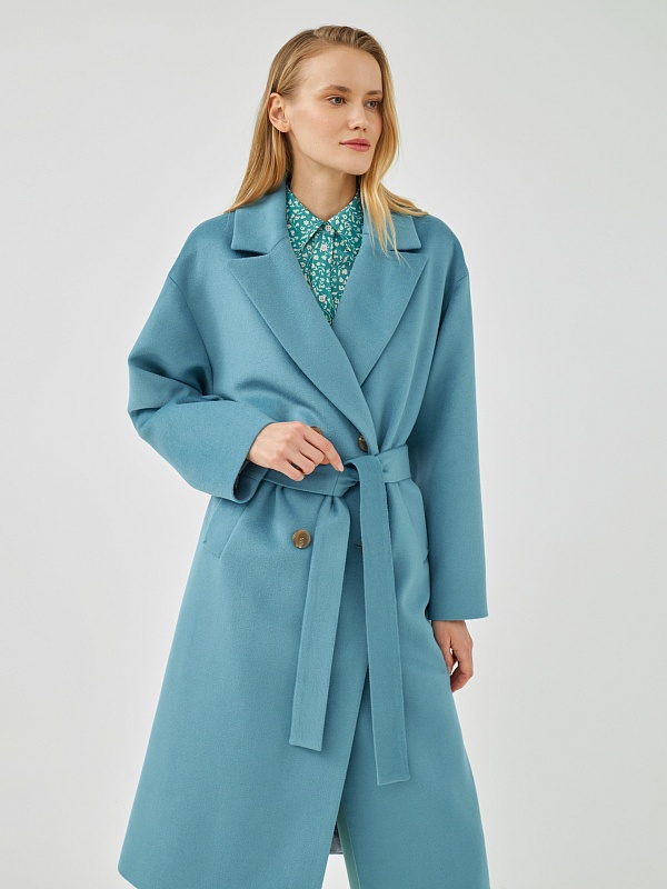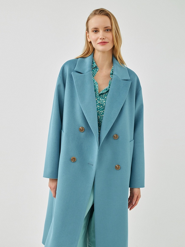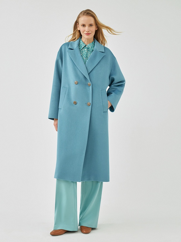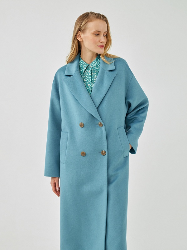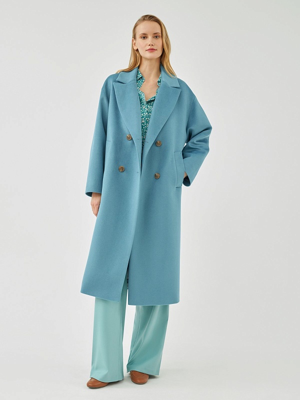 Классическое двубортное пальто прямого силуэта из пальтовой ткани с высоким содержанием шерсти весеннего голубого цвета. Это пальто имеет уникальные новые формы, которые делают пальто свежим, уникальным и модным. Роскошный английский воротник с низкой линией раскепа и острыми краями лацкана, рубашечный рукав, слегка зауженый к низу. По бокам пальто располагаются глубокие и вместительные карманы с листочками. Пальто произведено с использованием запатентованных технологий в виде высокотехнологичной мембраны Raft Pro. Произведено в Санкт-Петербурге.