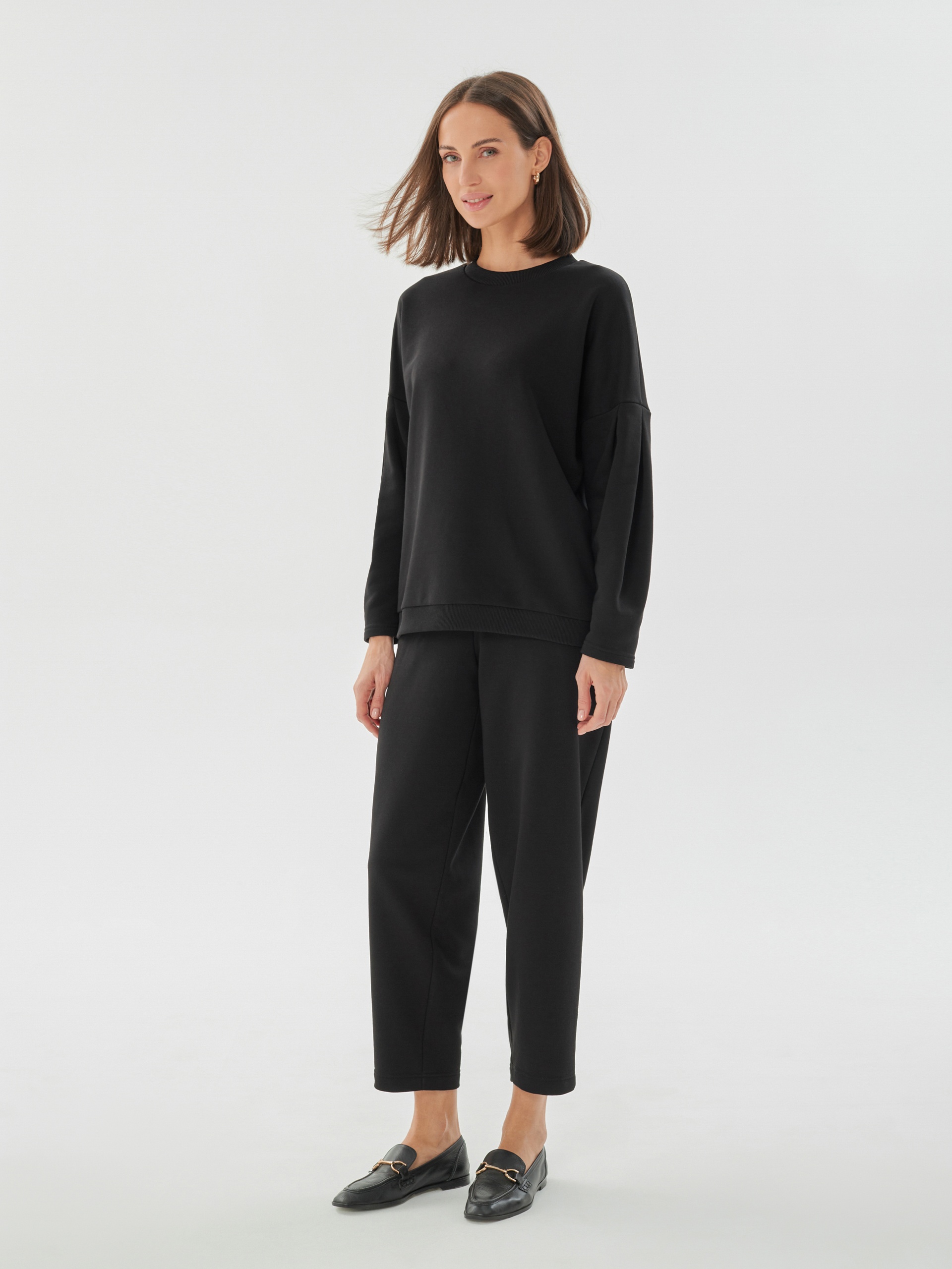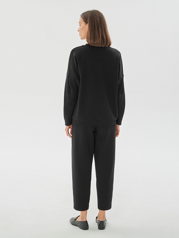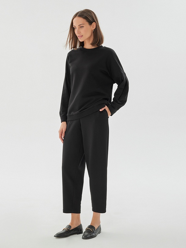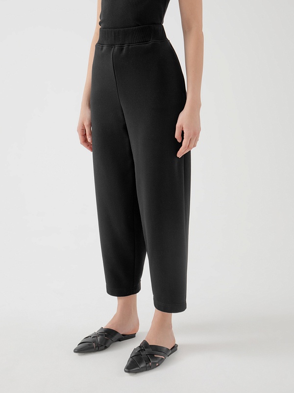 Объемные брюки из черного футера с резинкой в поясе и карманами в швах. Такие брюки идеально подходят для отдыха на природе.
