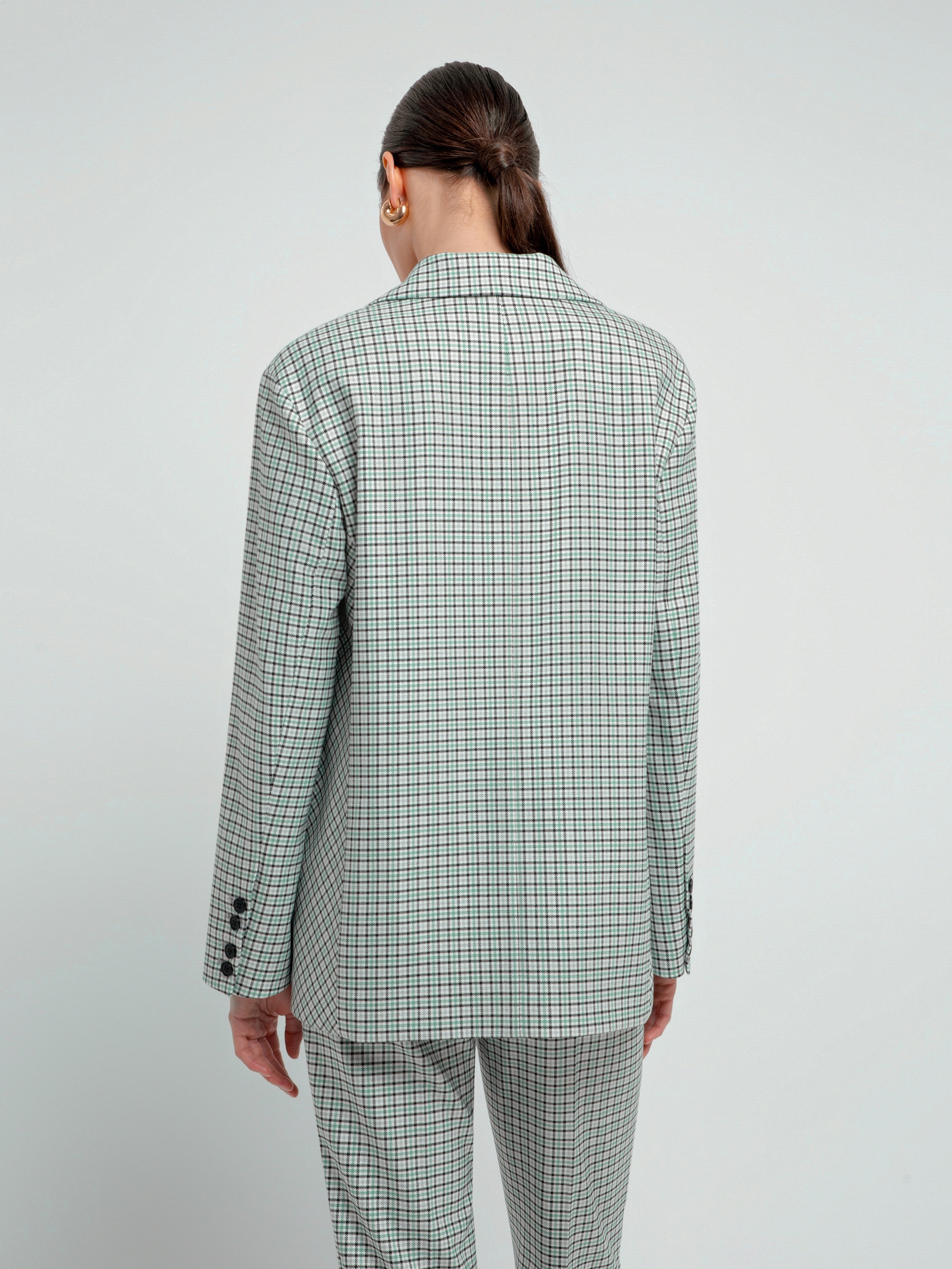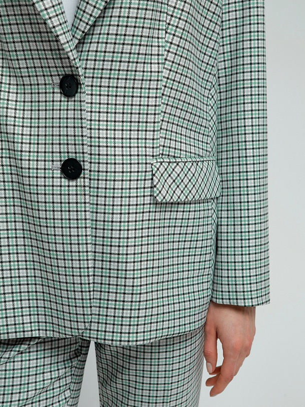 Однобортный жакет на подкладке со спущенной линией плеча и округлыми лацканами. Жакет выполнен из костюмной ткани в мелкую клетку серо-бирюзового цвета.