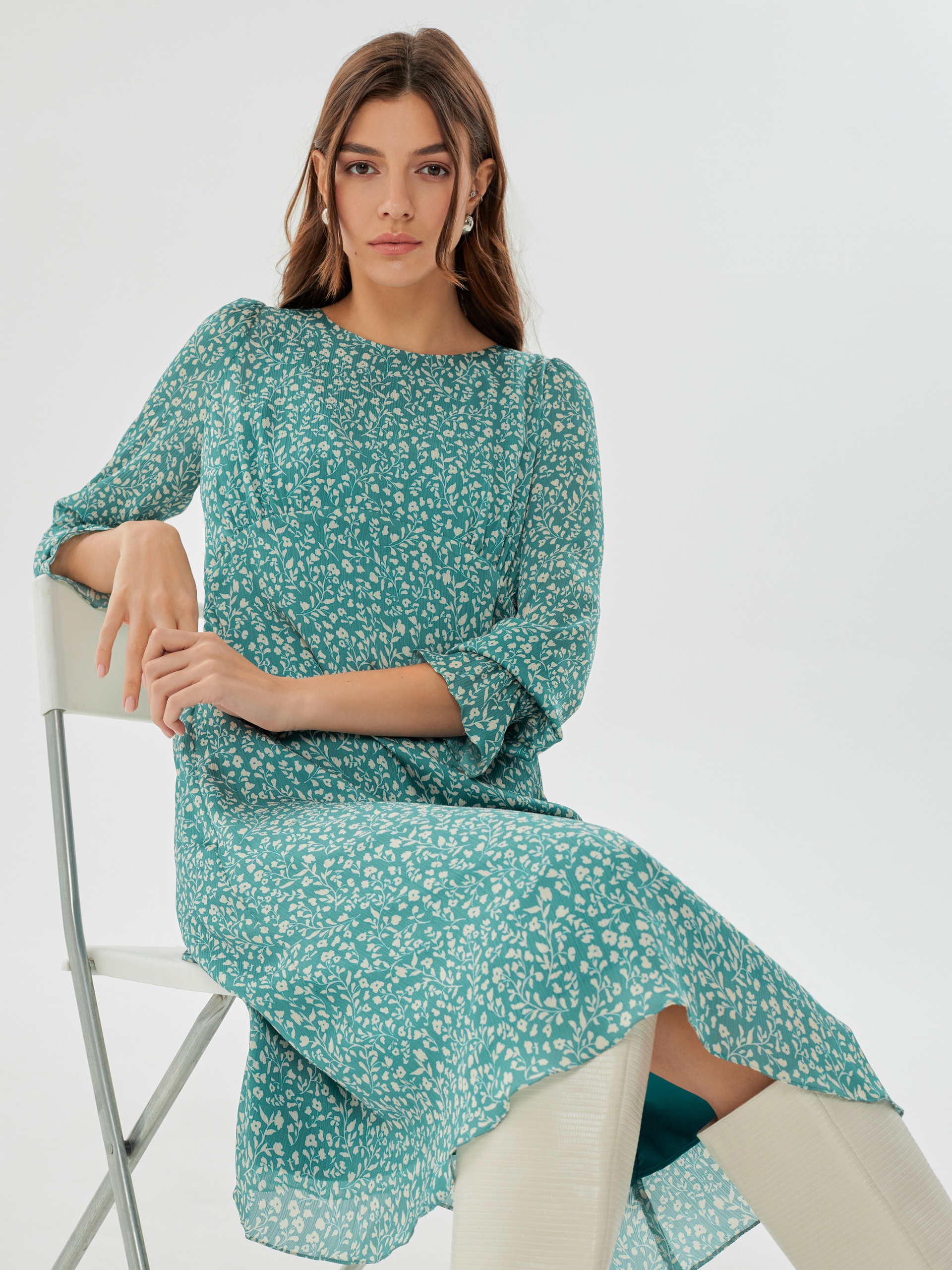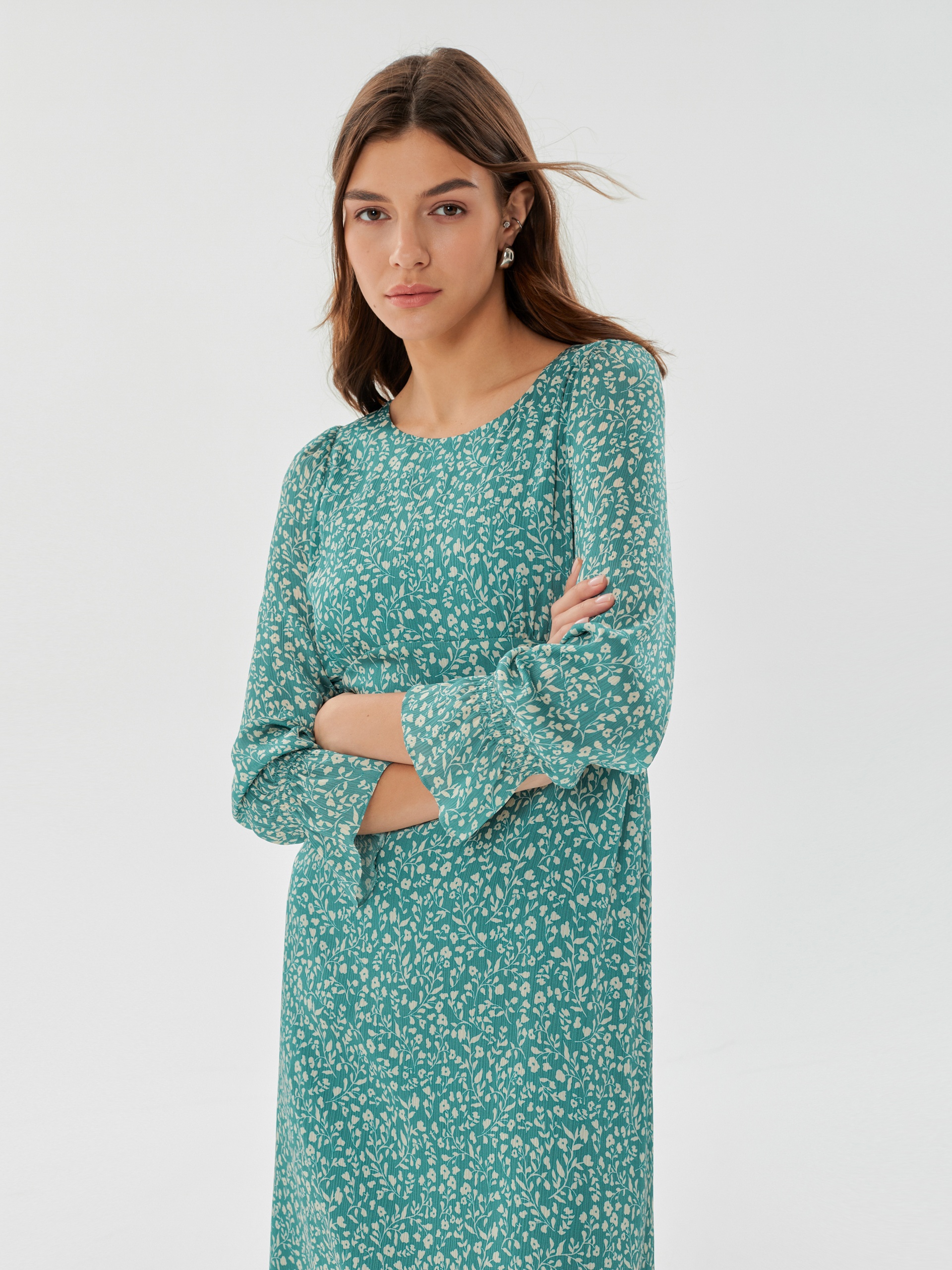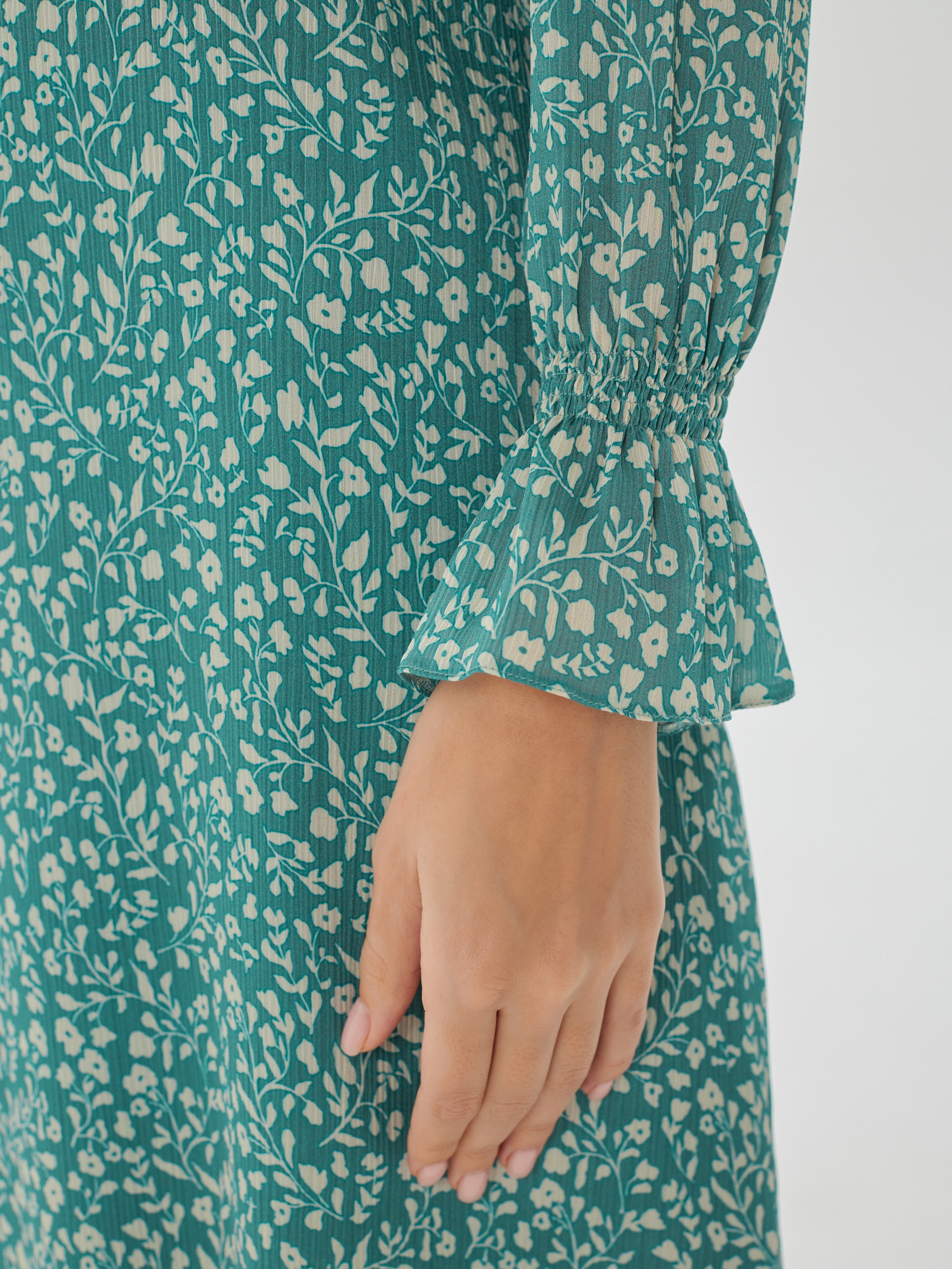 Романтичное платье приталенного силуэта по колено с отрезным лифом и сборками по юбке. Круглая горловина и рукава полной длины на резинках создают романтичный образ. Платье имеет бирюзовый цвет и цветочный принт.