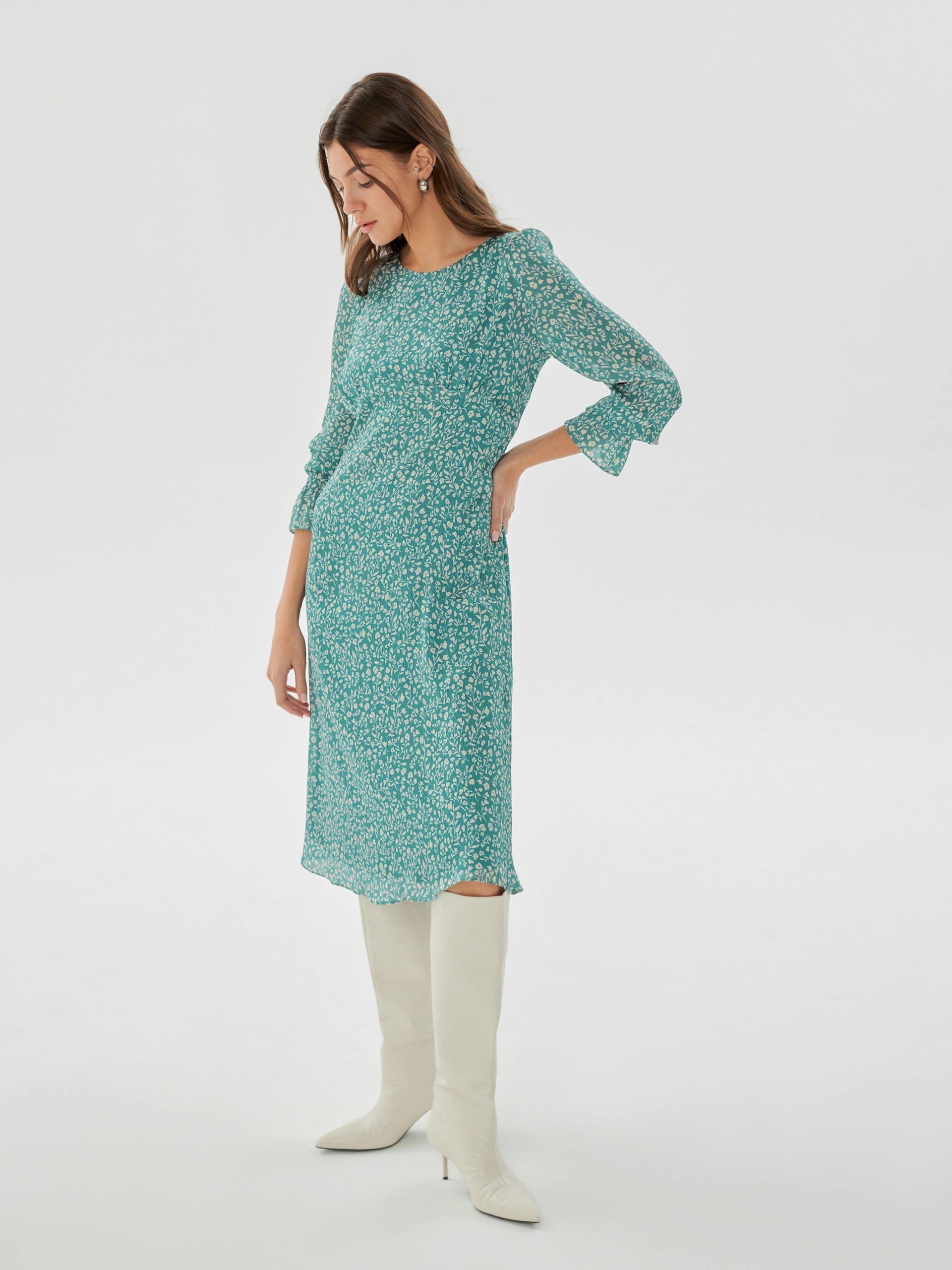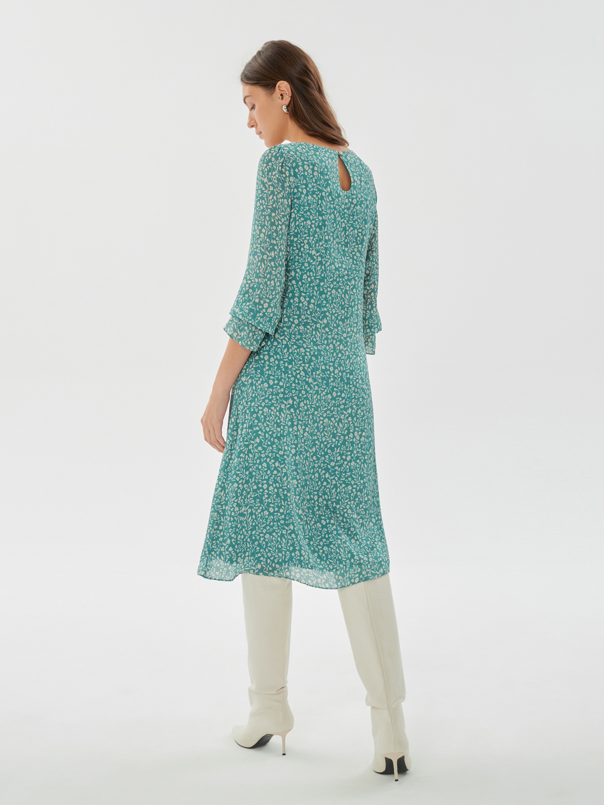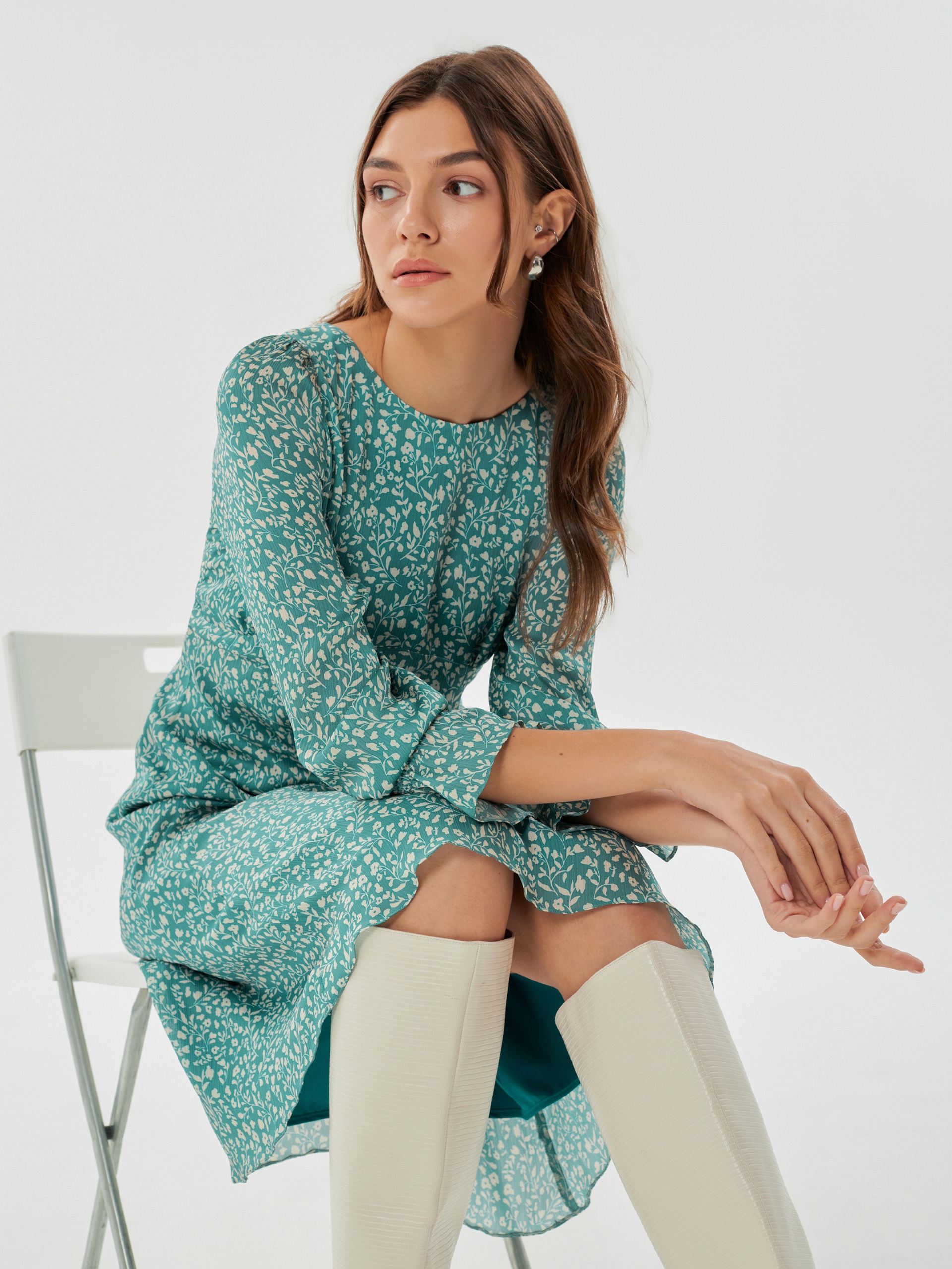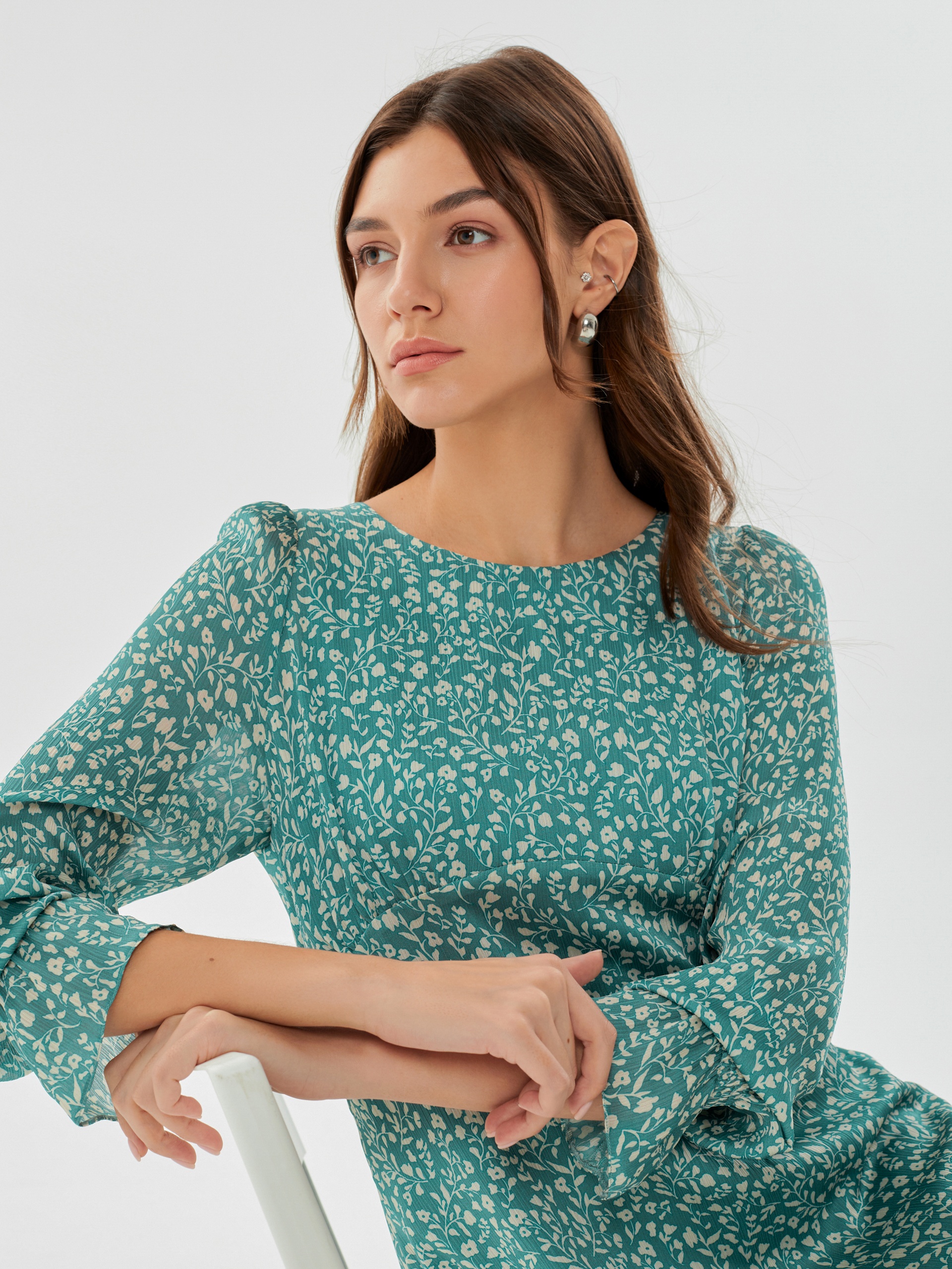 Романтичное платье приталенного силуэта по колено с отрезным лифом и сборками по юбке. Круглая горловина и рукава полной длины на резинках создают романтичный образ. Платье имеет бирюзовый цвет и цветочный принт.