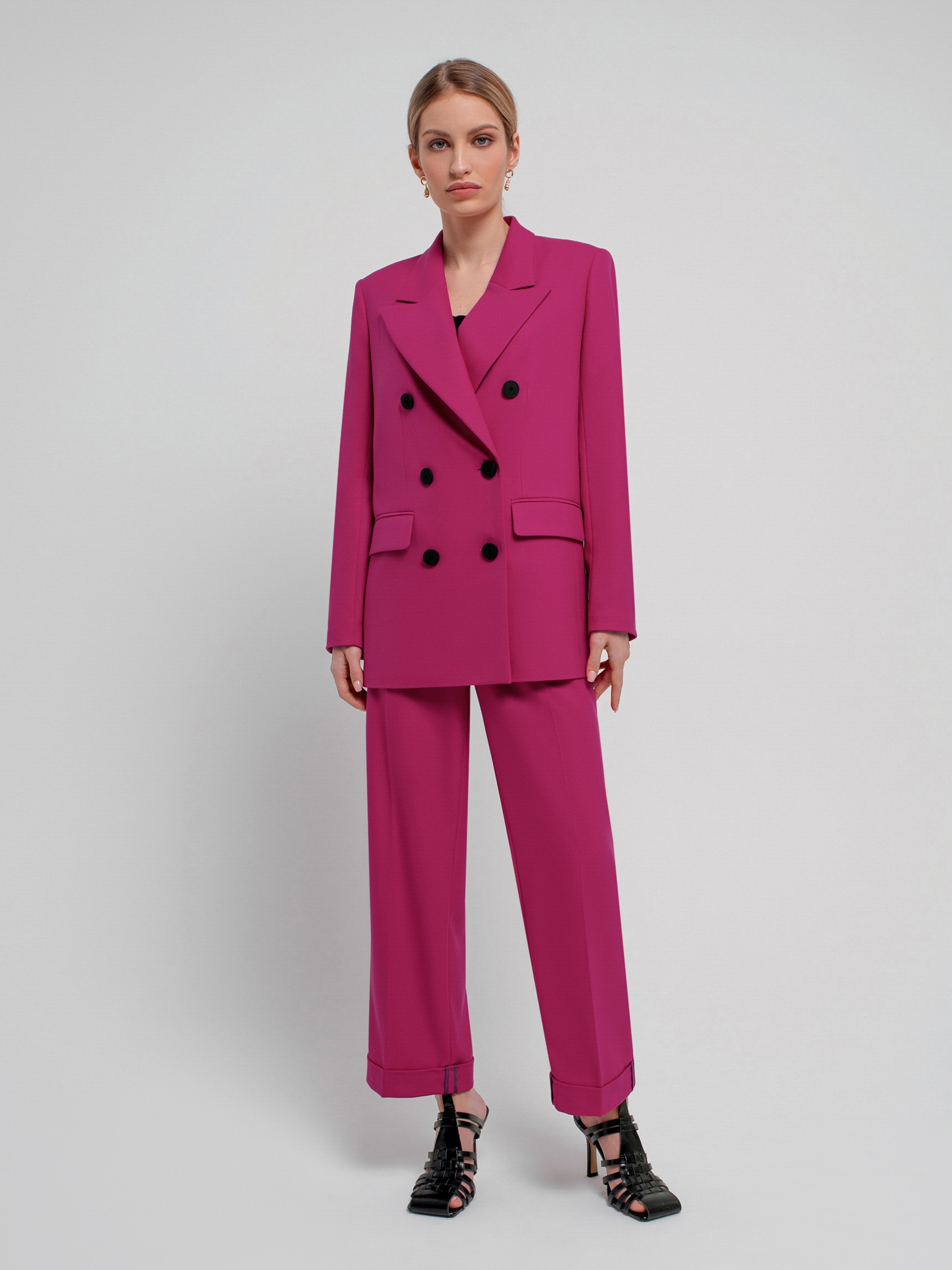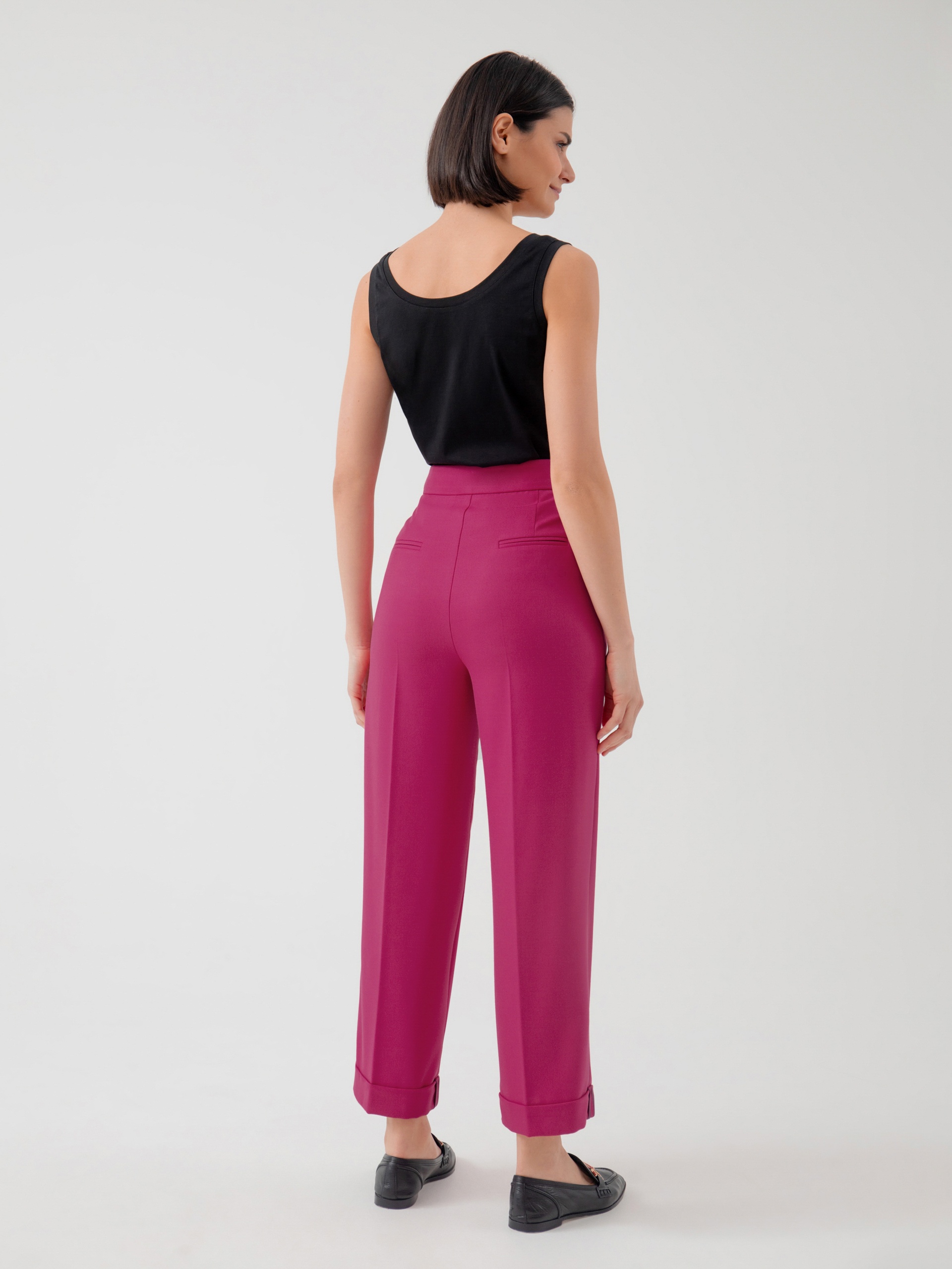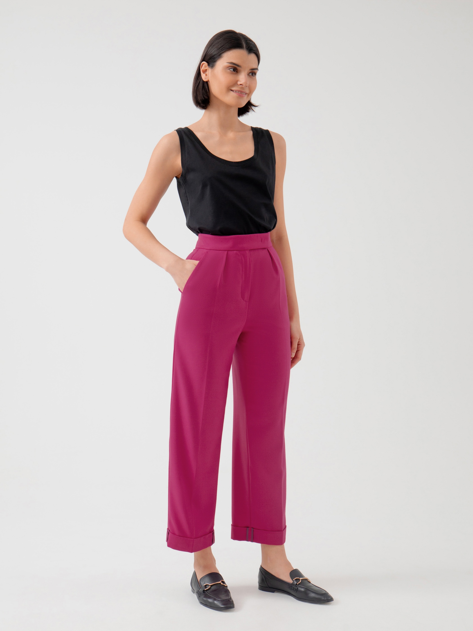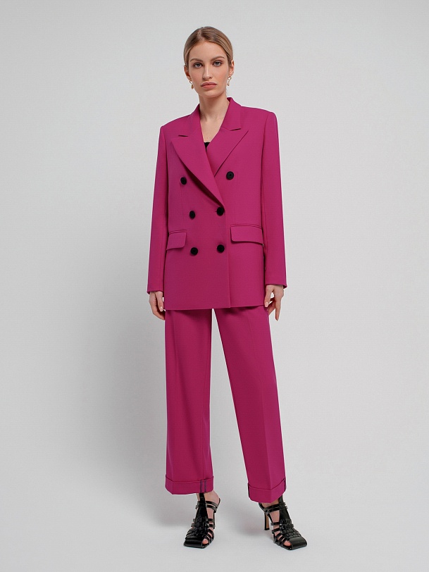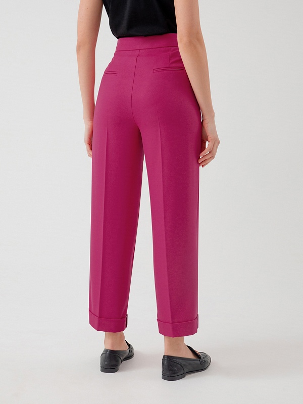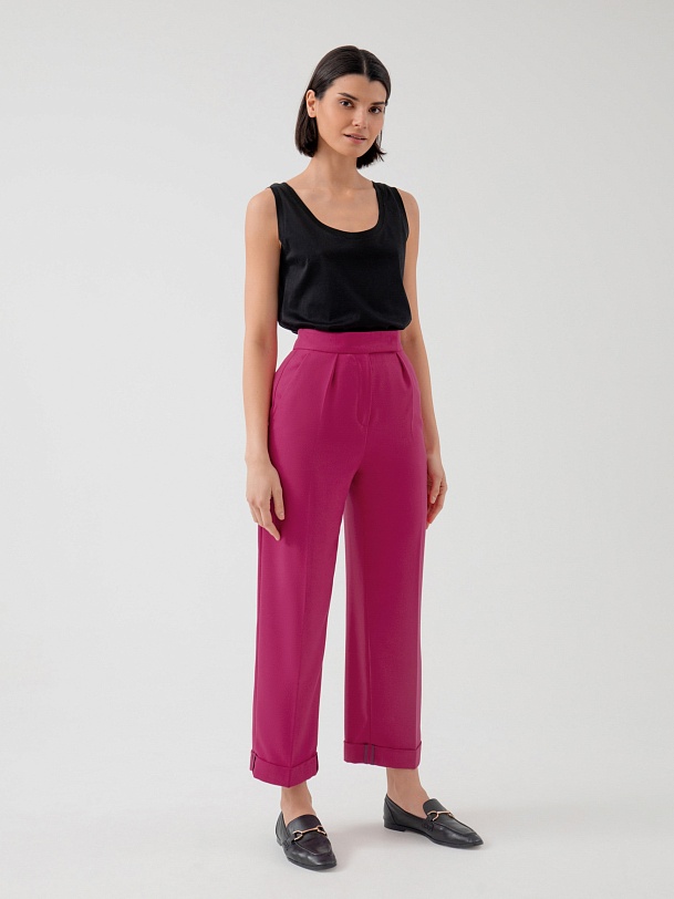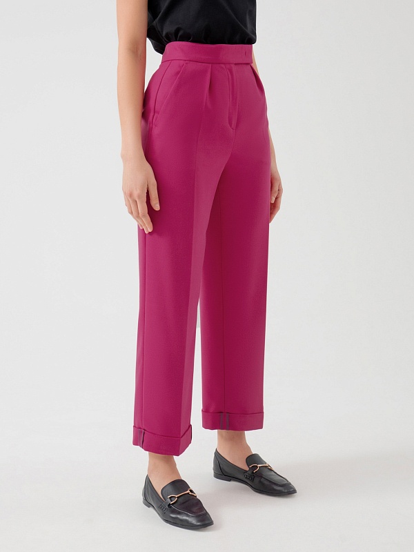 Классические брюки со стрелками из костюмной ткани прямого силуэта на притачном поясе со шлевками, рабочими карманами по бокам и отворотами по низу. Застежка спереди на молнию и крючок. Эта модель сформирует яркий образ с жакетом из этой же ткани.