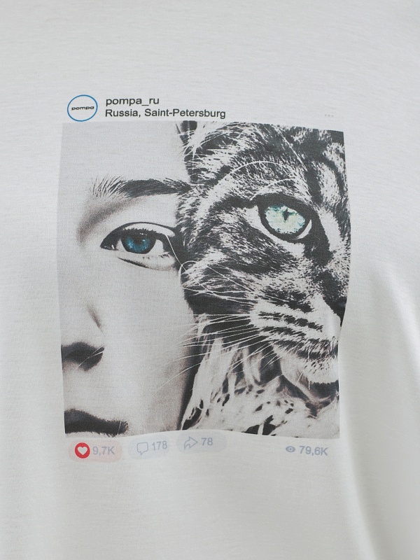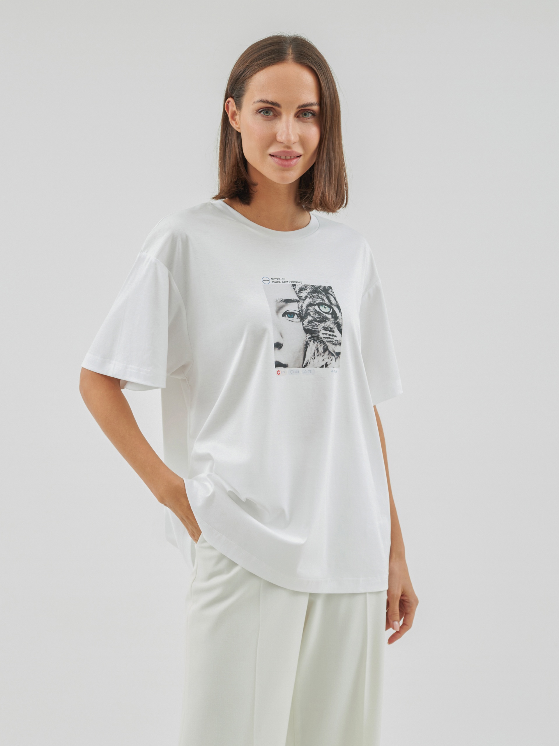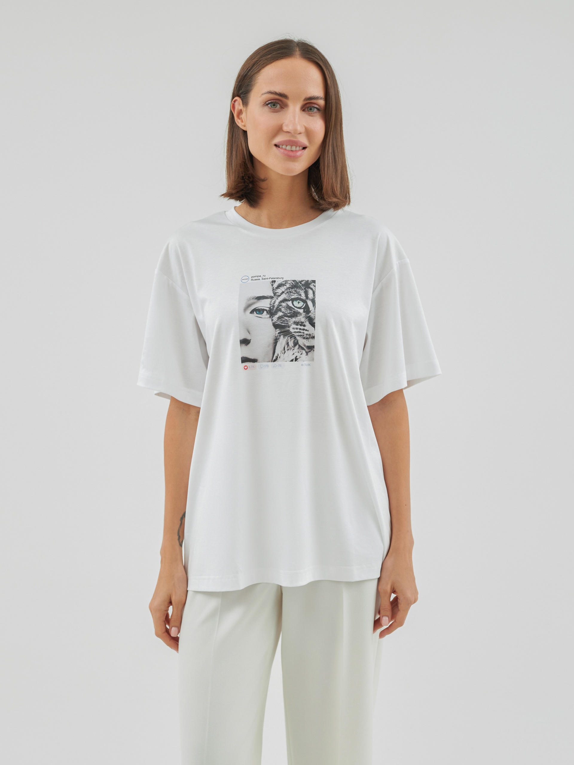 Базовая женская футболка свободного кроя белого цвета с принтом, короткими рукавами и круглой горловиной.
