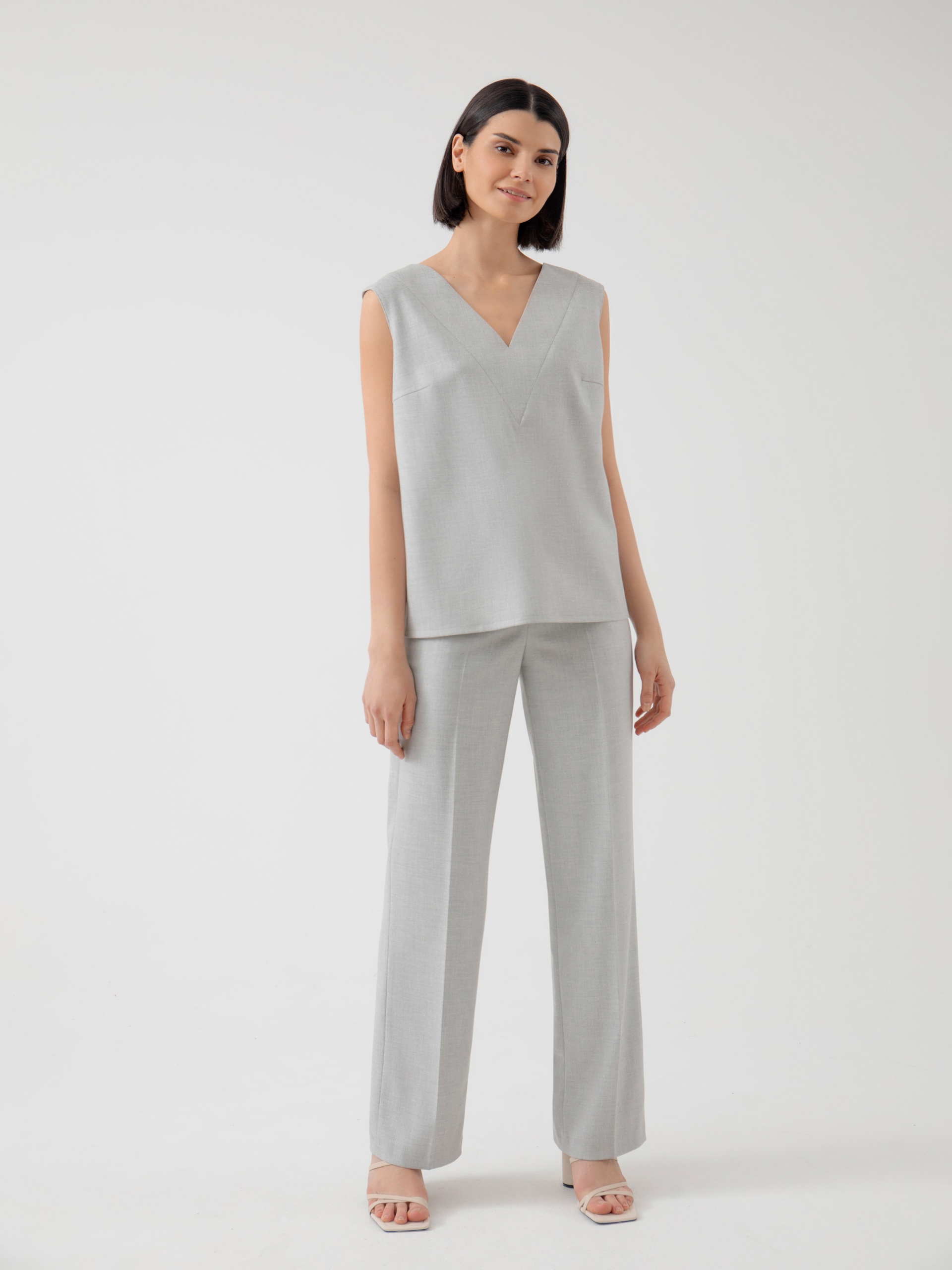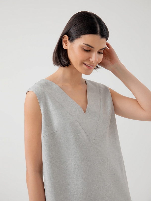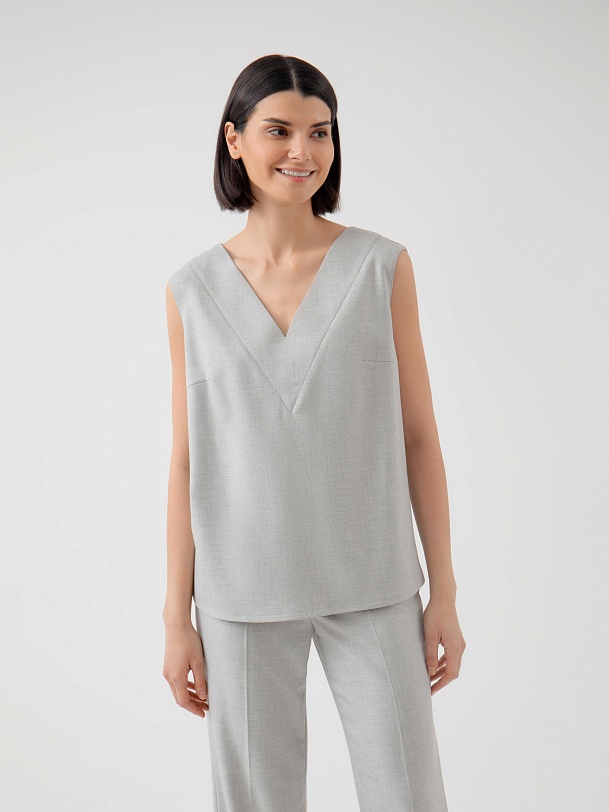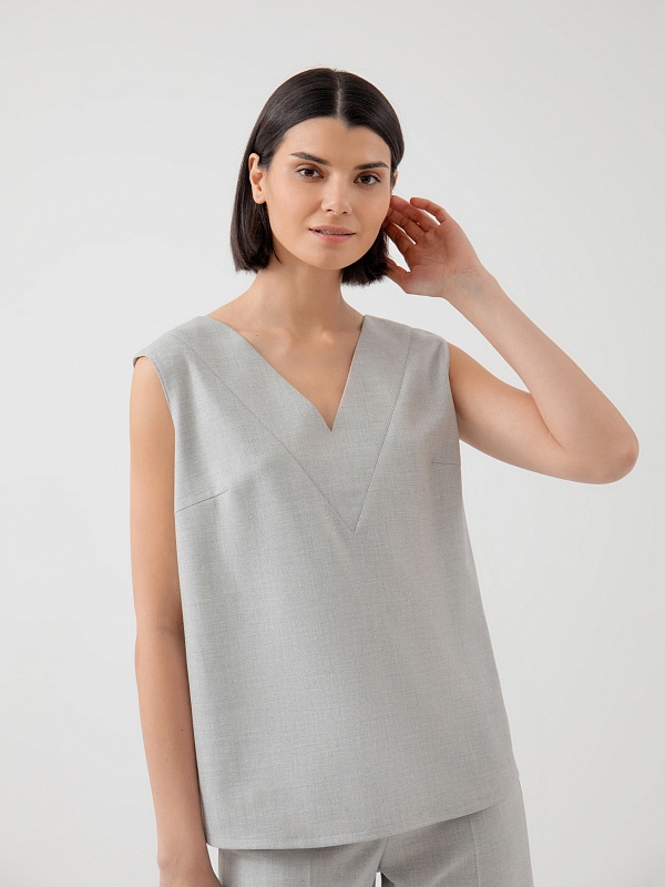 Свободная прямая блуза из тонкой костюмной ткани в сером цвете с V-образным вырезом и планкой по горловине. Блуза со спущенным плечом и разрезами по бокам. Хорошая альтернатива классическим костюмам в весенне-летний сезон.