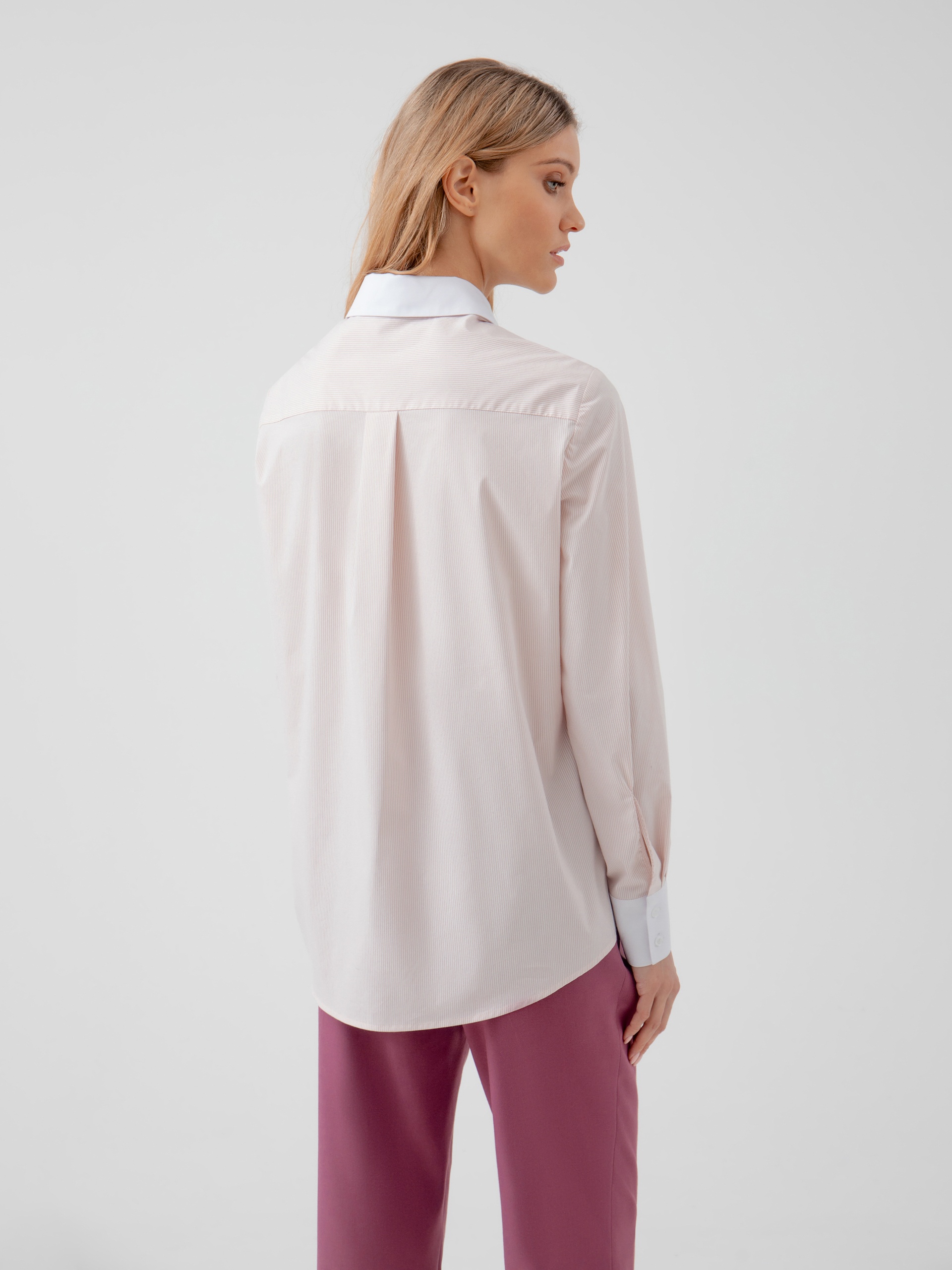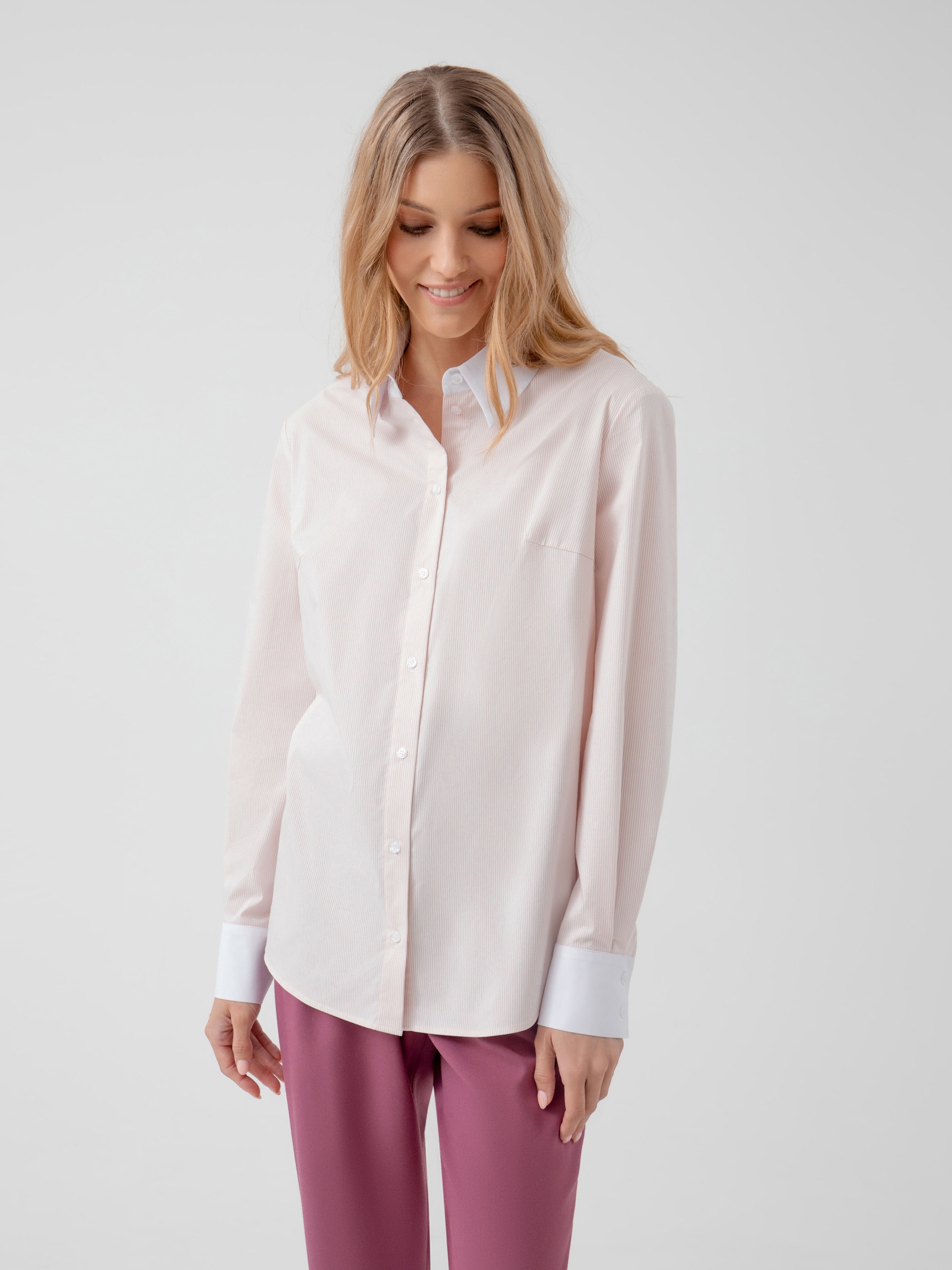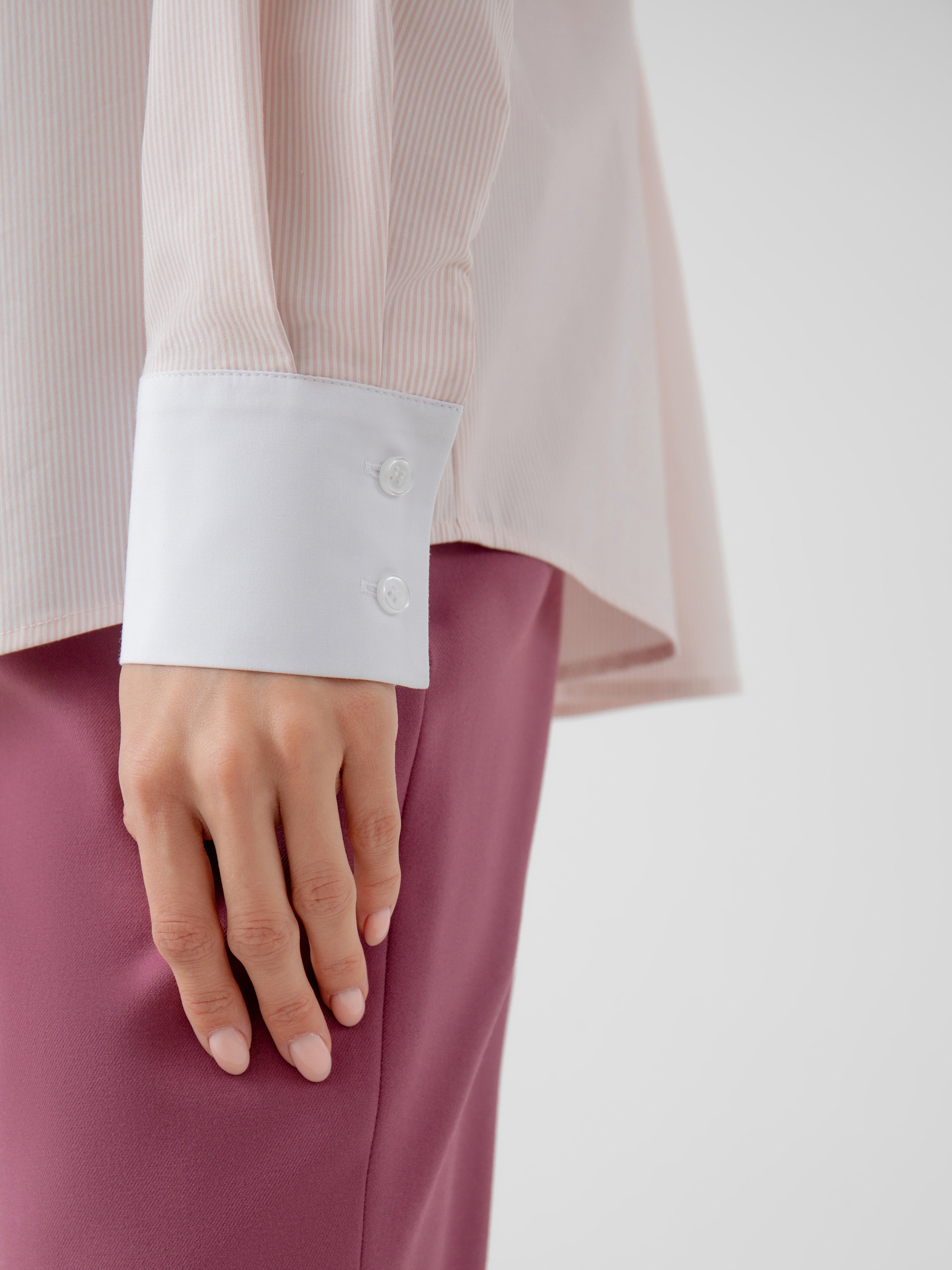 Удлинённая блуза из хлопковой ткани, расширенная к низу, с классическим верхом. Блуза в тонкую полоску с отложным воротником, потайной планкой и втачным рукавом на манжете. Низ блузки с перепадом длины от переда к спинке. На спинке кокетка с бантовой складкой для лучшей посадки.