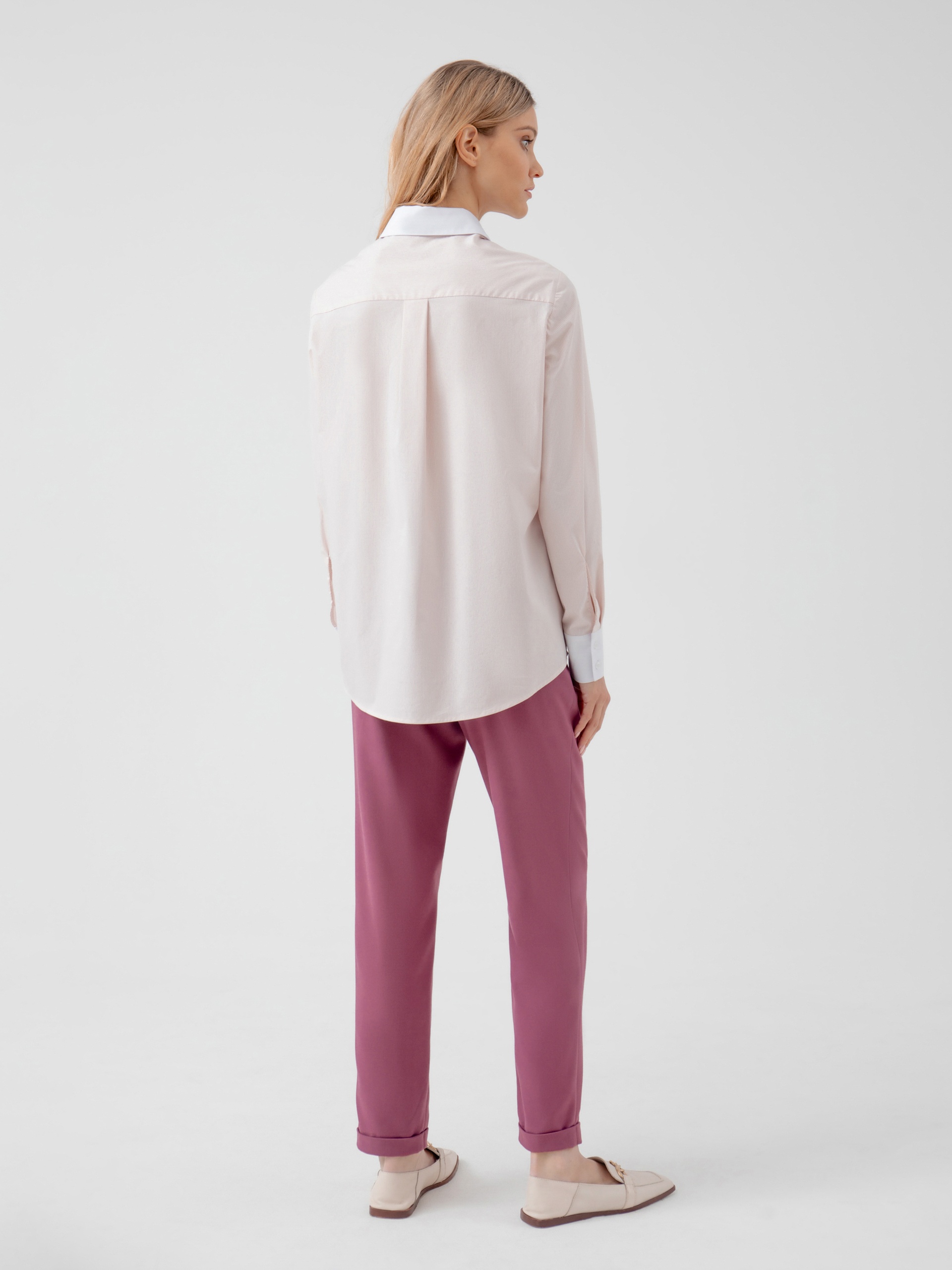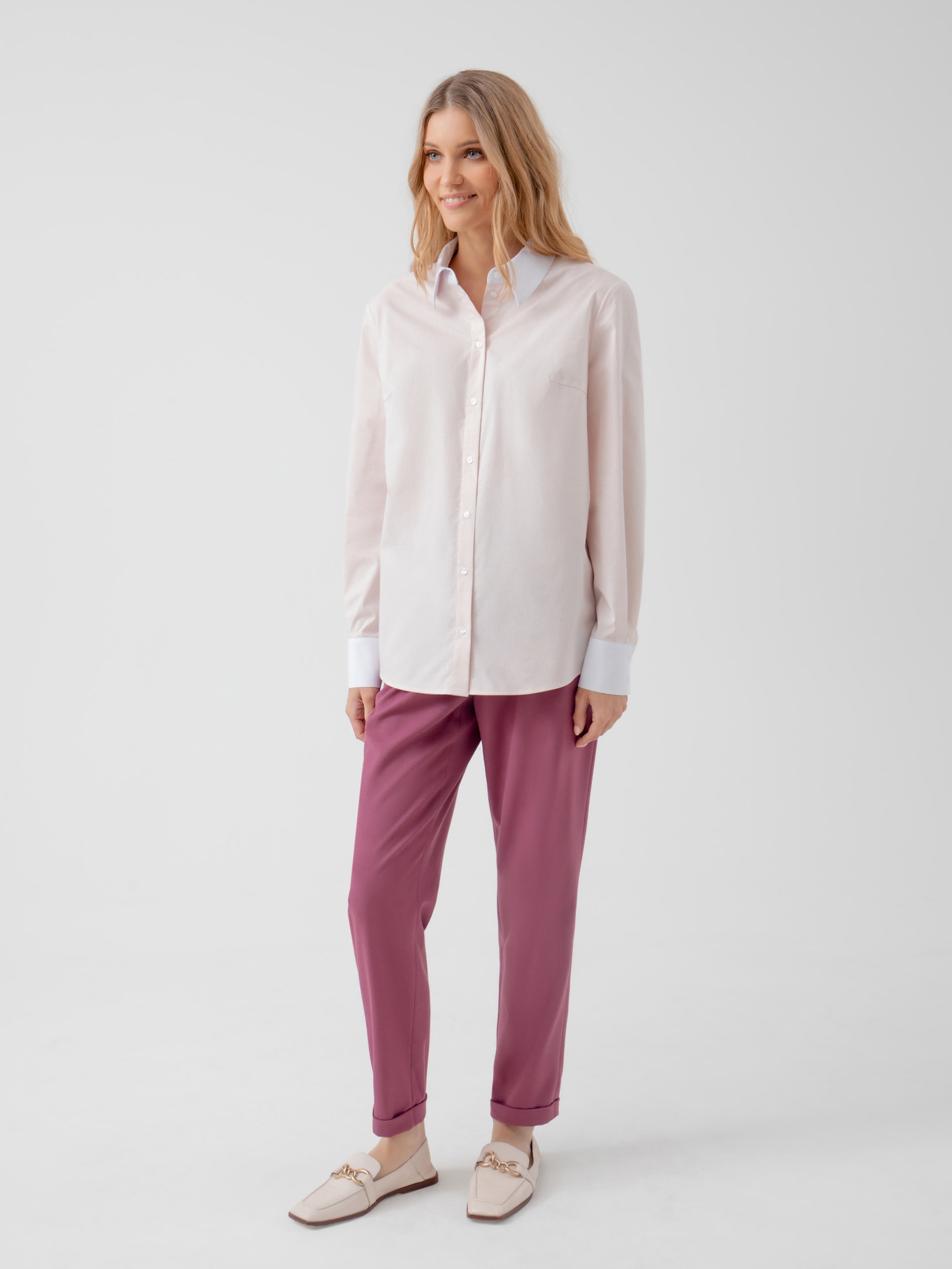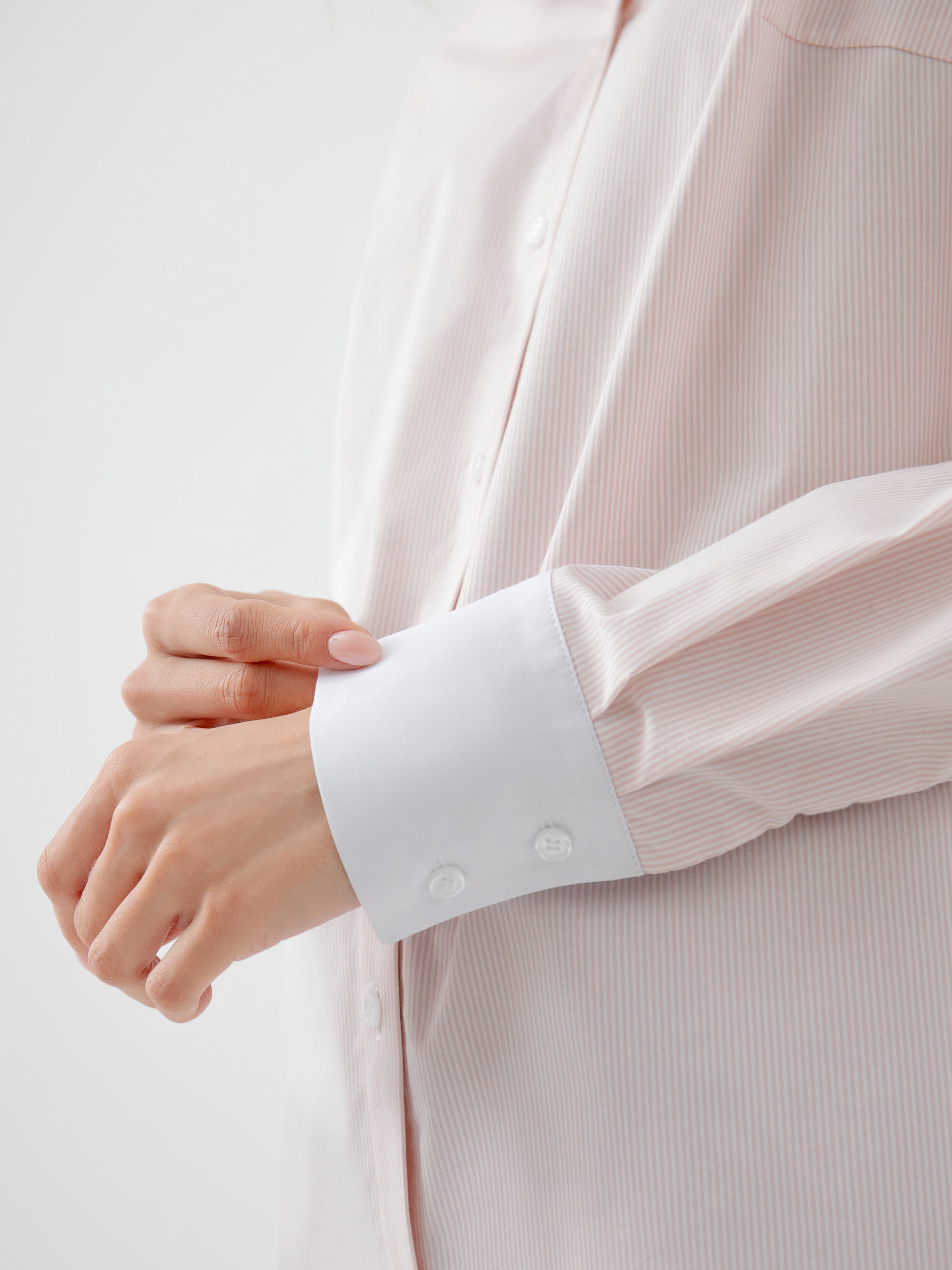 Удлинённая блуза из хлопковой ткани, расширенная к низу, с классическим верхом. Блуза в тонкую полоску с отложным воротником, потайной планкой и втачным рукавом на манжете. Низ блузки с перепадом длины от переда к спинке. На спинке кокетка с бантовой складкой для лучшей посадки.