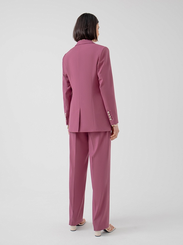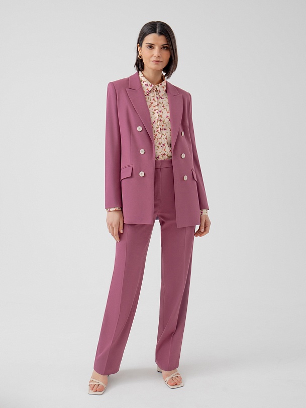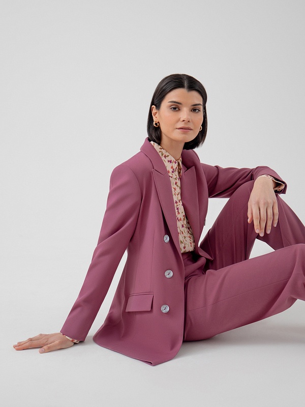 Прямой удлинённый однобортный жакет с ложной застежкой на пуговицы. Английский воротник с остроконечными лацканами. На полочке два наклонённых кармана с клапанами. Жакет полностью на подкладке и выполнен из костюмной ткани в благородном цвете "амарант". Составит дерзкий ансамбль с широкими брюками из этой же ткани.