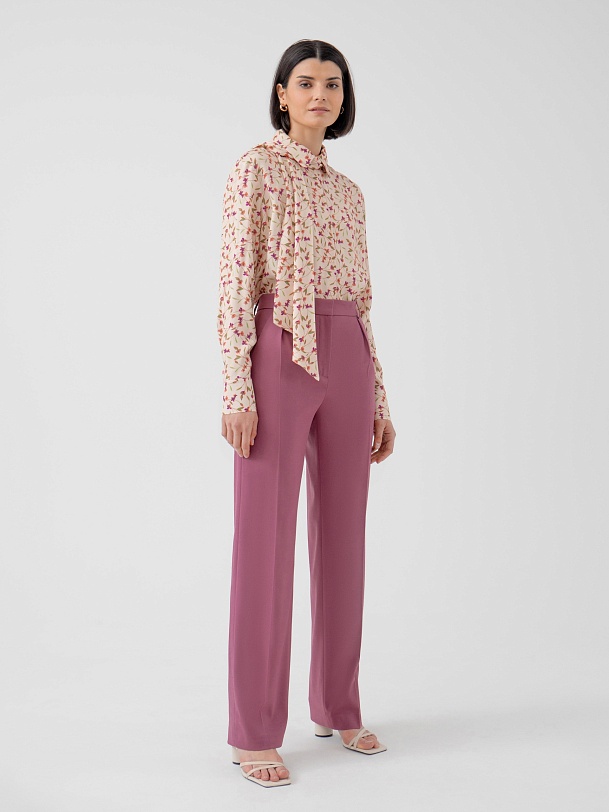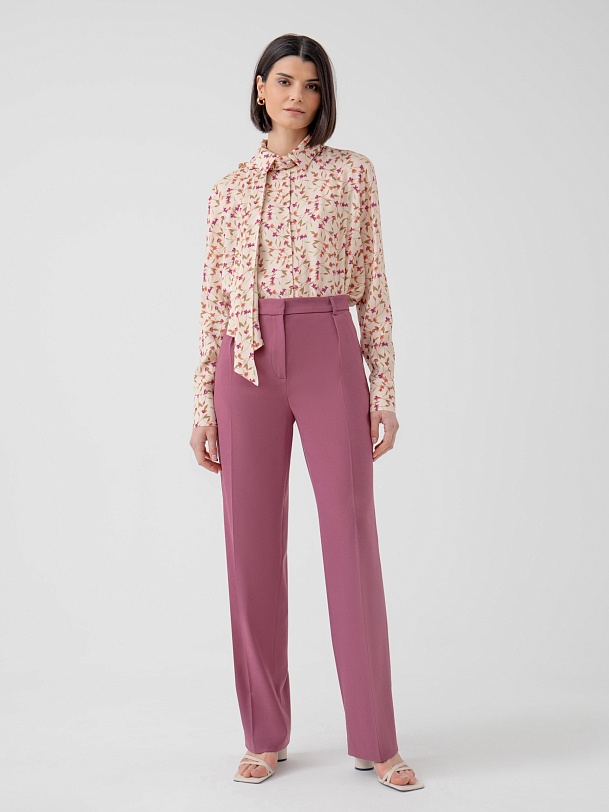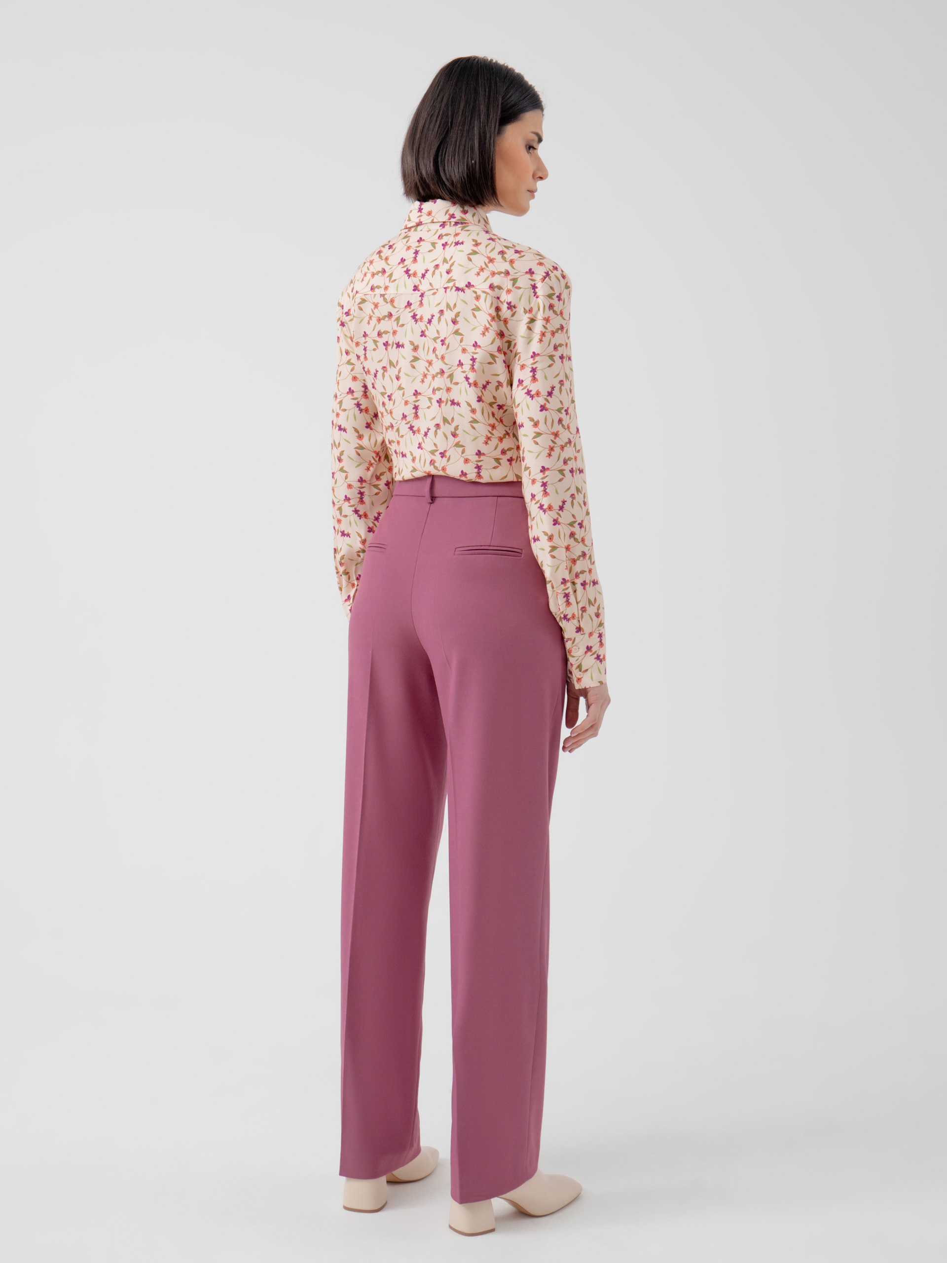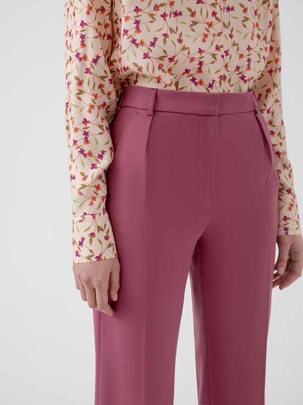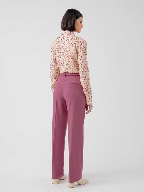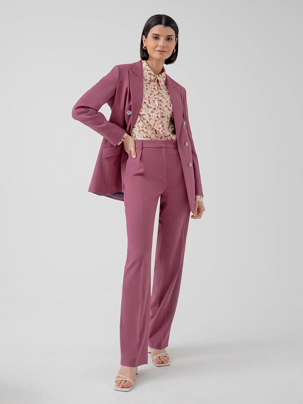 Широкие прямые брюки на низкой посадке со складками из костюмной ткани в благородном цвете "амарант". Застежка спереди на молнию, брючный крючок и пуговицу. Модель имеет два функциональных кармана по бокам и прорезные карманы на задней части брюк. Брюки составляют ансамбль с жакетом из одного блока.