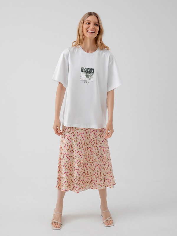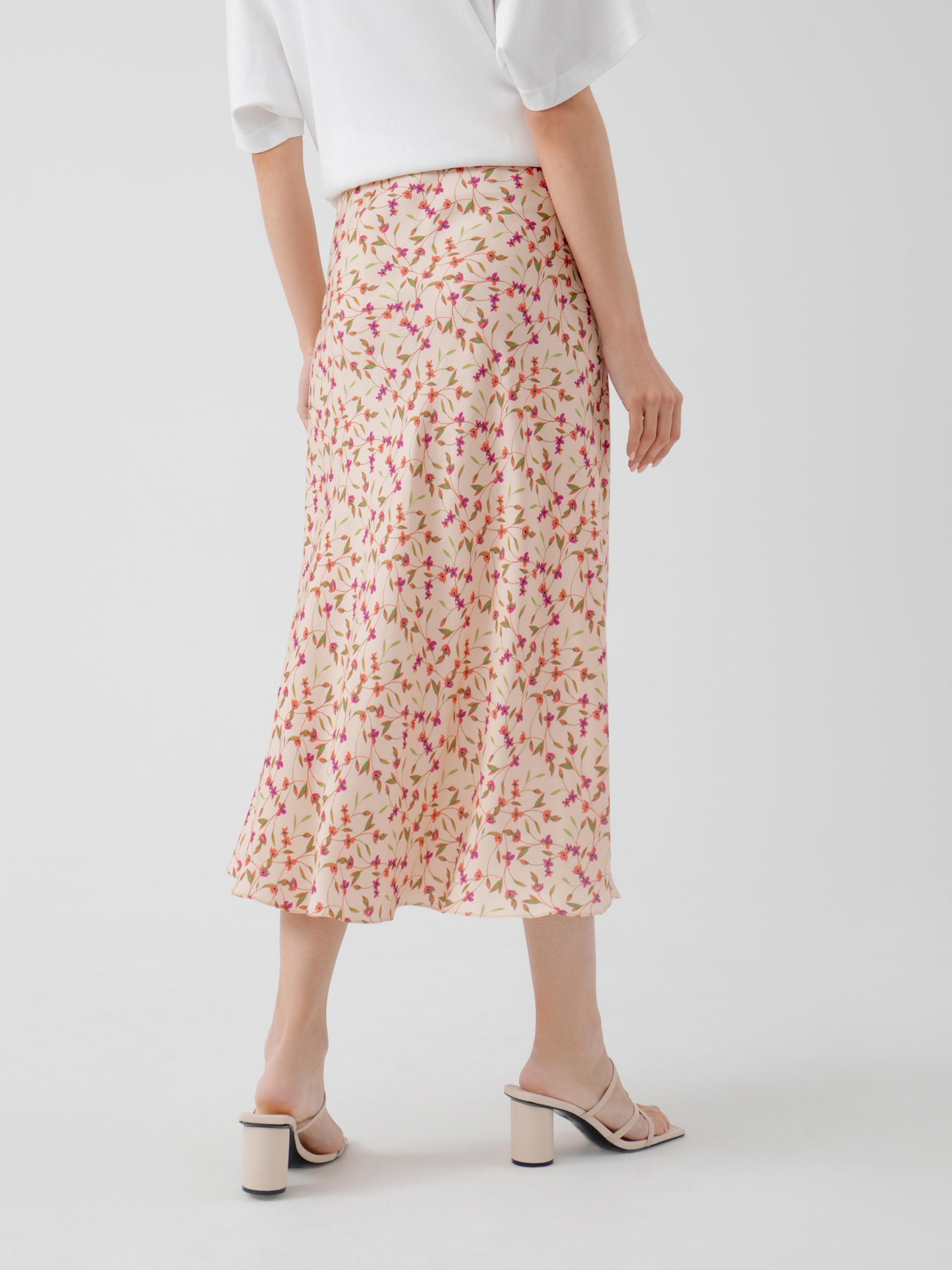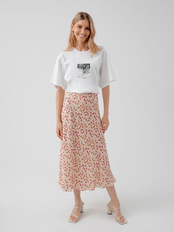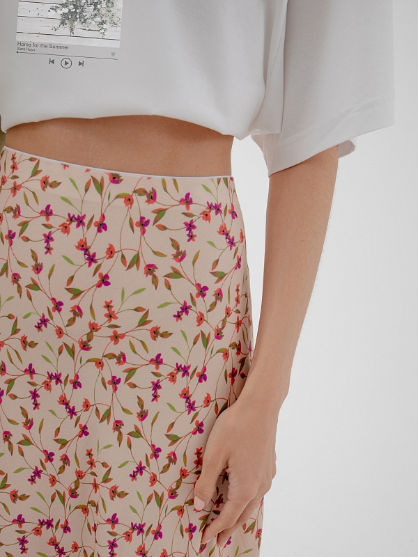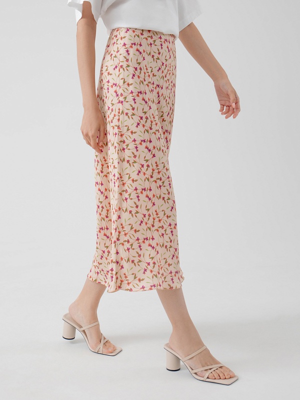 Романтическая юбка из вискозной ткани в цветочном принте, силуэт трапеция, длина миди, на подкладке. Пояс на резинке.