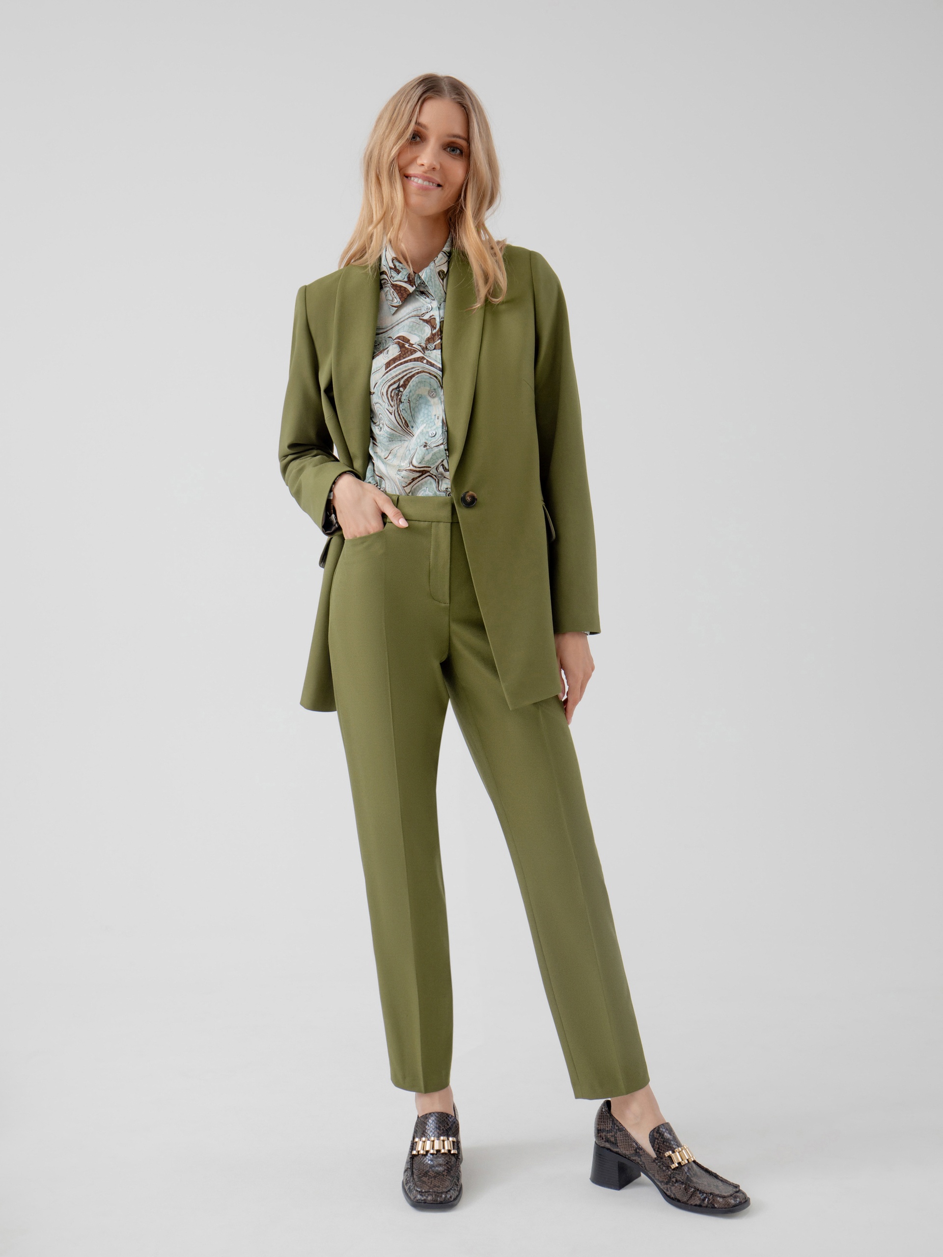 Классические брюки со стрелками прямого силуэта на притачном поясе со шлевками и рабочими карманами по бокам фигурной формы. Застежка спереди на молнию и крючок. Сзади прорезные карманы с листочками.