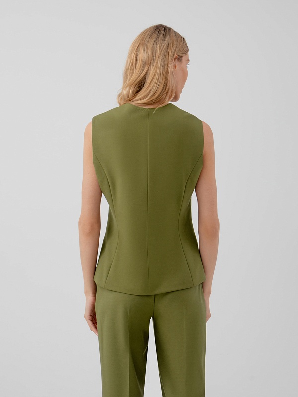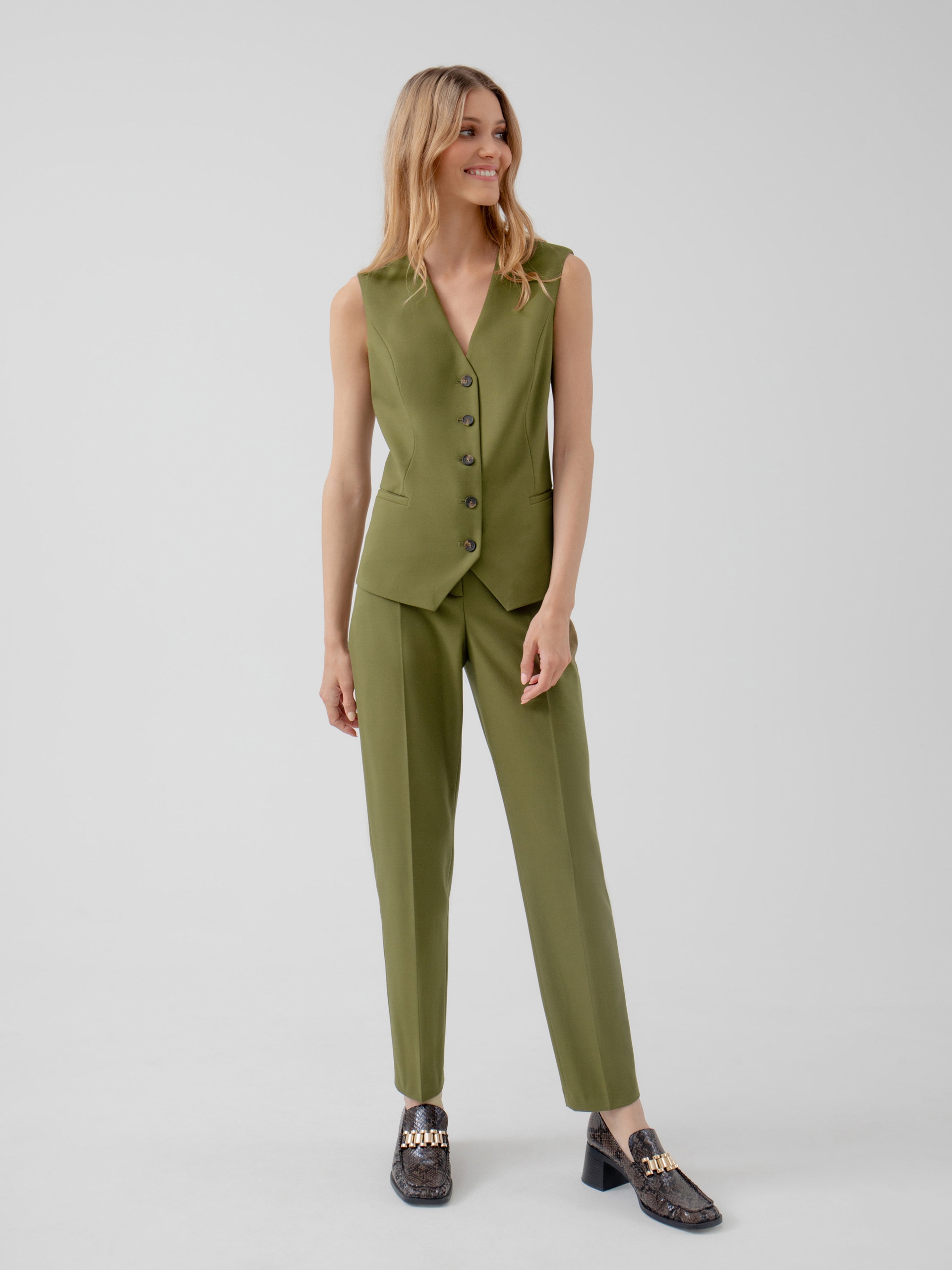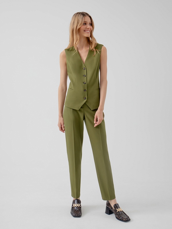 Жилет на подкладке полуприлегающего силуэта из костюмной ткани оливкового цвета с V-образным вырезом и застежкой на пуговицы. Модель идеально сочетается с брюками и жакетом из этой же ткани.