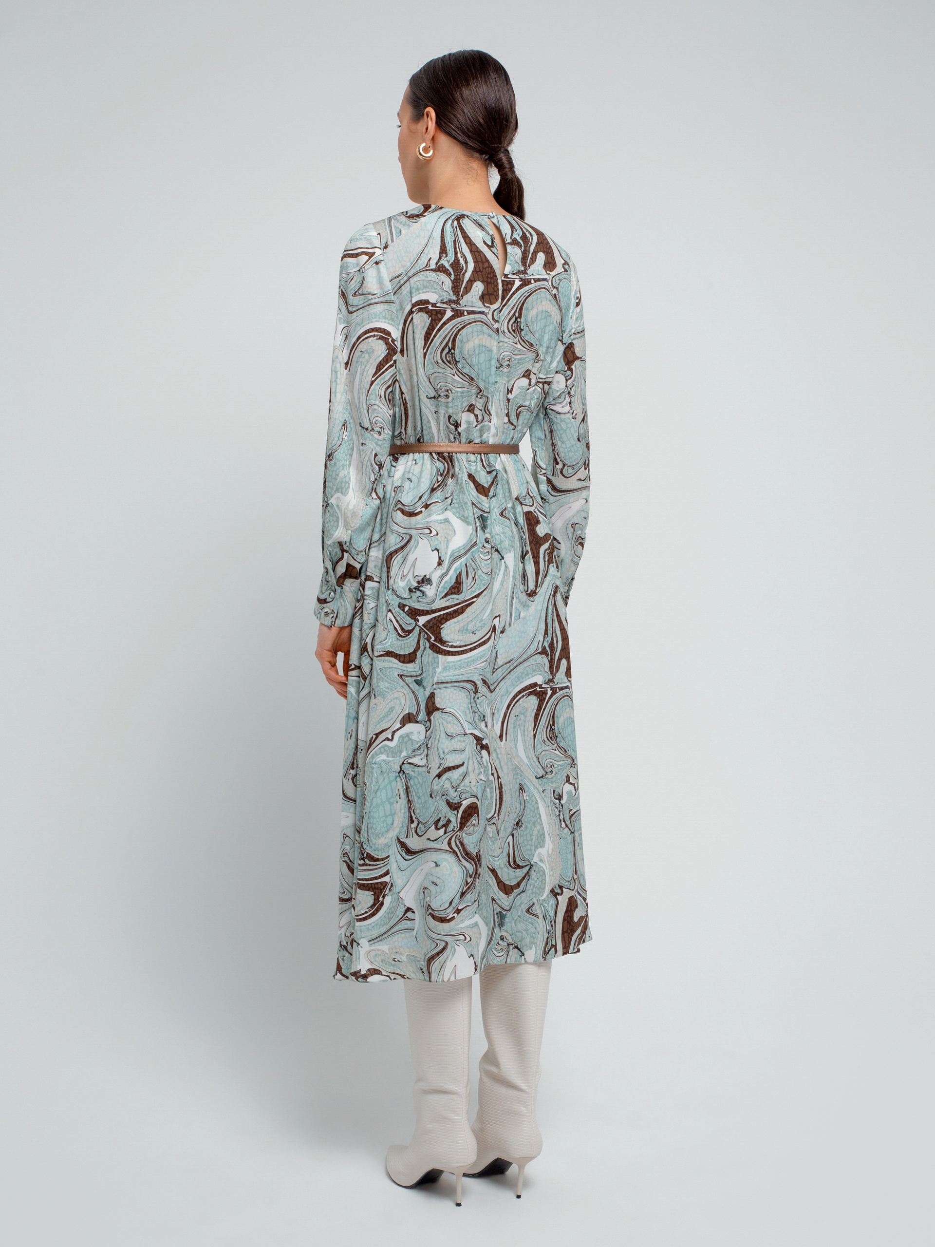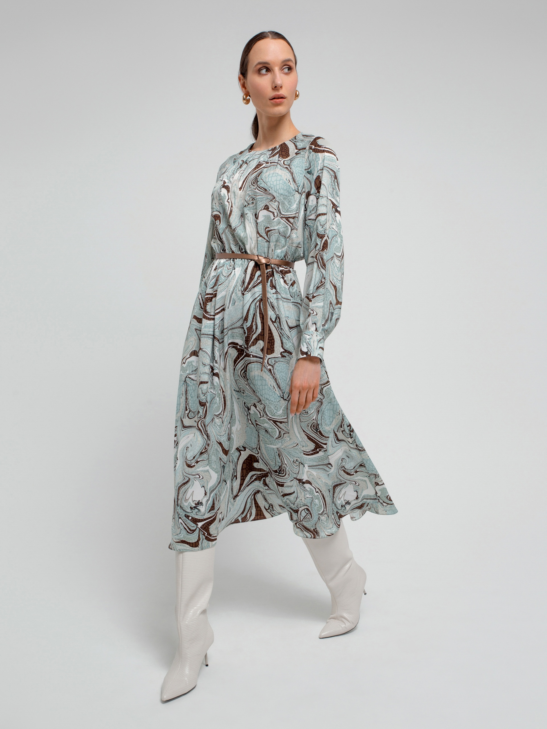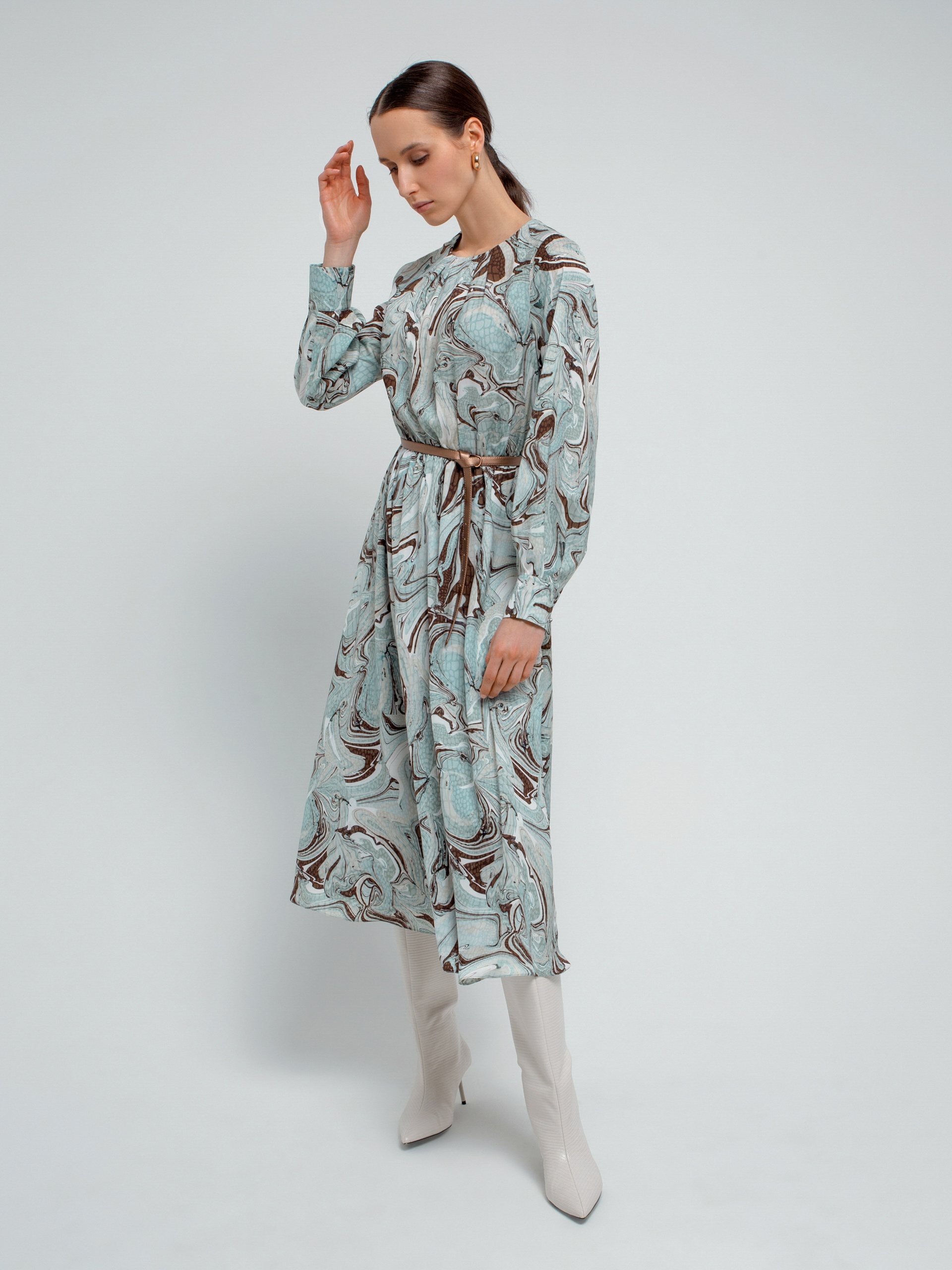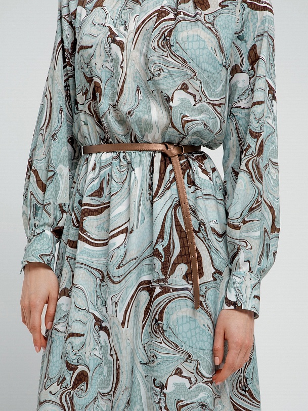 Романтичное платье приталенного силуэта с втачным длинным рукавом на манжете. Выполнено из премиальной плательной ткани с модным абстрактным принтом. У платья круглая горловина, оформленная складками. В комплекте к платью идет тонкий пояс из экокожи.