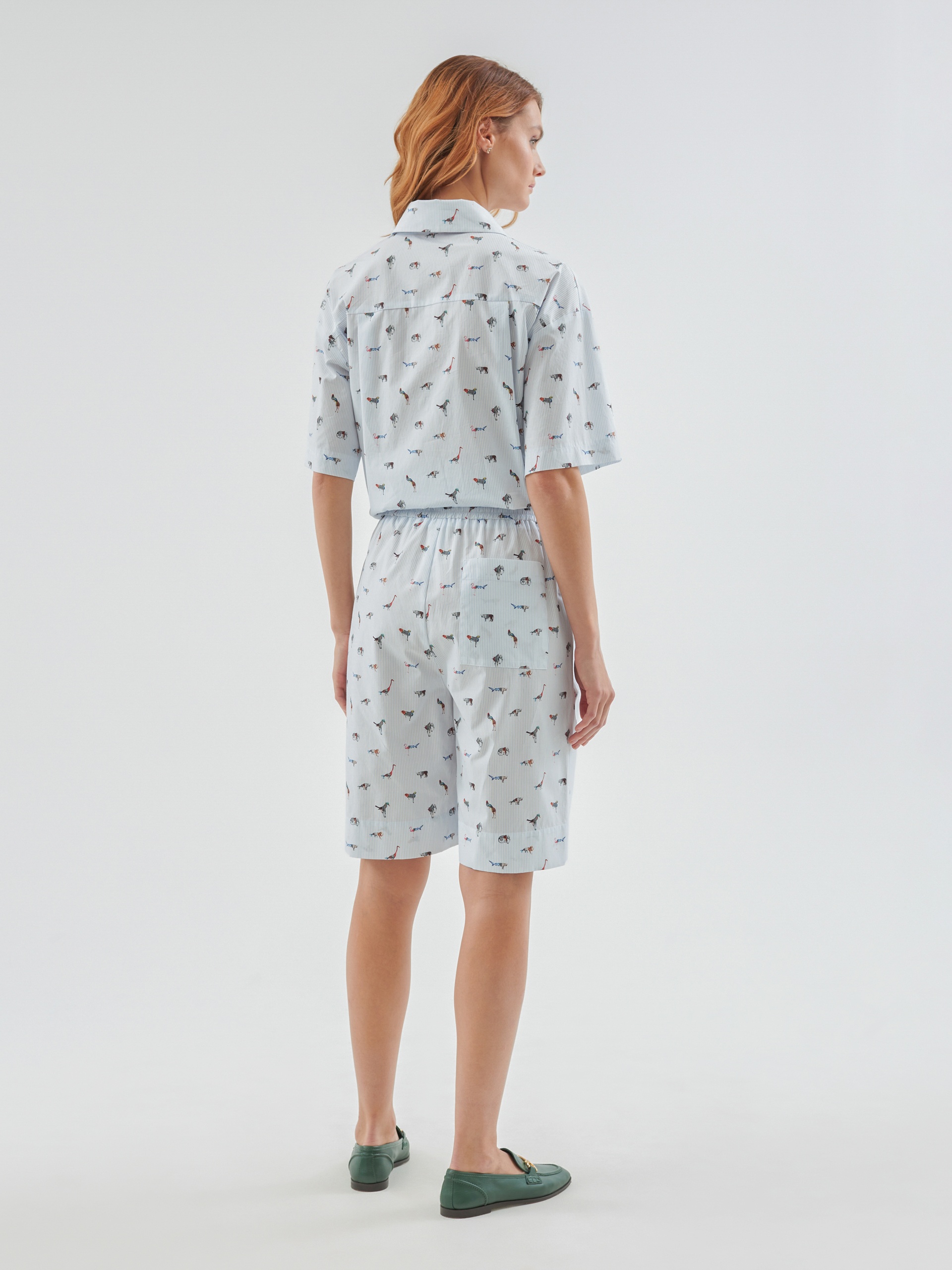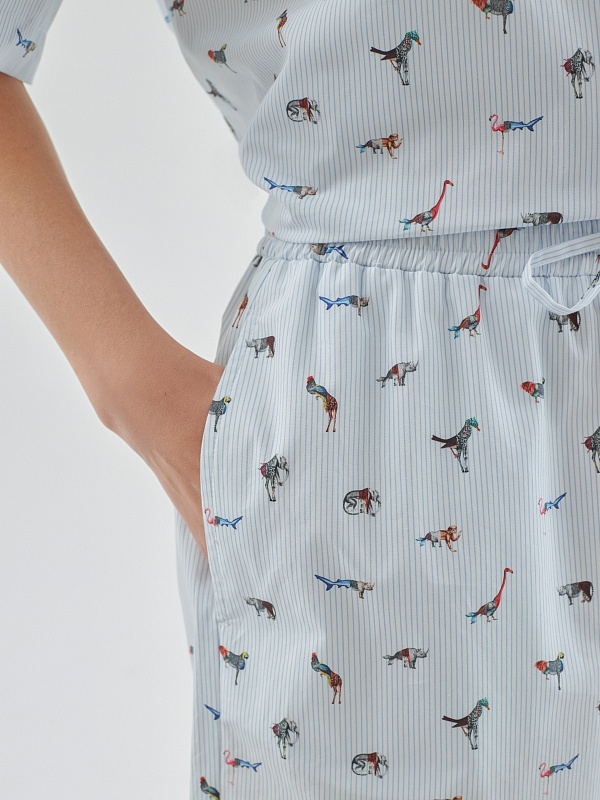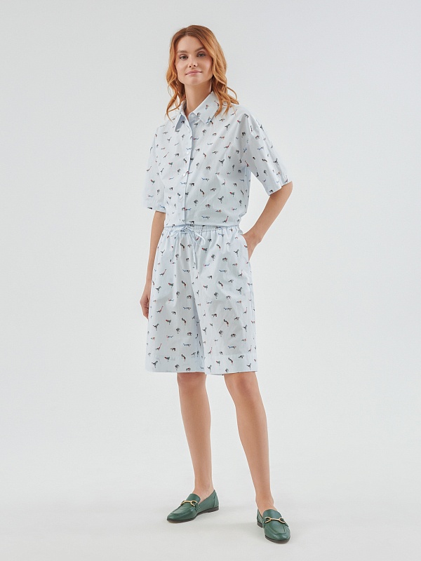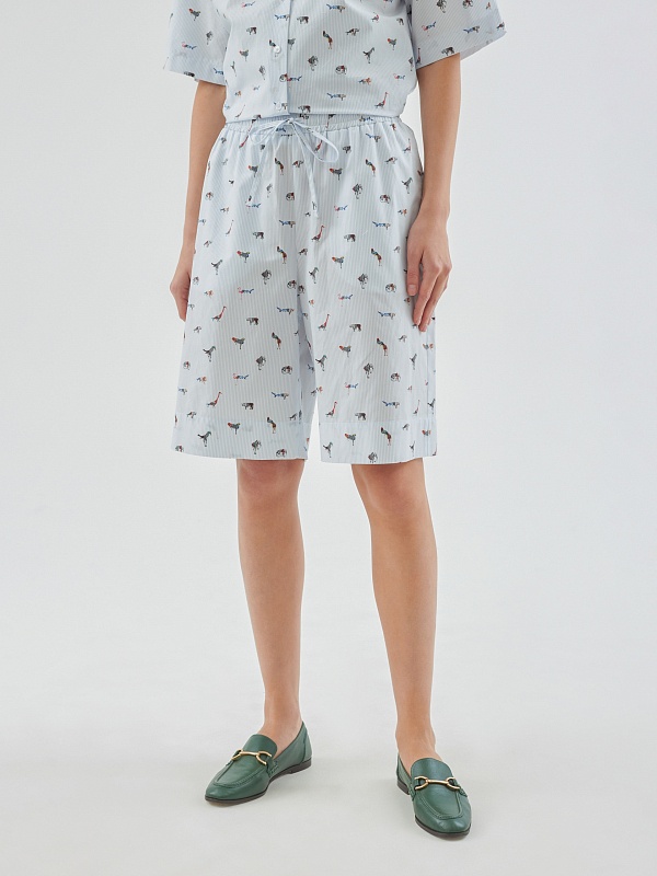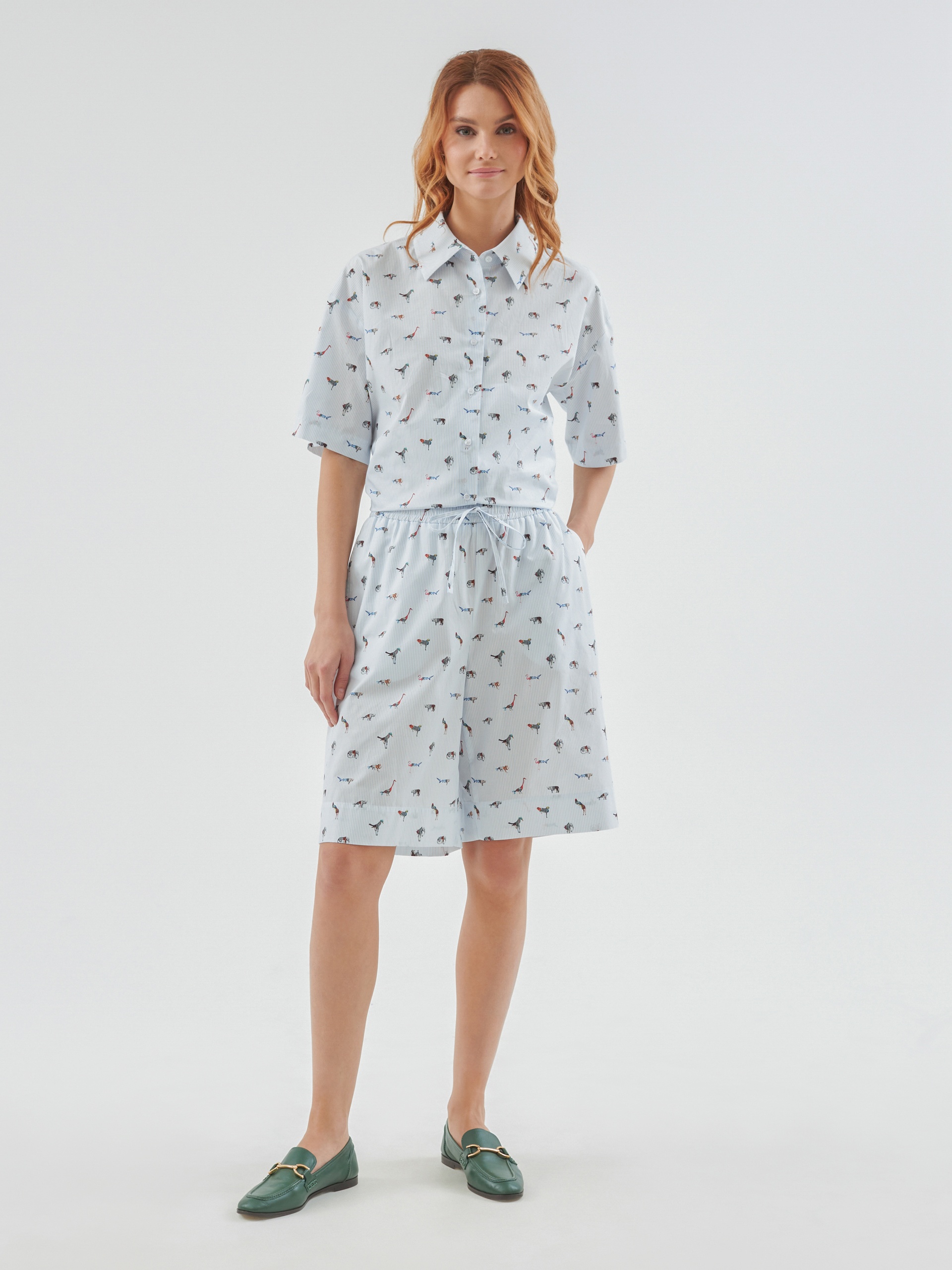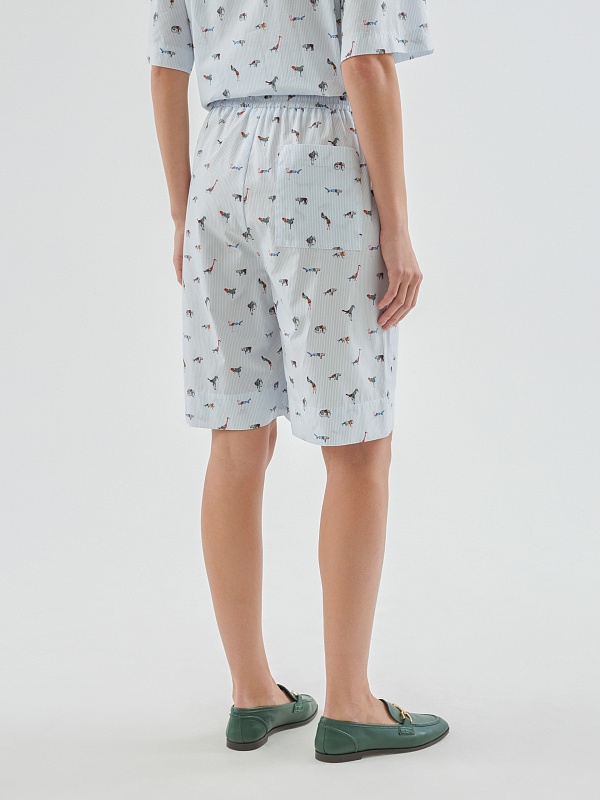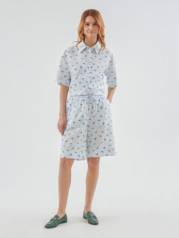 Свободные широкие шорты на широком поясе с резинкой и кулиской. Шорты выполнены из 100% хлопка в принте с фантастическими животными. Шорты на сборке по поясу, на задней половине брюк есть один накладной карман.