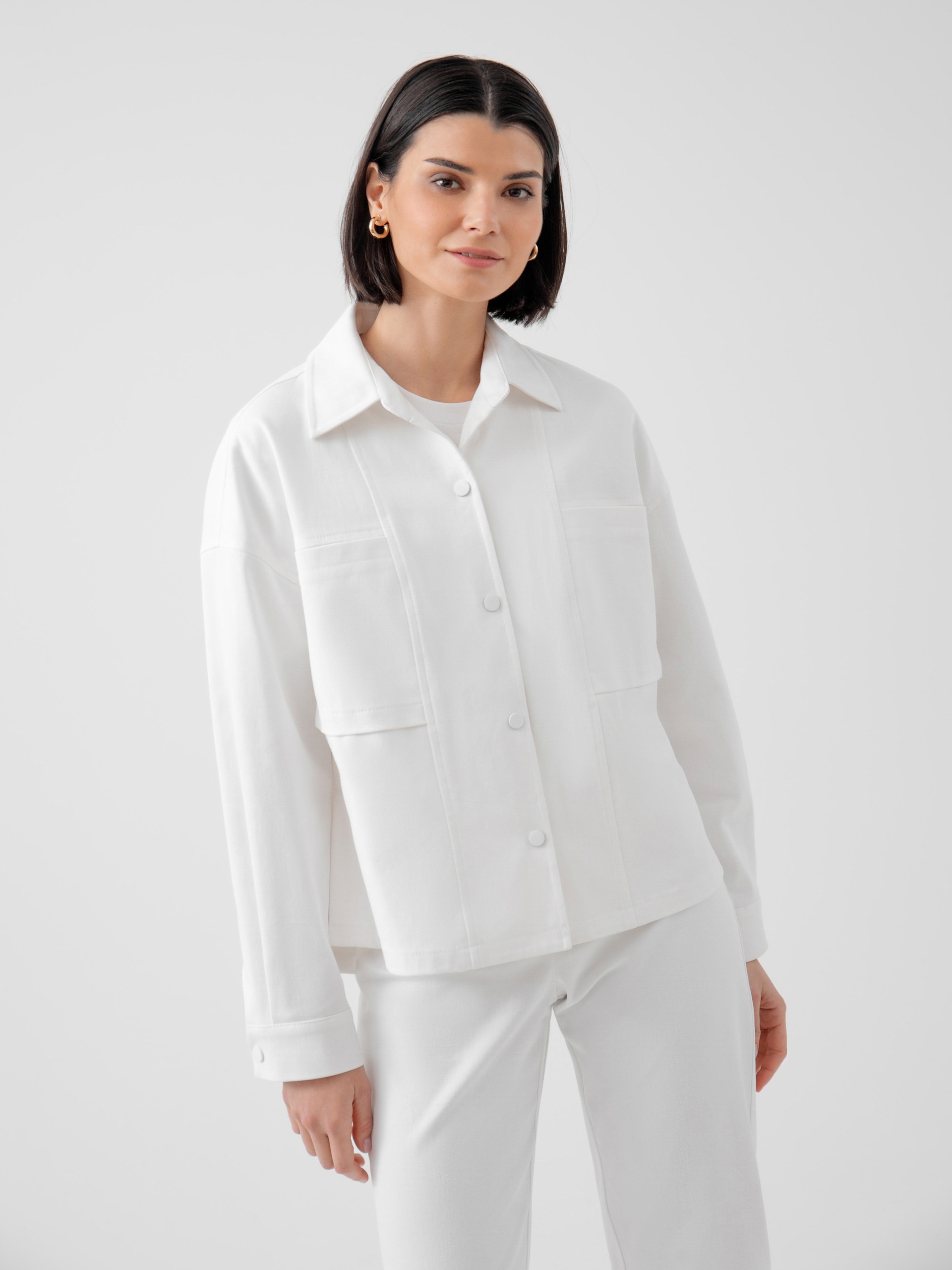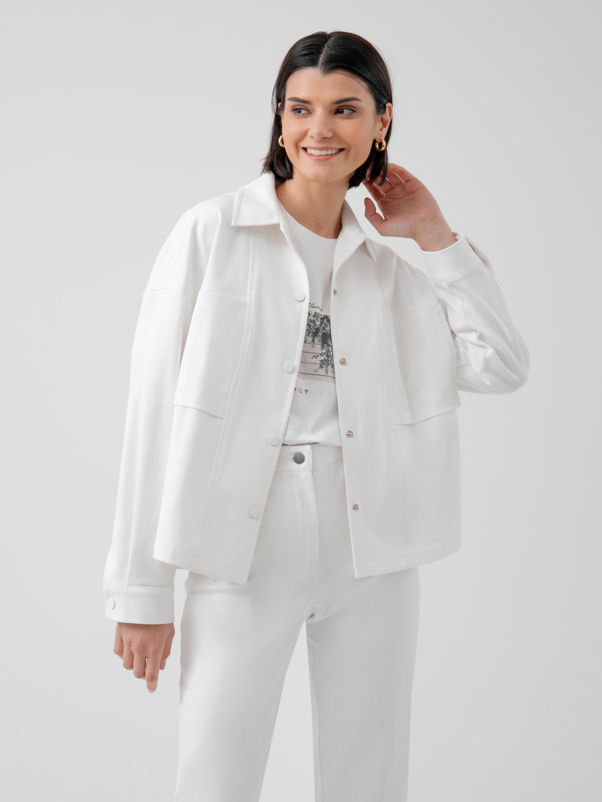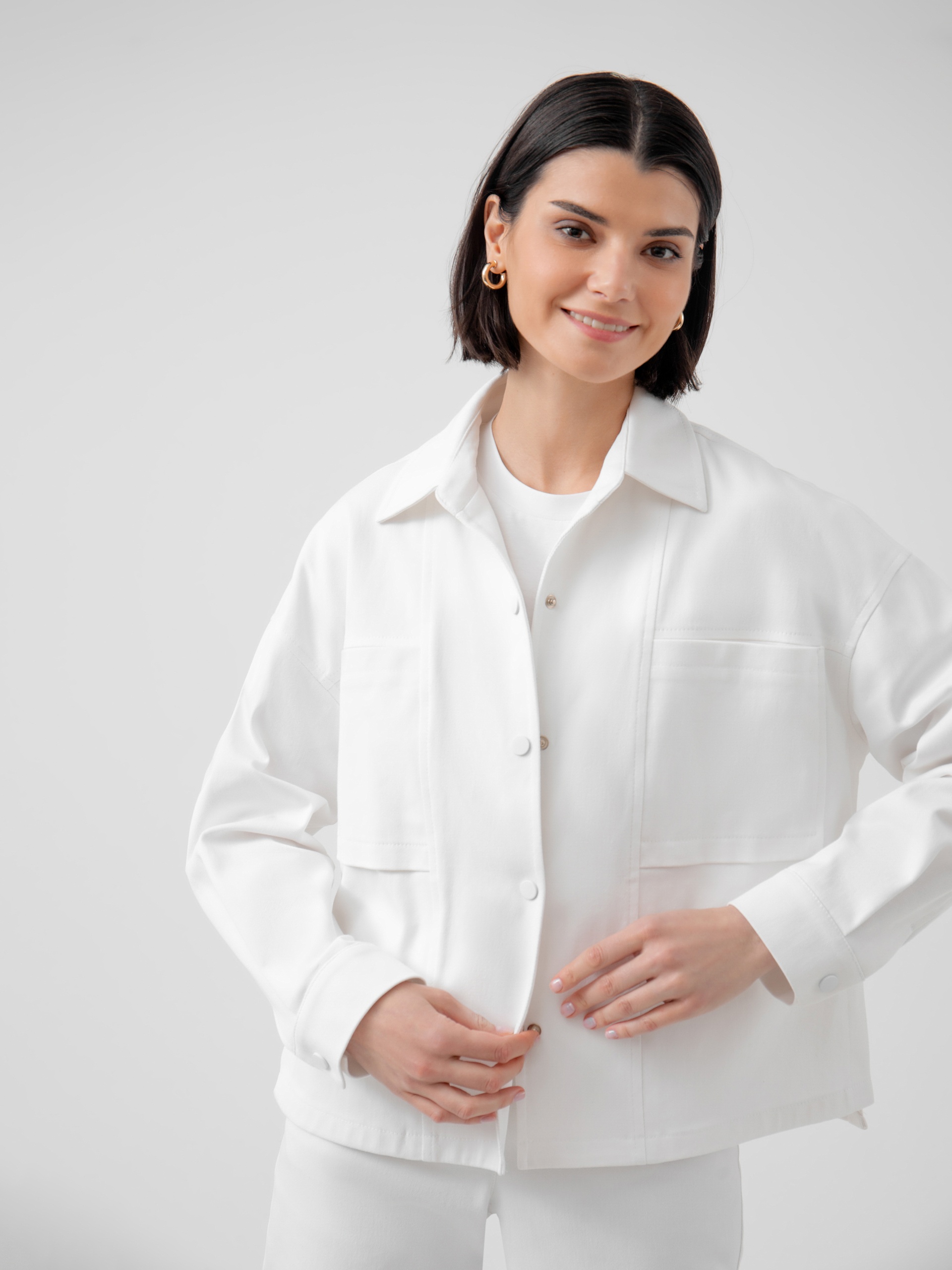 Жакет прямого силуэта с классическим отложным воротником, спущенным плечом и рукавом полной длины на манжете. Застежка спереди на кнопки в цвет ткани. Спереди рельефы и накладные карманы. Идеальный вариант для прохладной погоды. А белый цвет идеально сочетается с большим количеством повседневной одежды разных стилей.
