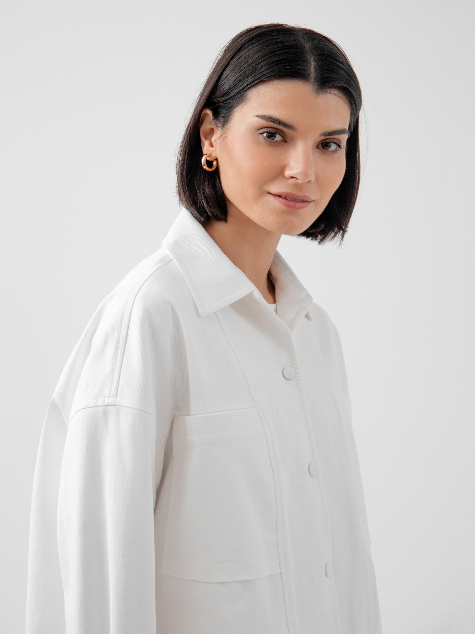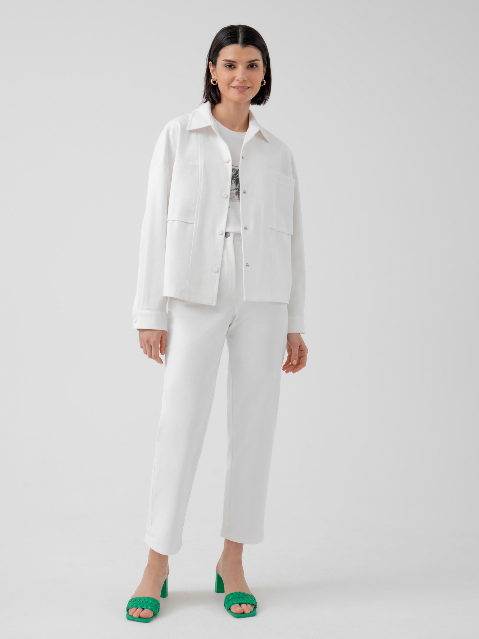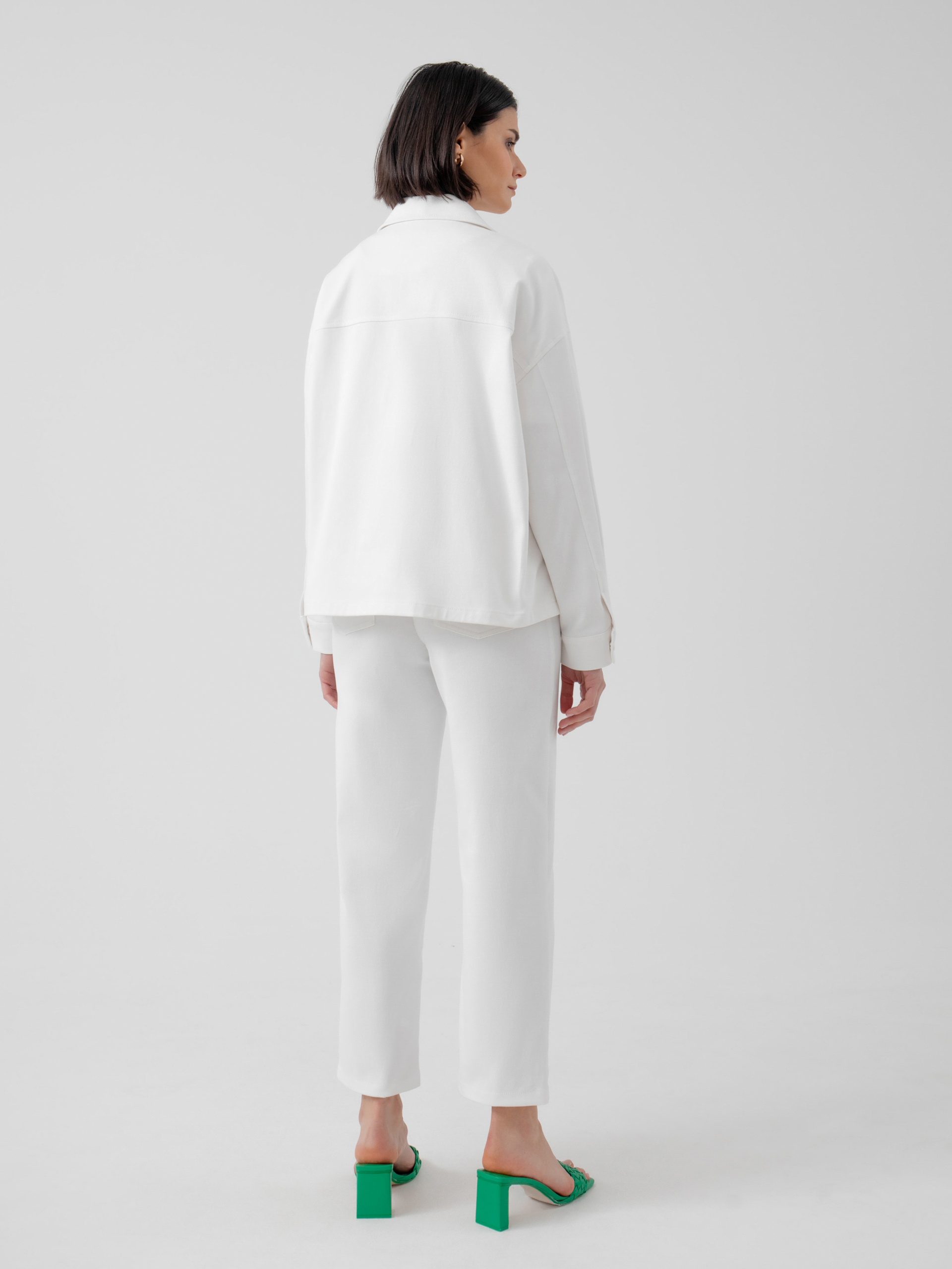 Жакет прямого силуэта с классическим отложным воротником, спущенным плечом и рукавом полной длины на манжете. Застежка спереди на кнопки в цвет ткани. Спереди рельефы и накладные карманы. Идеальный вариант для прохладной погоды. А белый цвет идеально сочетается с большим количеством повседневной одежды разных стилей.