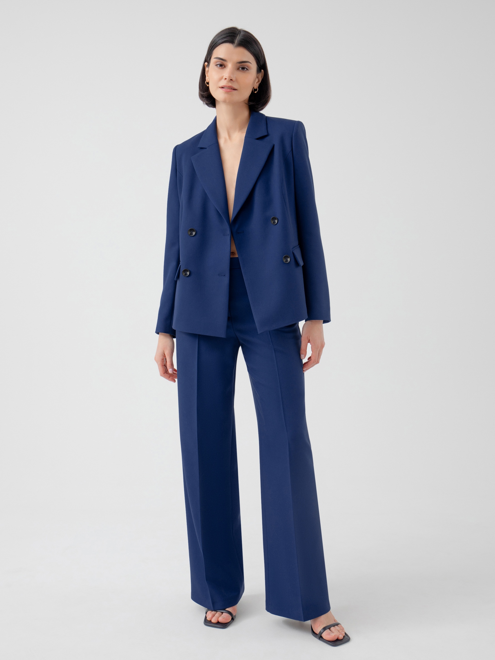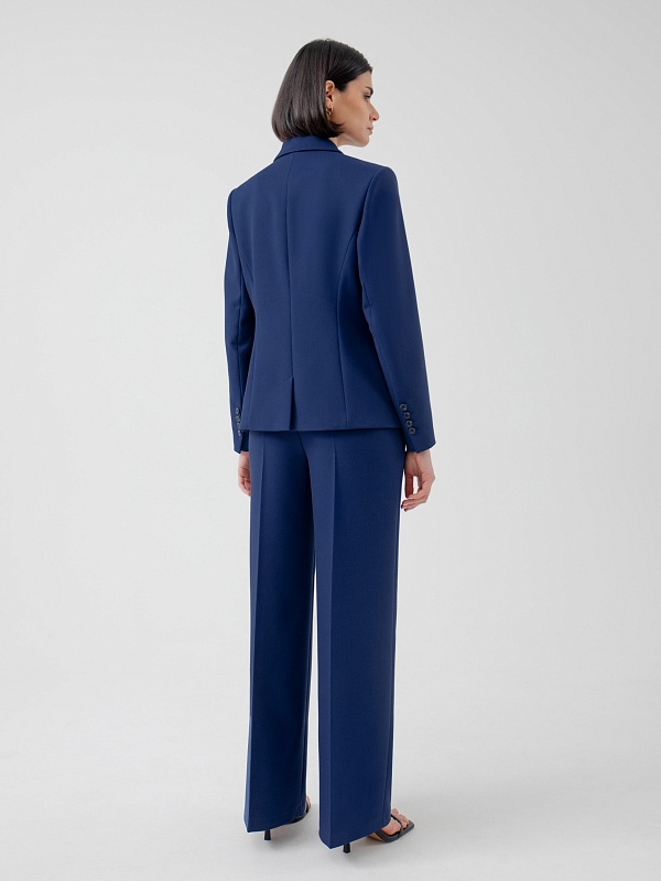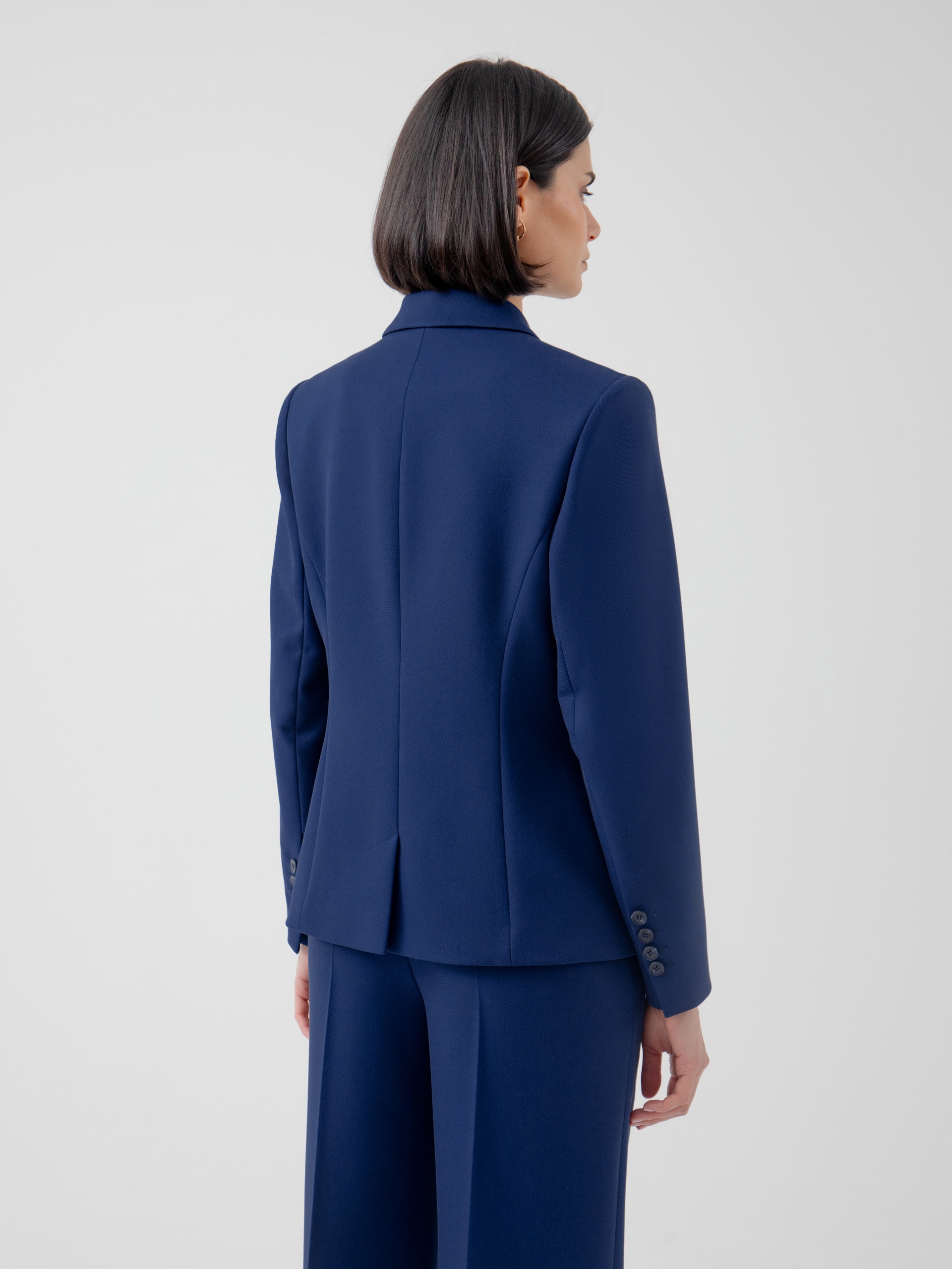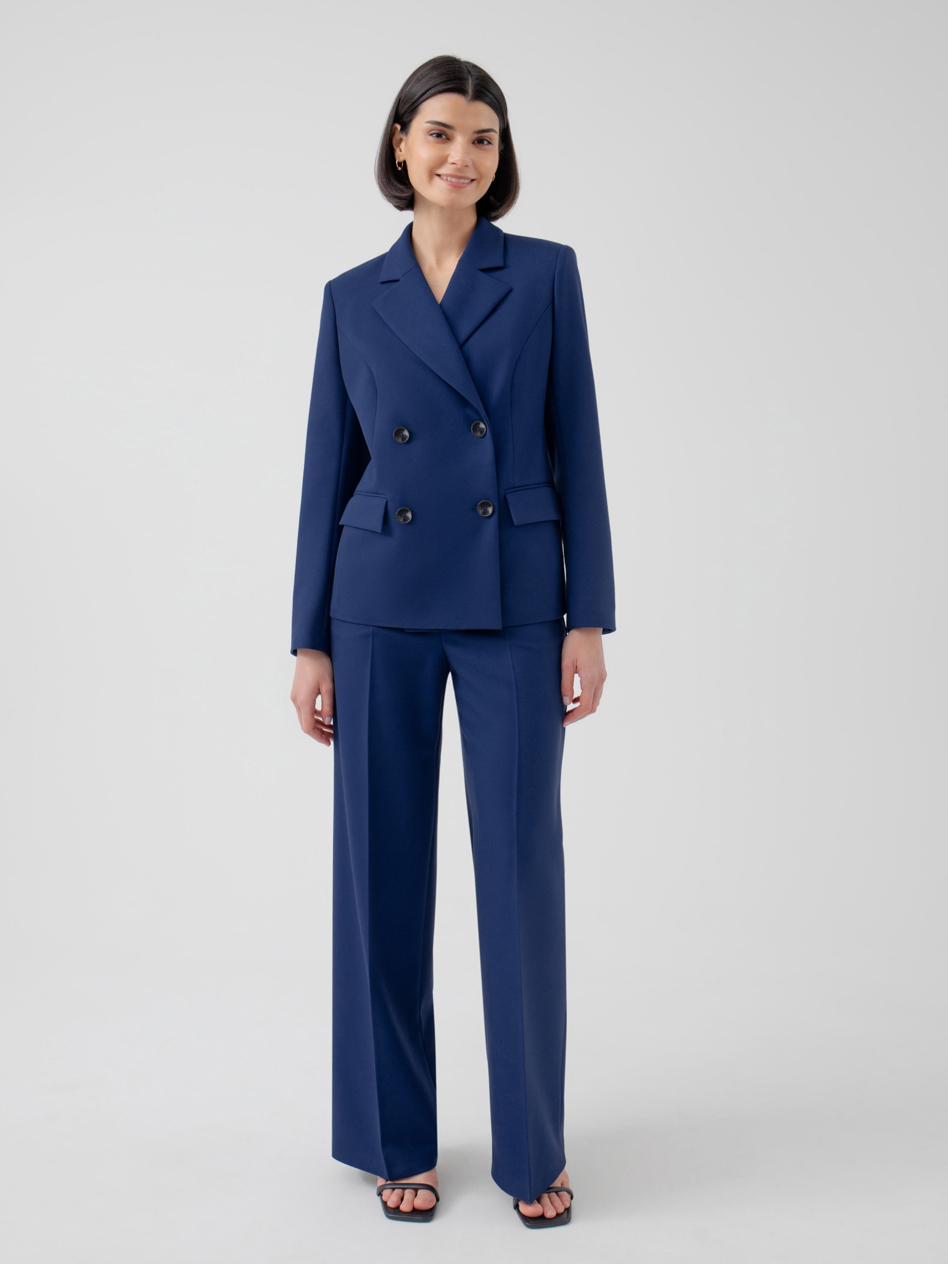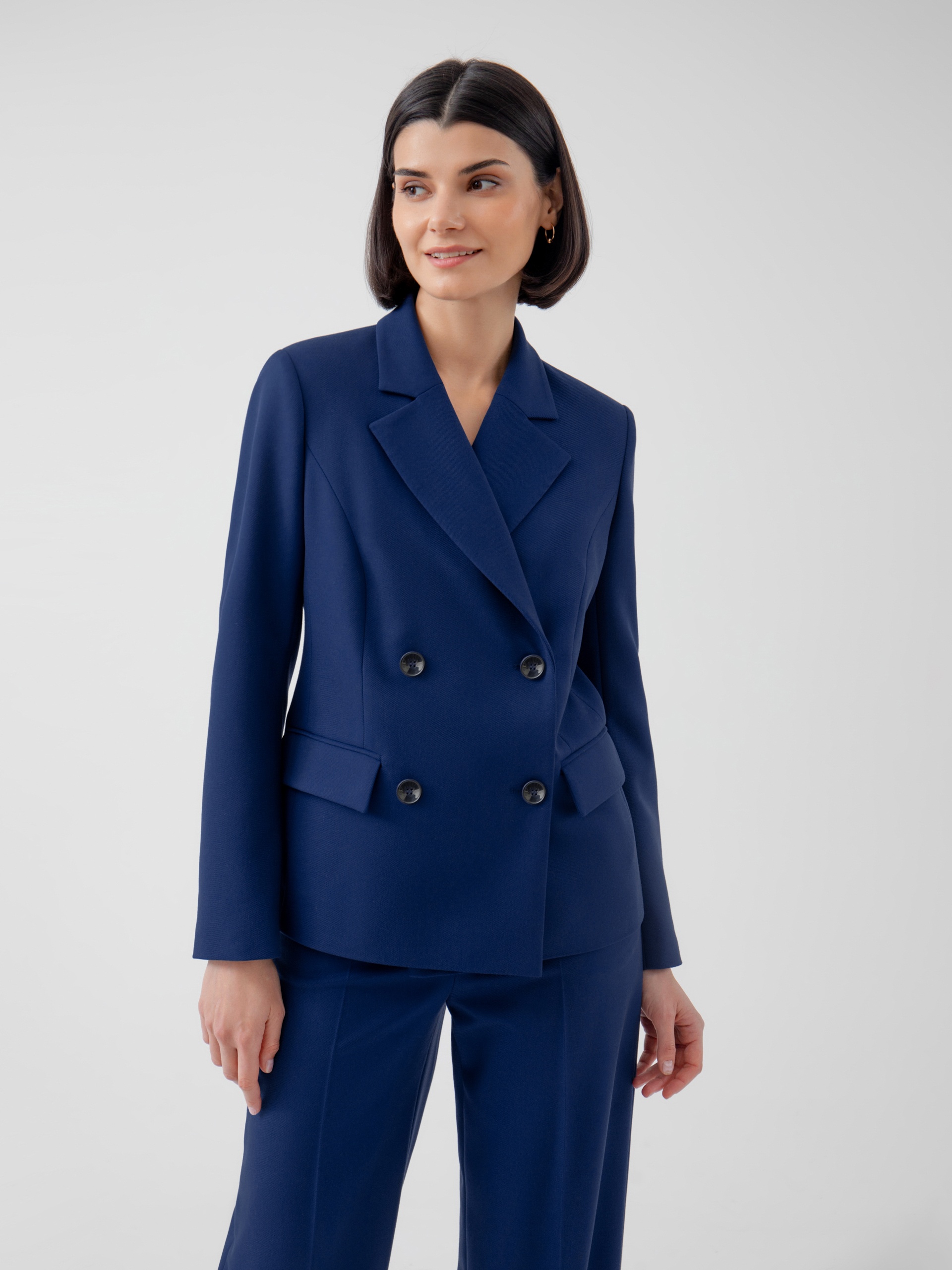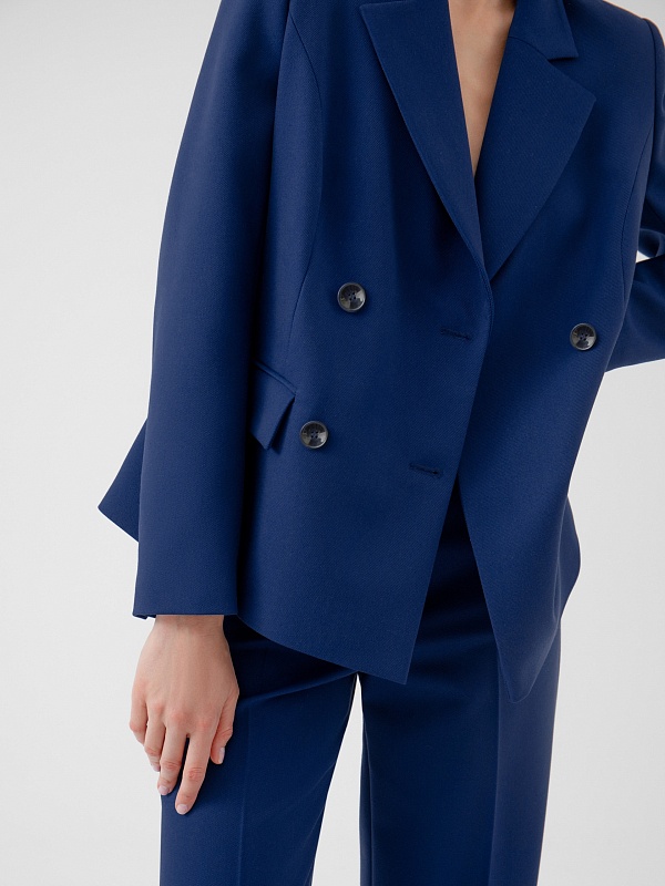 Двубортный жакет из костюмной ткани василькового цвета на подкладке полуприлегающего силуэта с эффектными пуговицами и английским воротником. Рукав втачной полной длины. Спереди рельефы и карманы с клапанами.