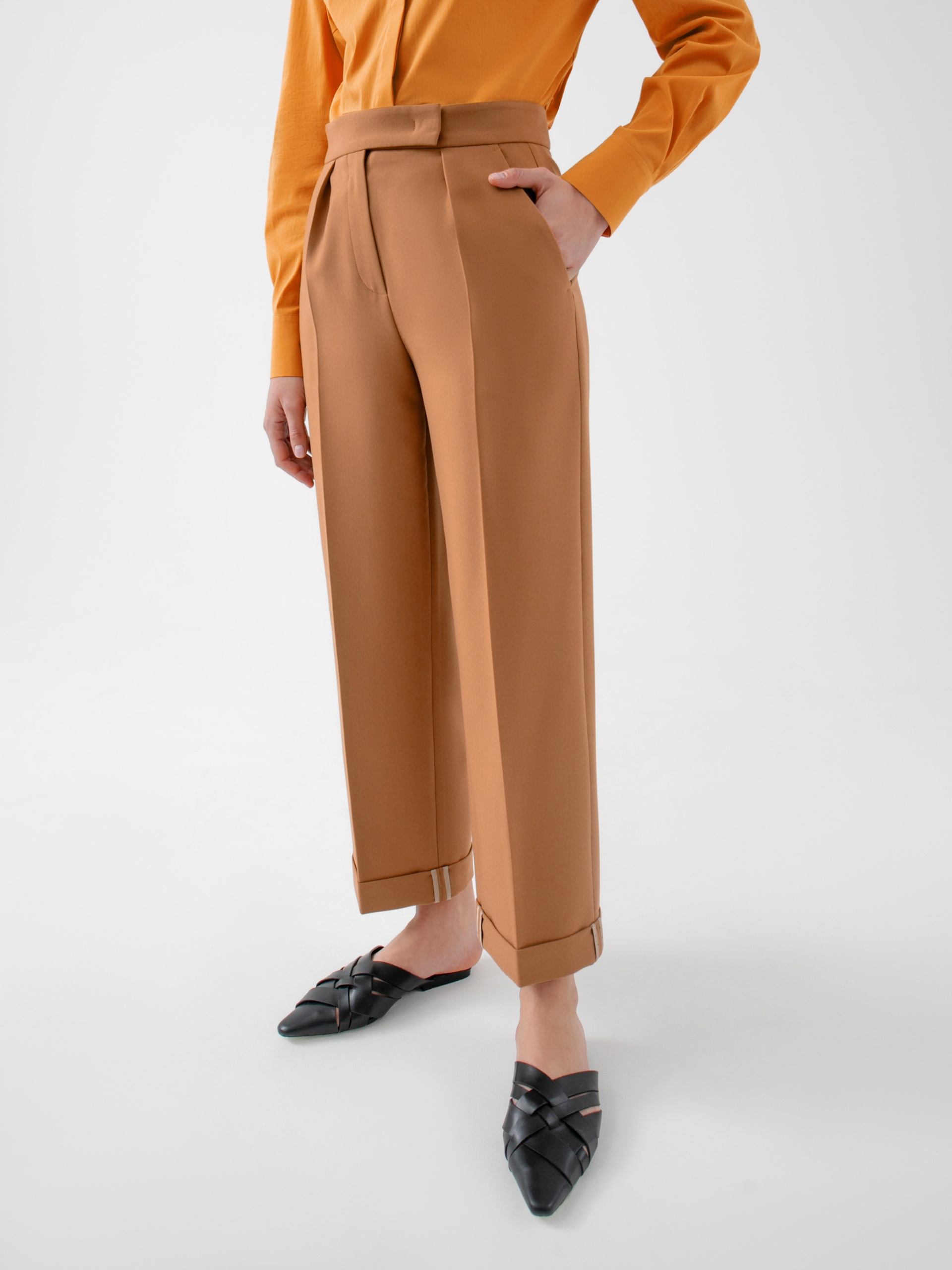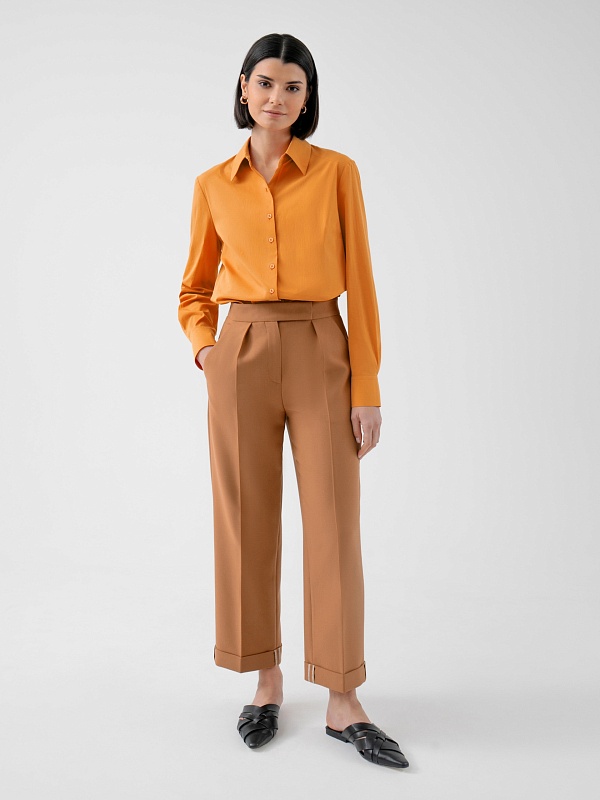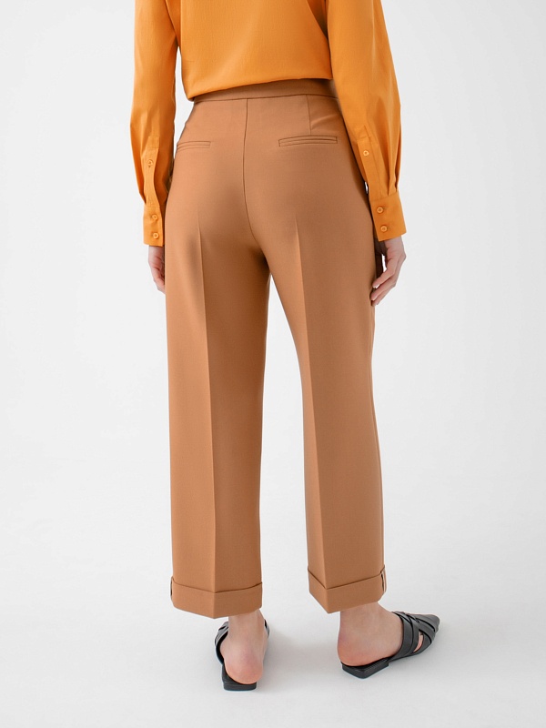 Стильные брюки из костюмной ткани со стрелками прямого силуэта на притачном поясе со шлевками. Спереди боковые карманы, складки и застёжка на молнию. По низу изделия широкие отвороты. Эта модель идеально сочетается с жакетом из этой же ткани.