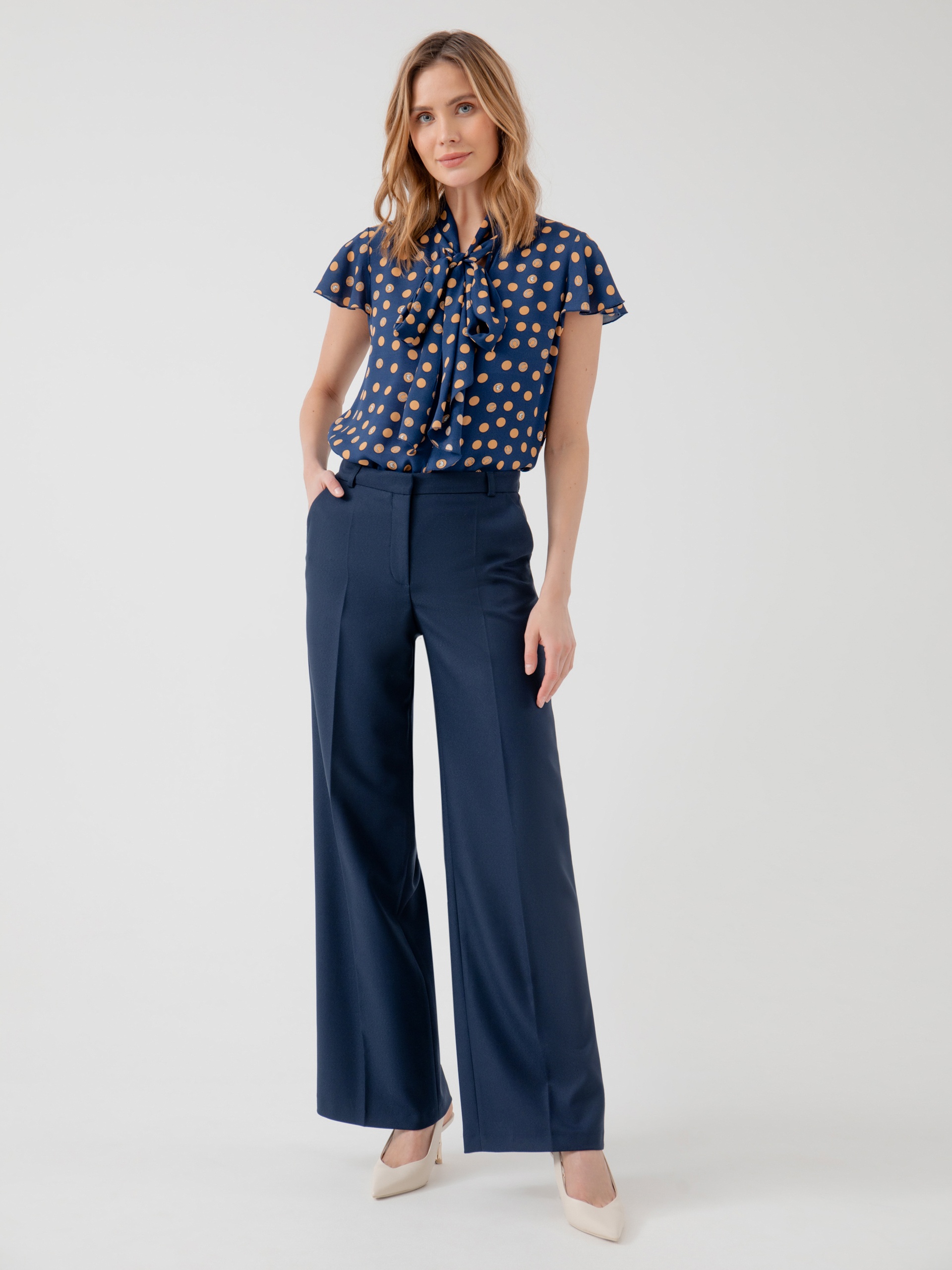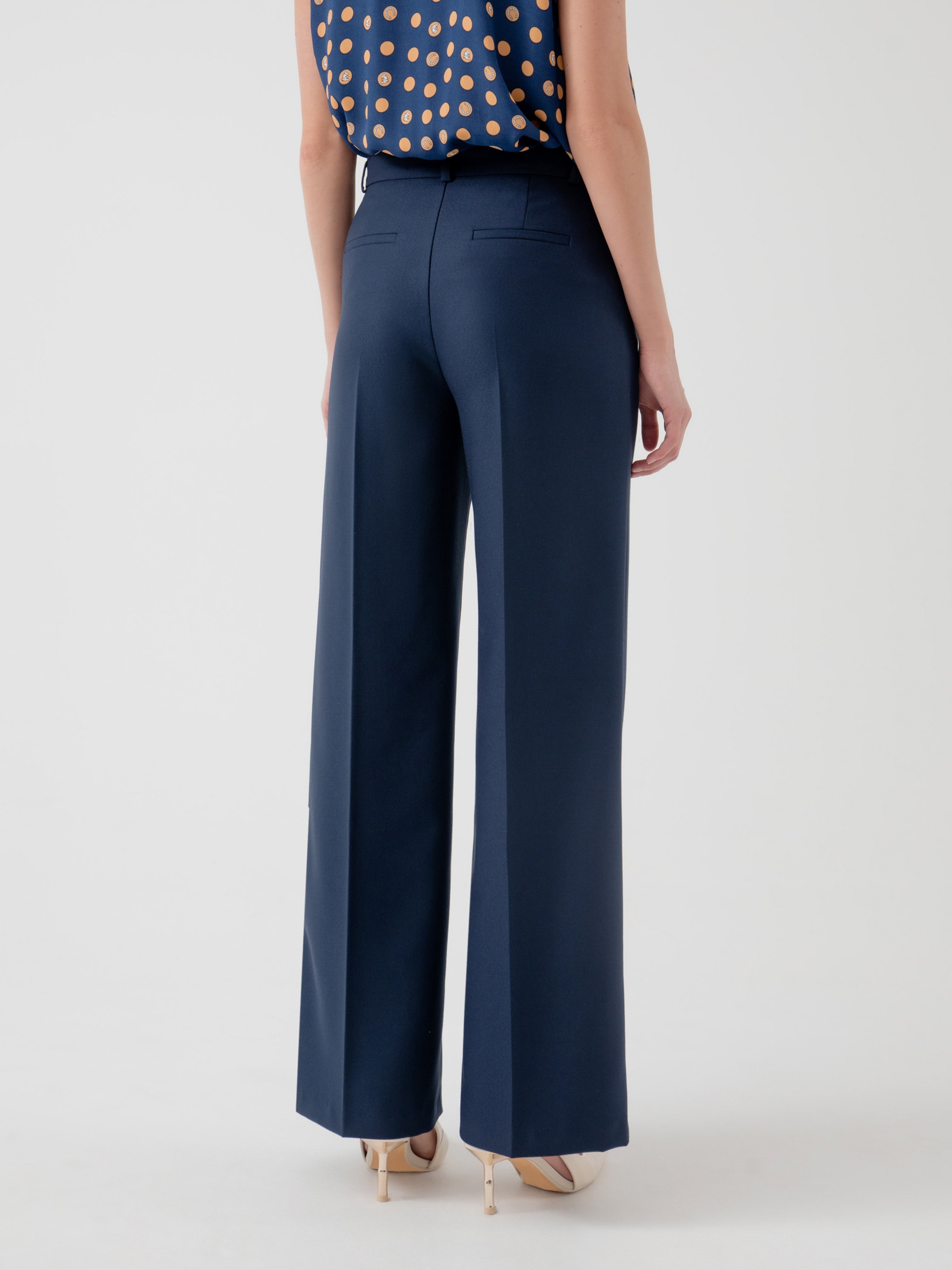 Прямые классические брюки со стрелками на низкой посадке. Боковые карманы. Застежка спереди на молнию и пуговица. Брюки выполнены из костюмной ткани темно-синего цвета.