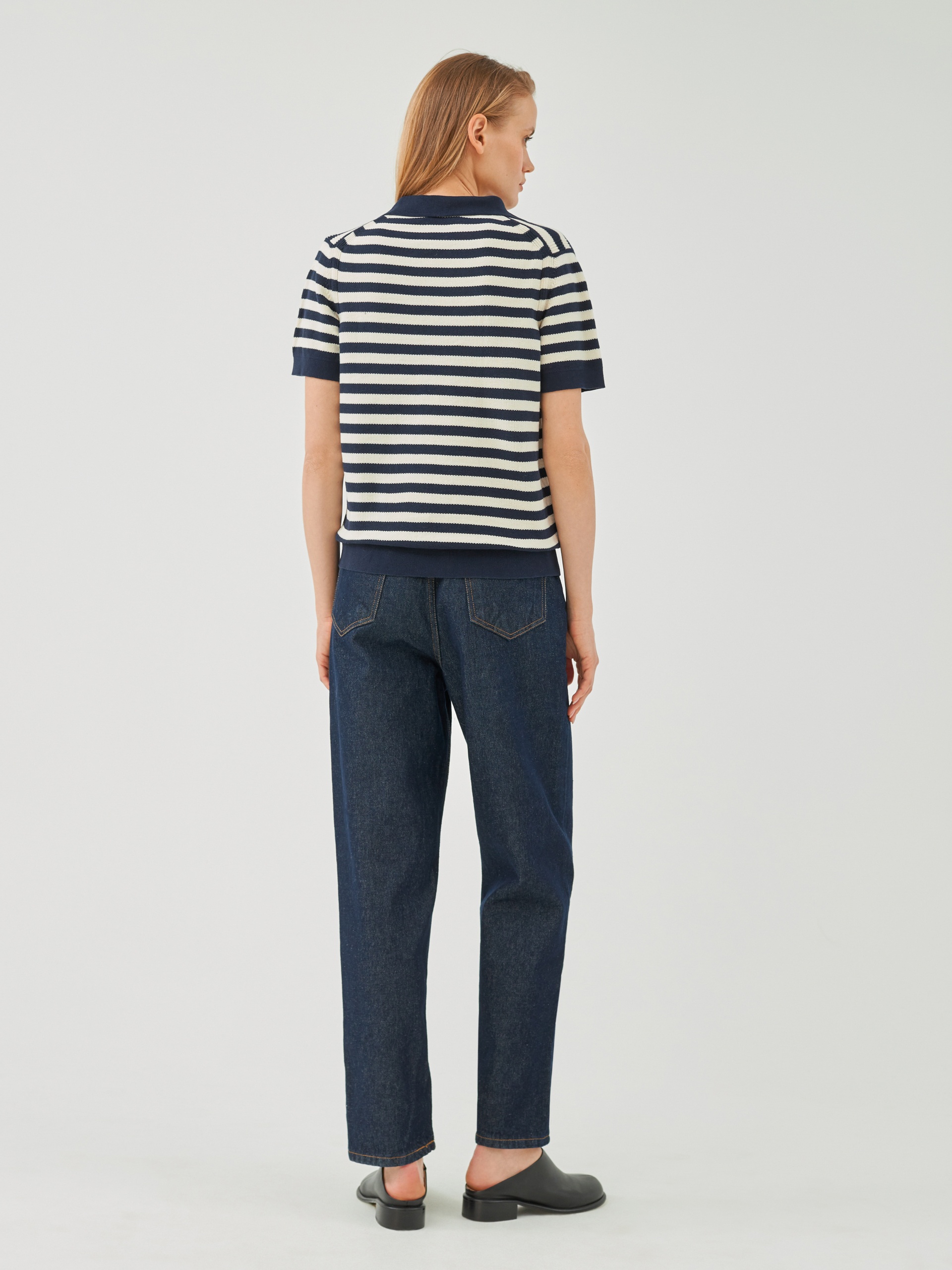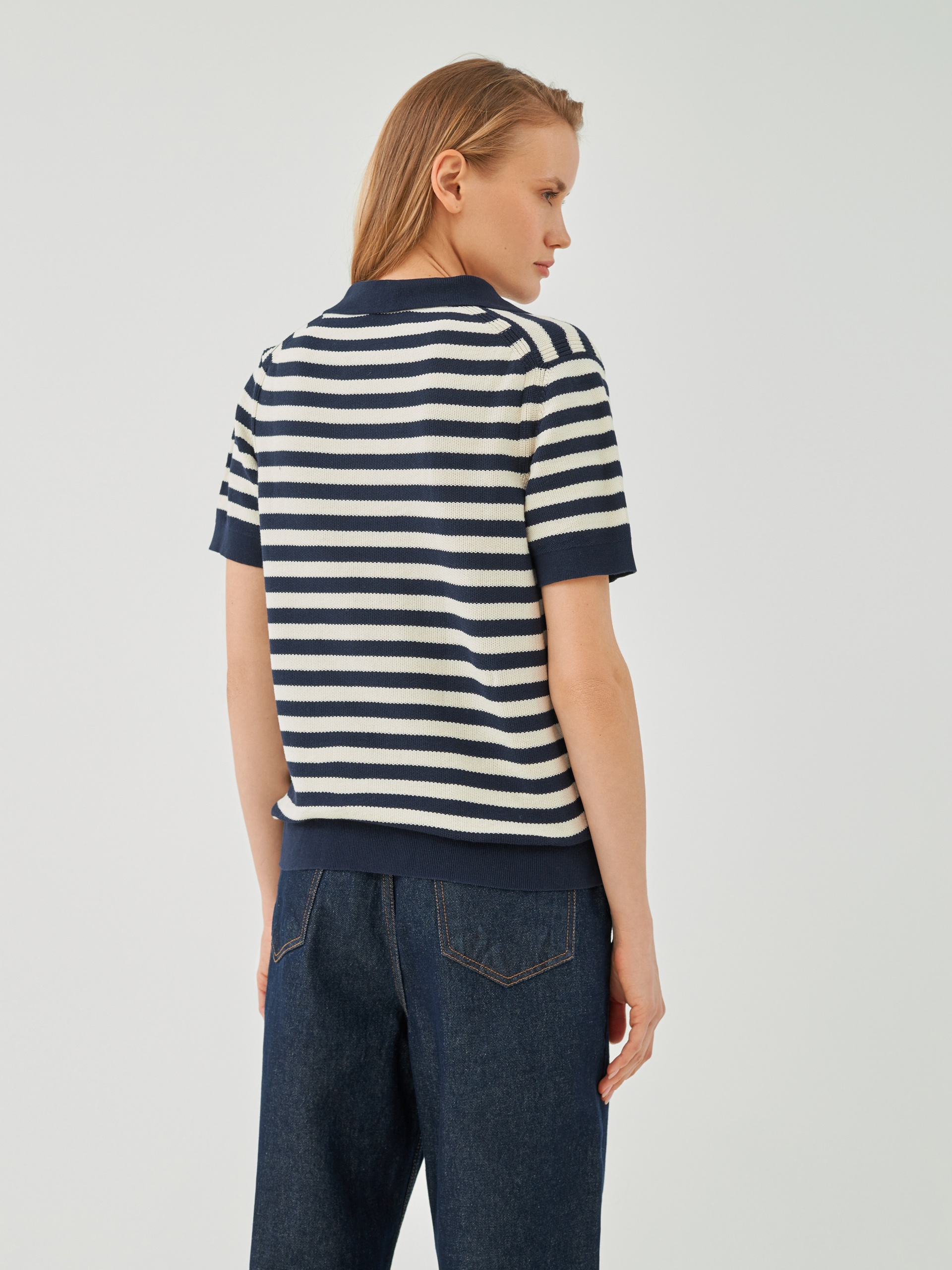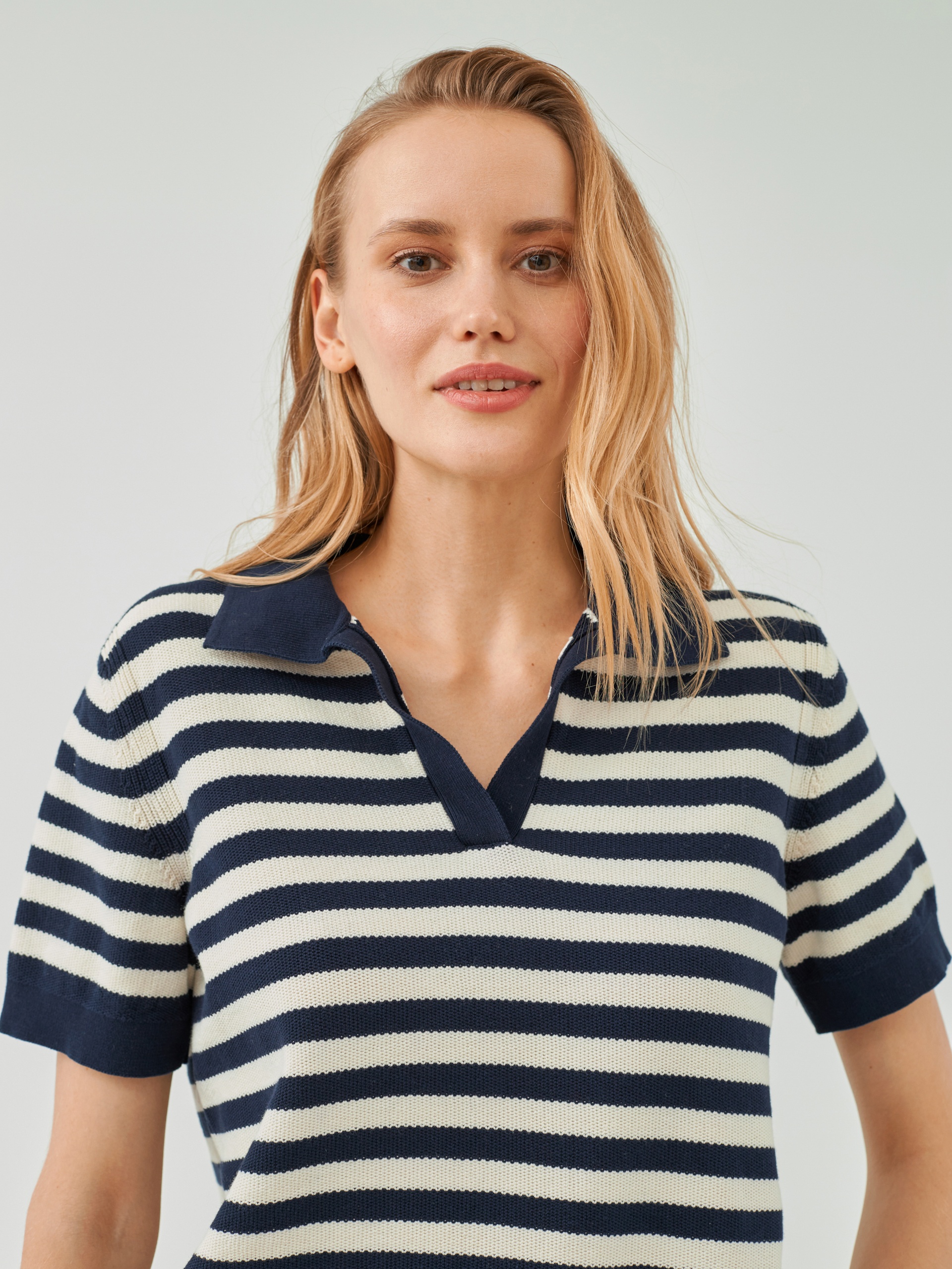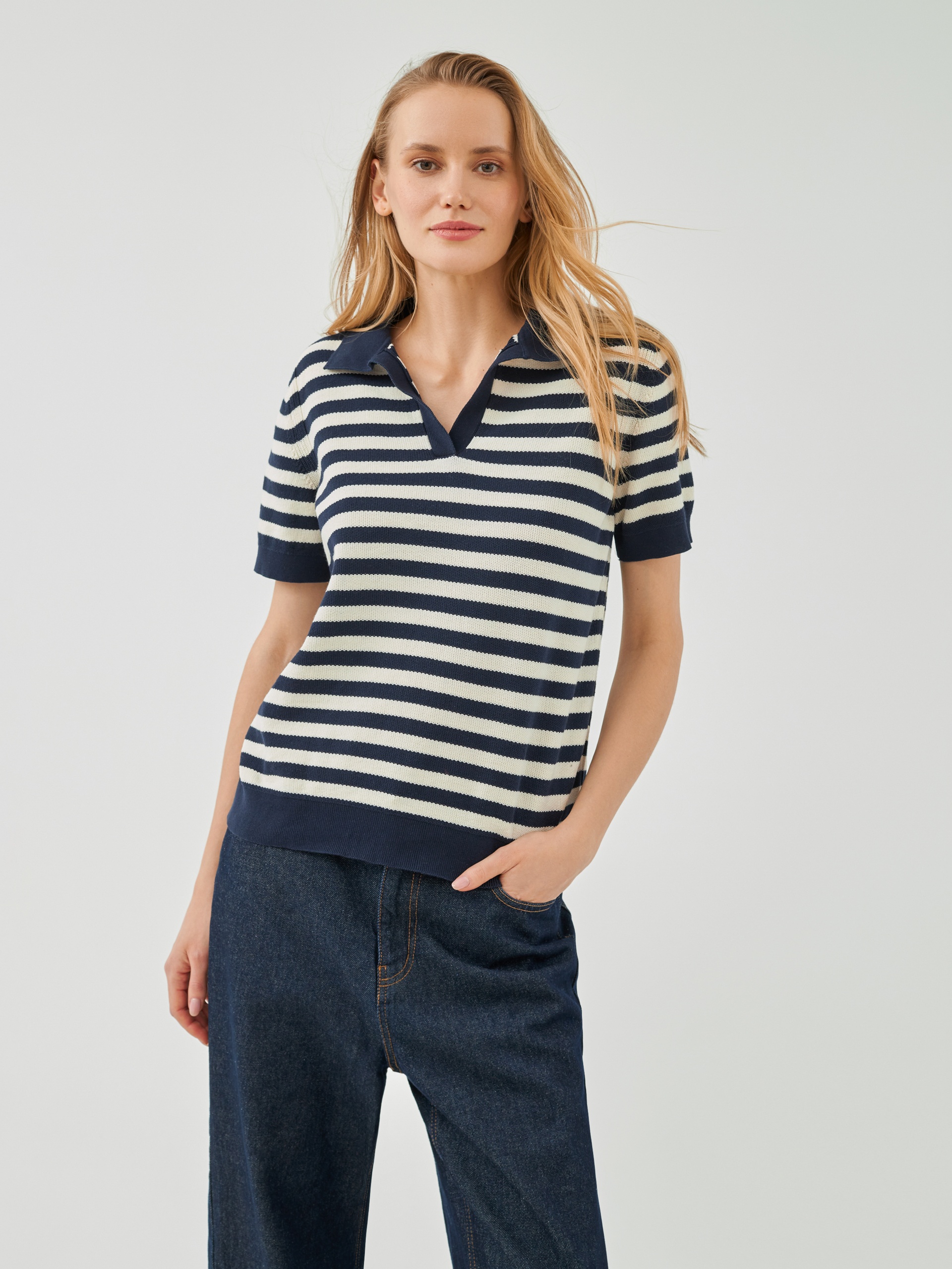 Джемпер прямого силуэта с V-образным вырезом и воротником-поло является базовым, однако бретонская полоса темно-синего цвета освежает и придает джемперу эстетику круизного вояжа.