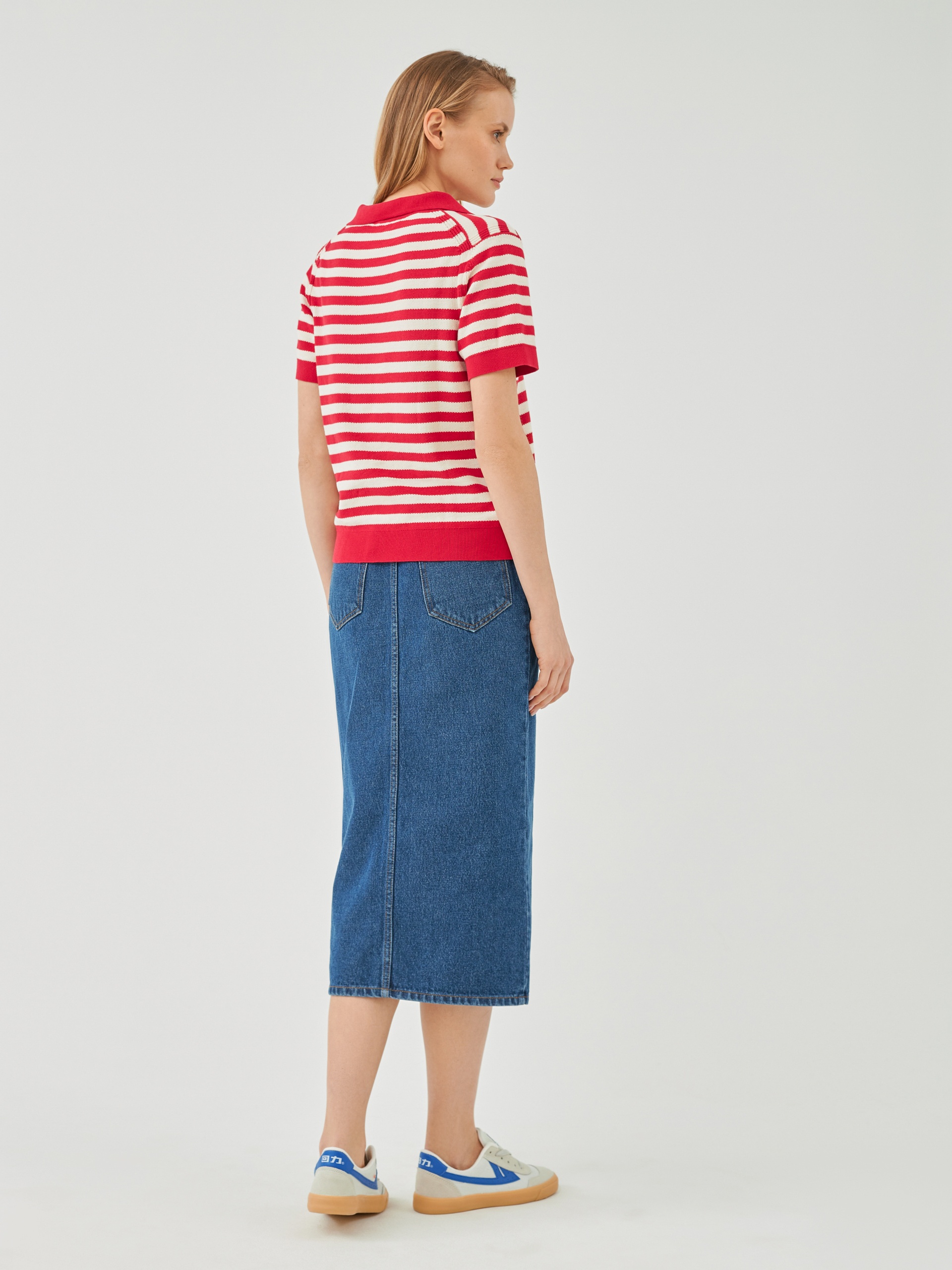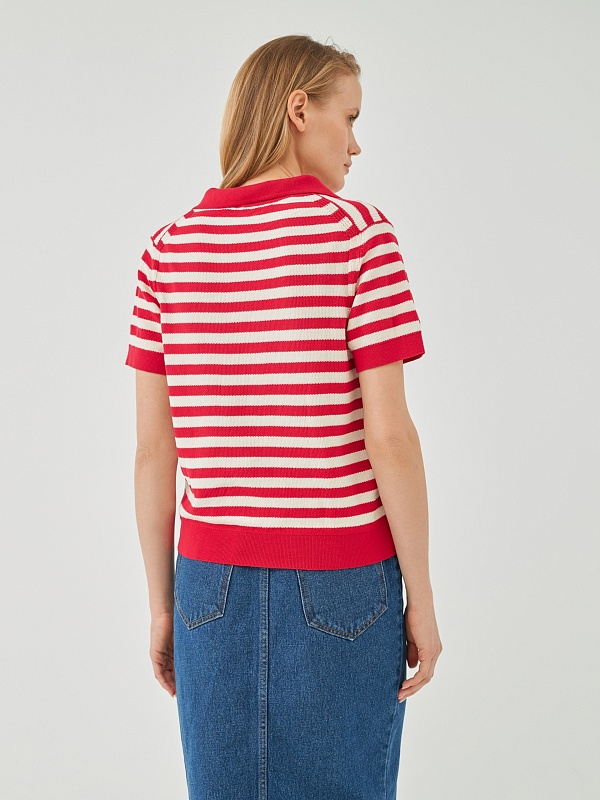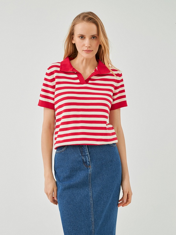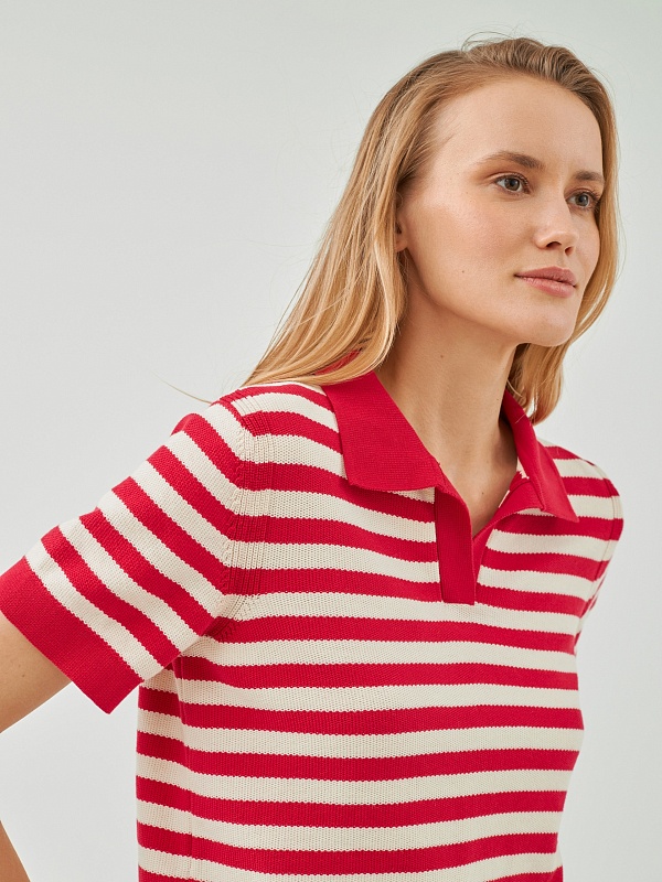 Джемпер прямого силуэта с V-образным вырезом и воротником поло является базовым, однако бретонская полоса красного цвета освежает и придает джемперу эстетику круизного вояжа.