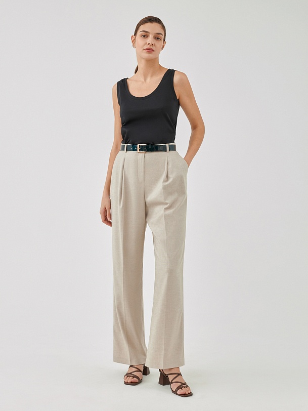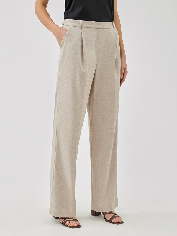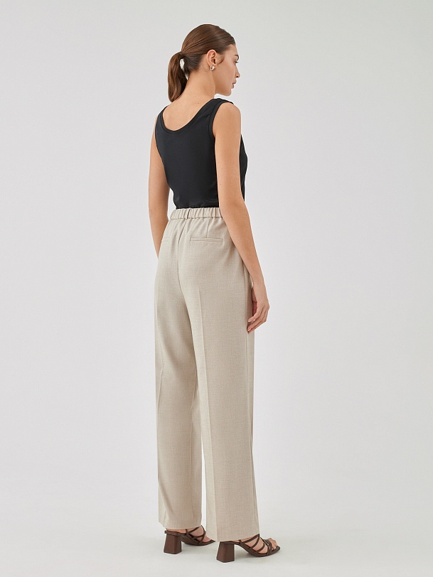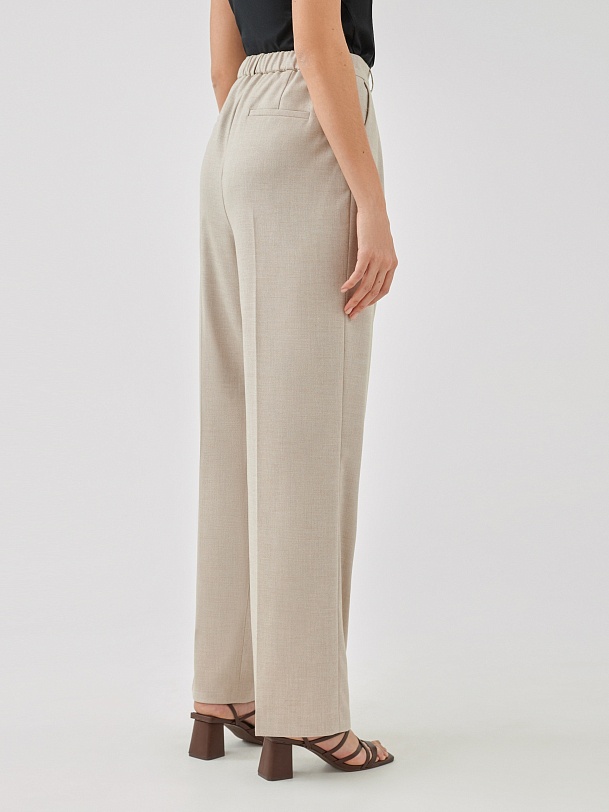 Стильные широкие брюки прямого струящегося силуэта со стрелками из костюмной ткани в стиле сафари на притачном поясе со шлевками. С частичной резинкой для наилучшей посадки. Застежка спереди на молнию и крючок. По бокам находятся карманы. Модель идеально сочетается с жакетом из такой же ткани. Брюки полной длины.