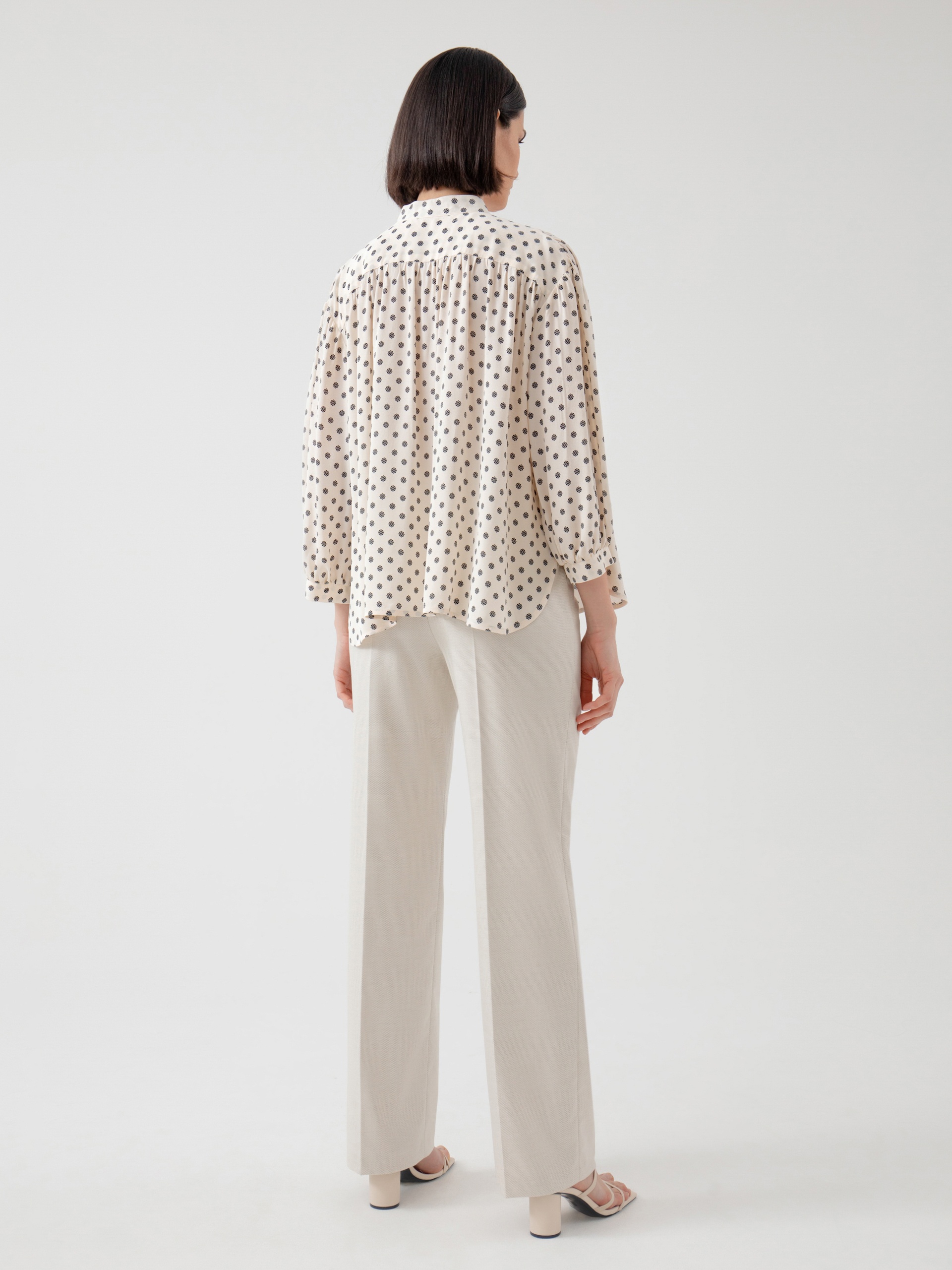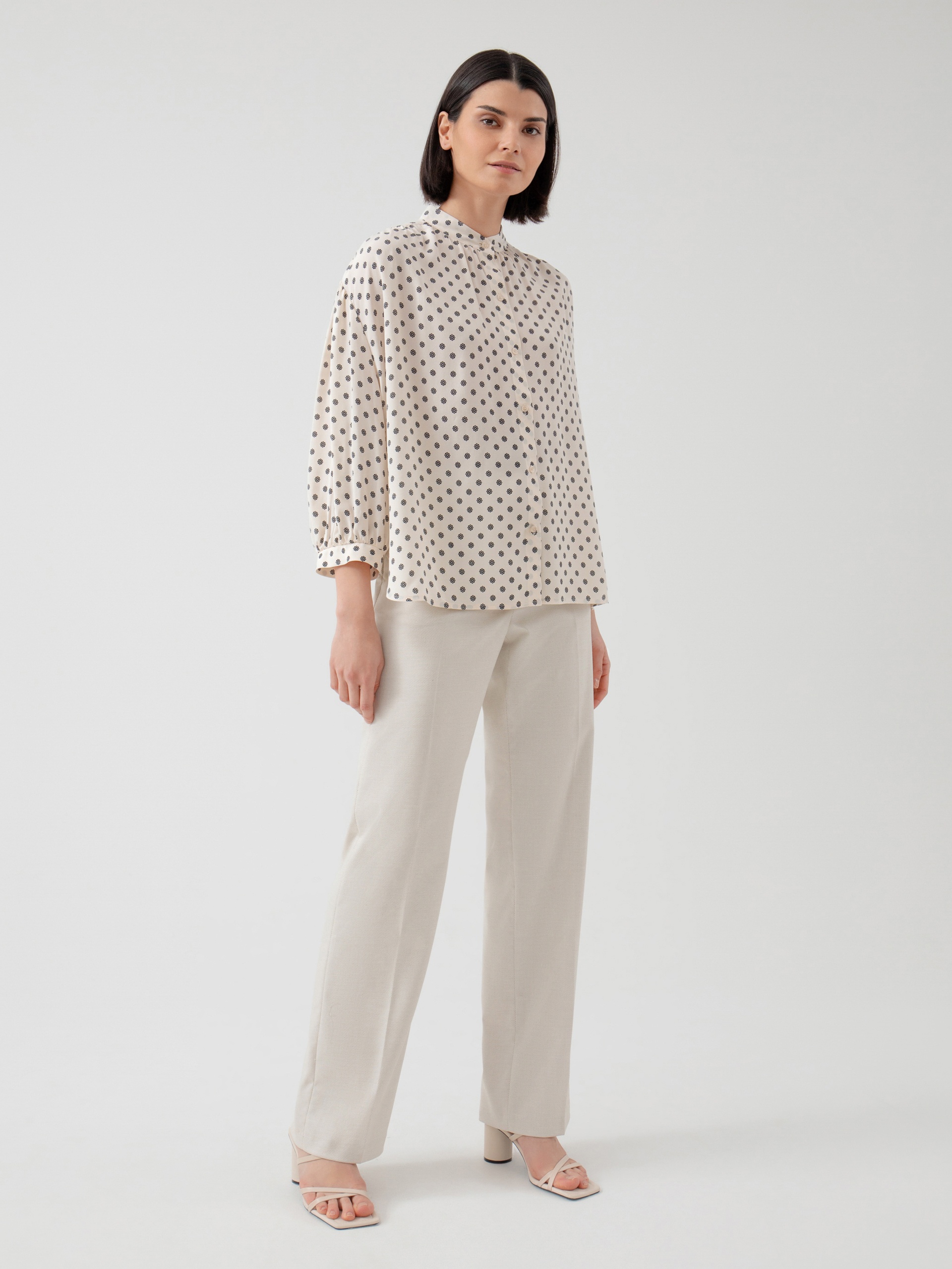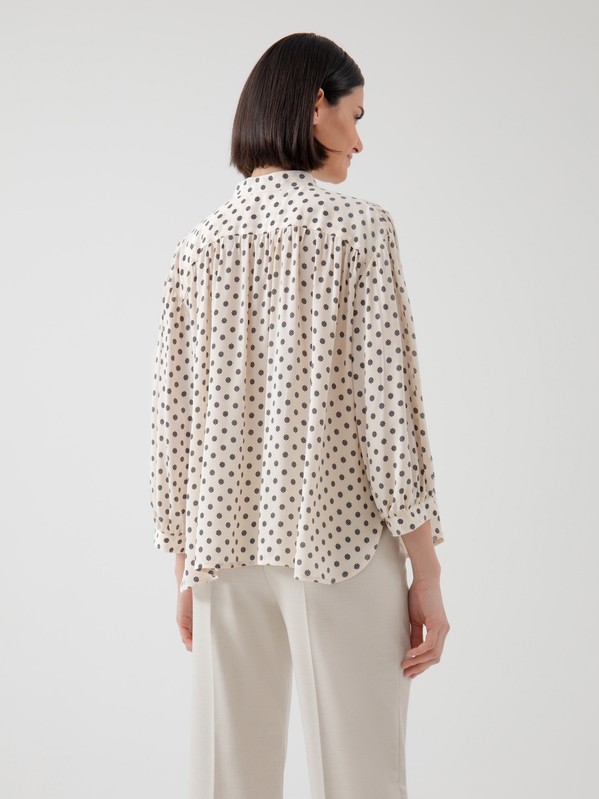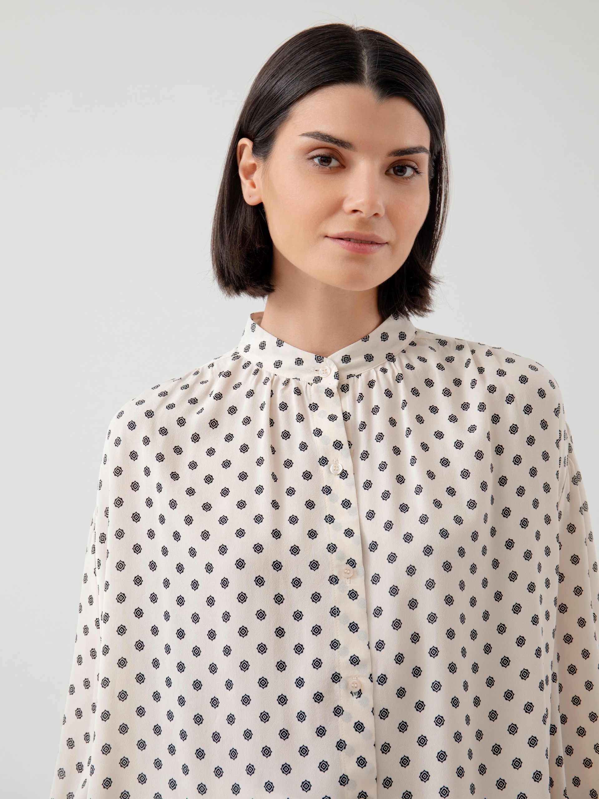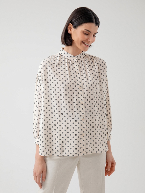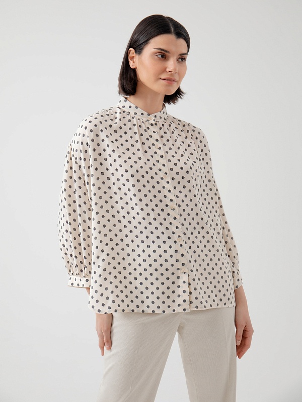 Свободная блузка из вискозной ткани с геометрическим принтом. С воротником стойкой, спущенным плечом со сборками и планкой с блузочными пуговицами. Рукав буф на манжете. Блуза является хорошим базовым вариантом для повседневного гардероба.