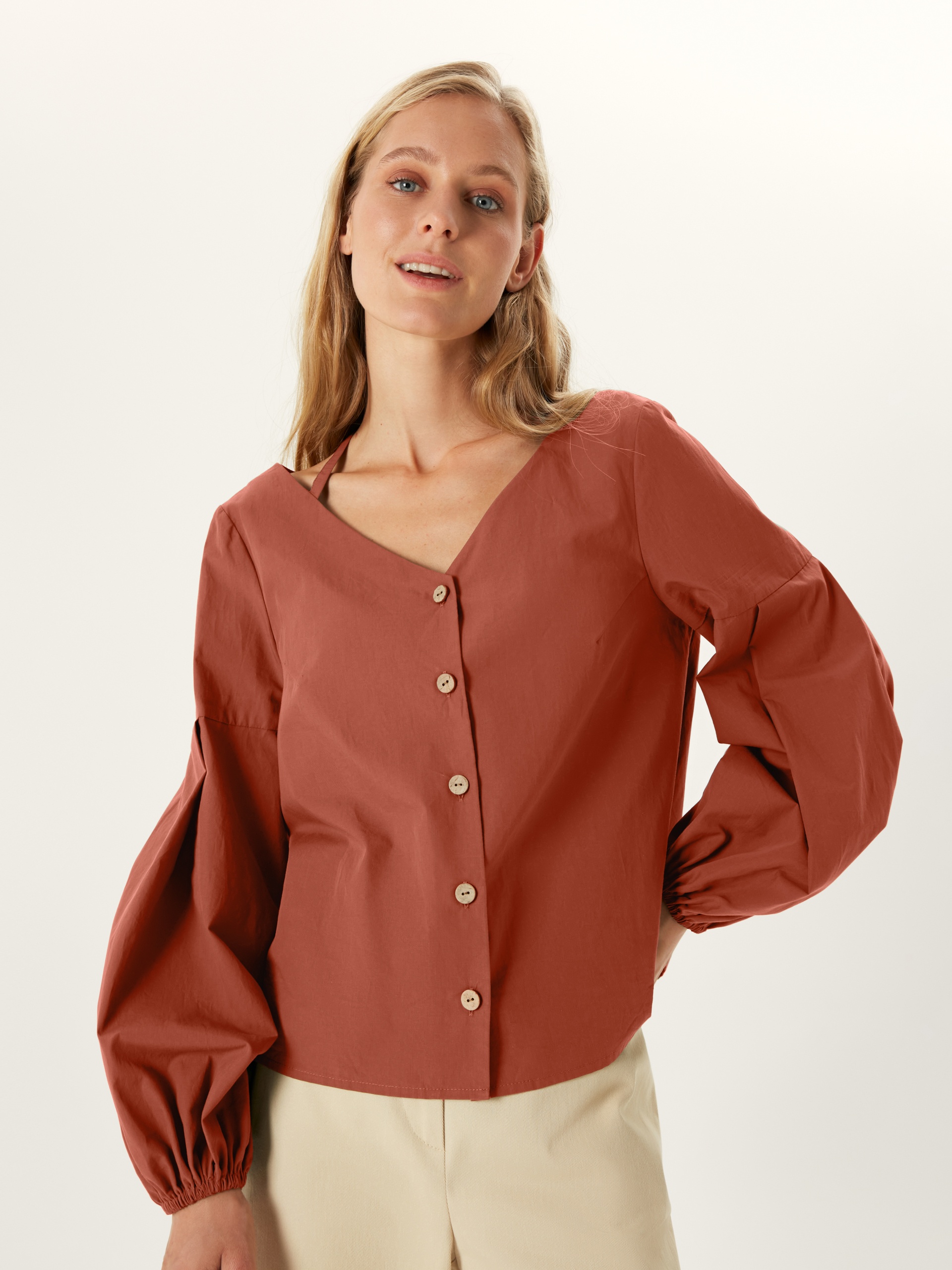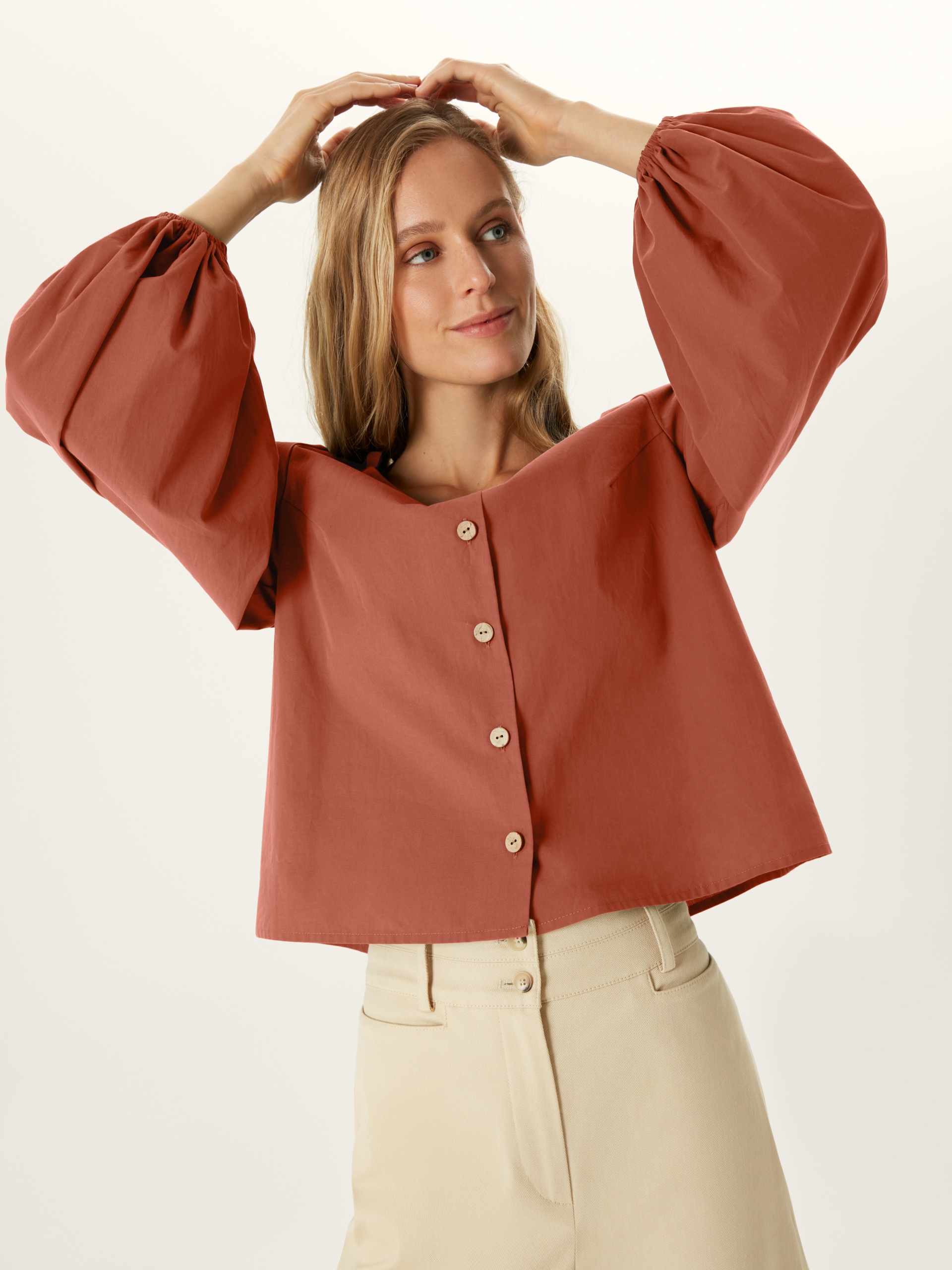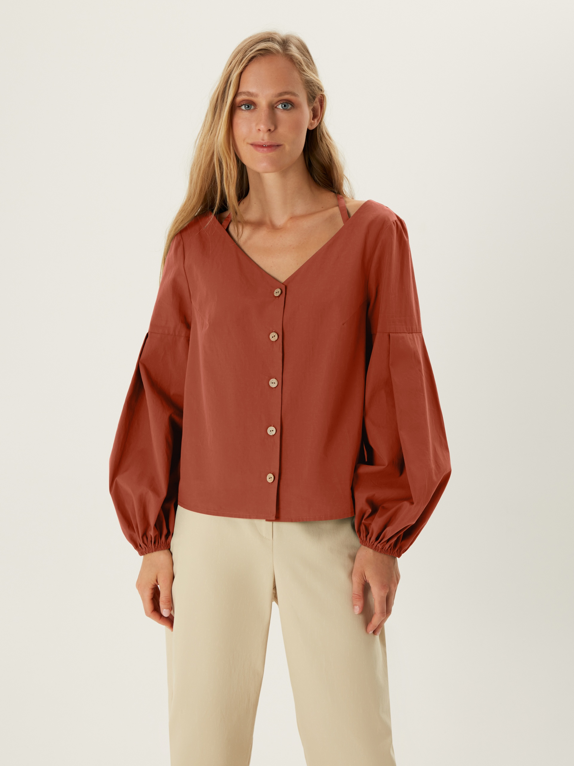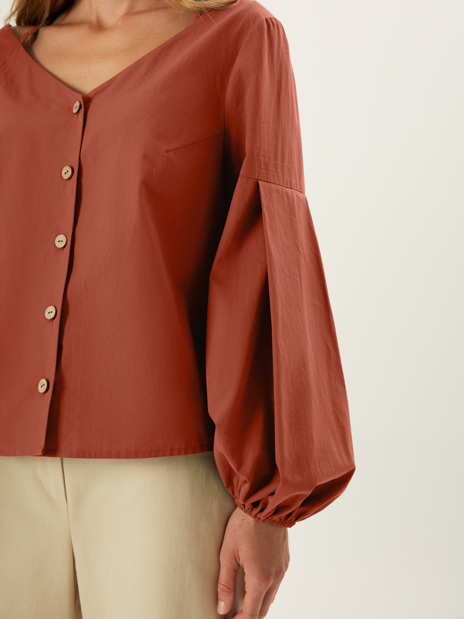 Блуза прямого покроя с V-образным вырезом, кокосовыми пуговицами и фантазийными рукавами. По горловине идет резинка для лучшей фиксации выреза. Блуза выполнена из хлопковой ткани в цвете "красная глина".