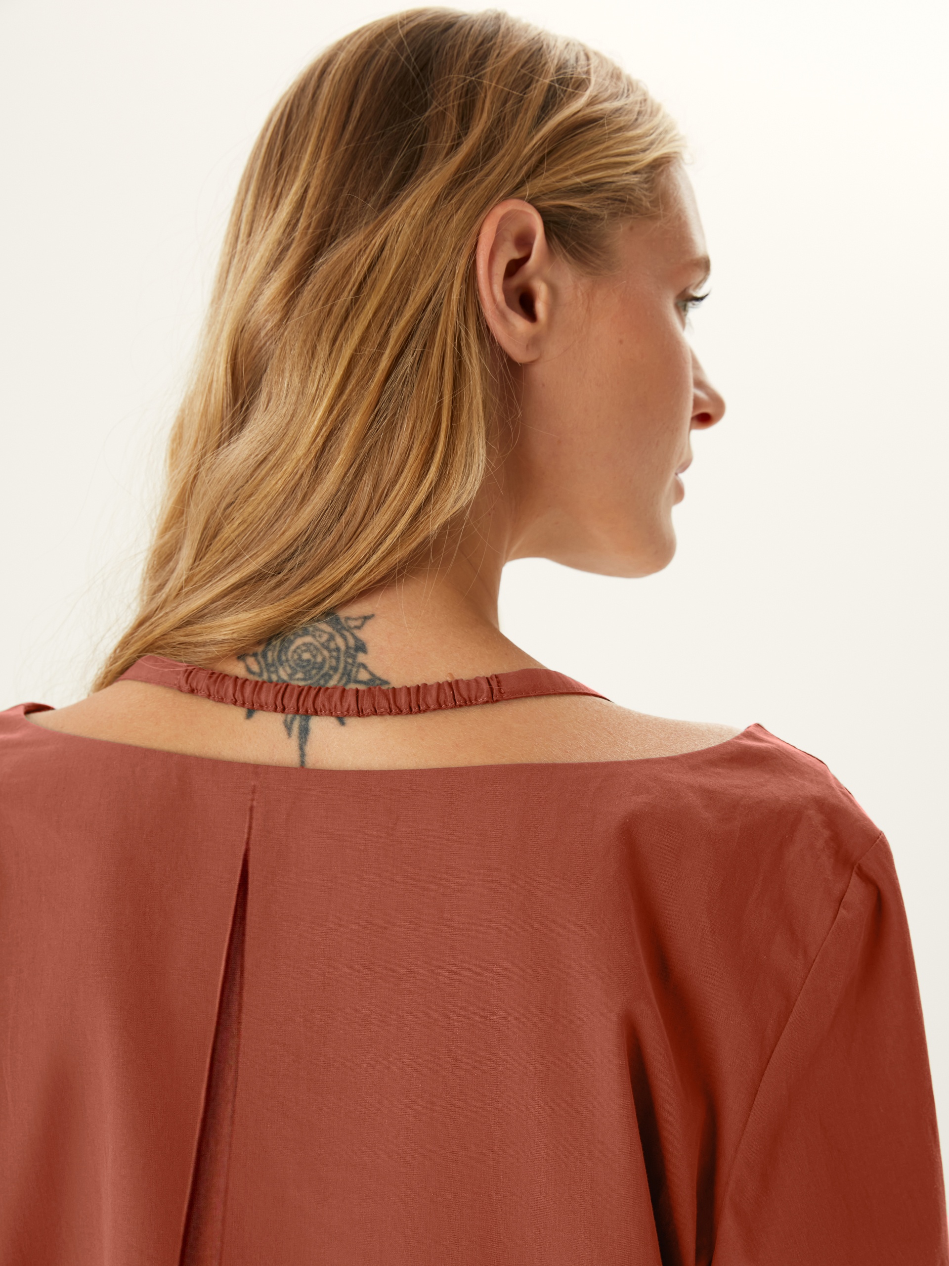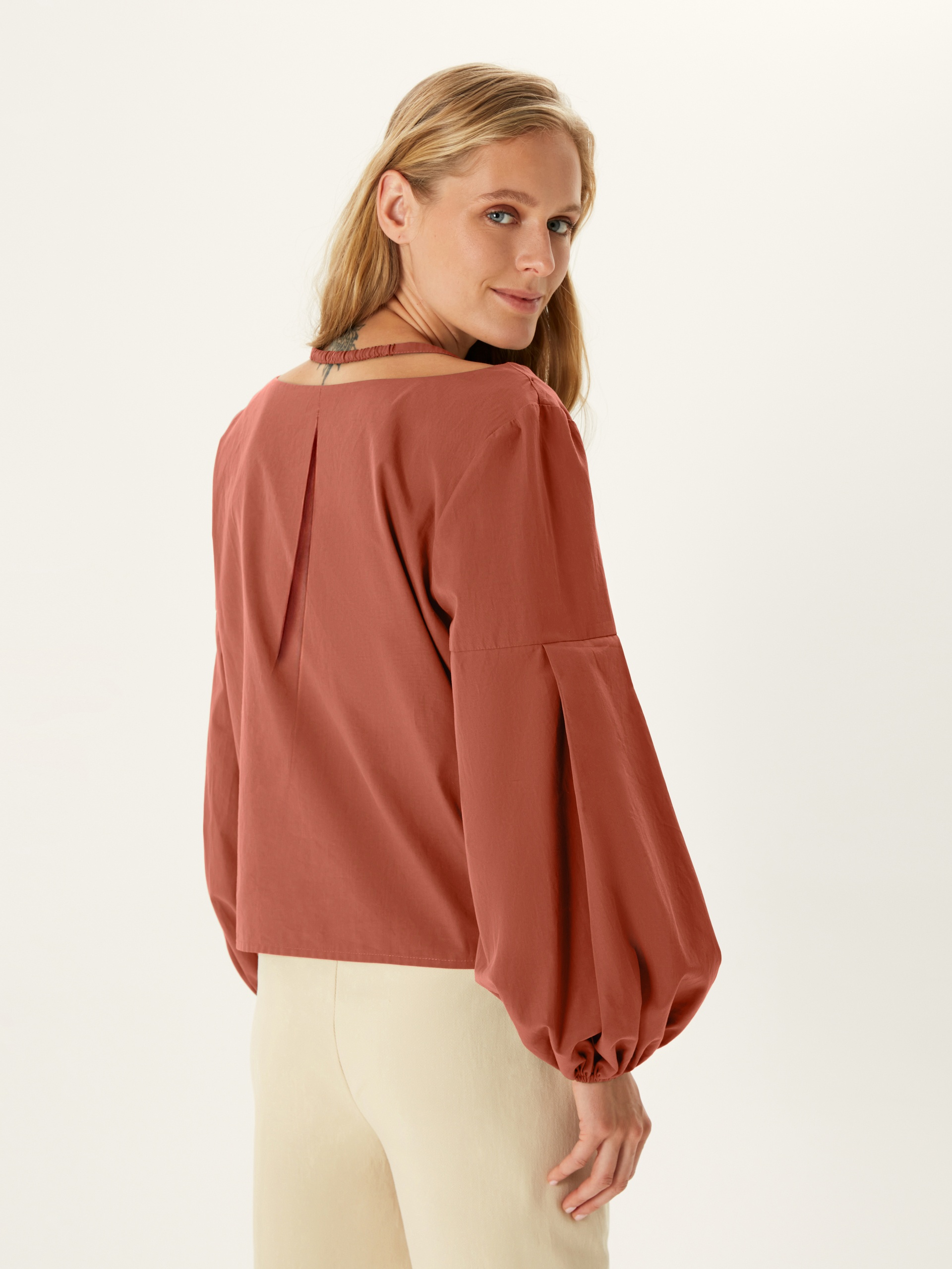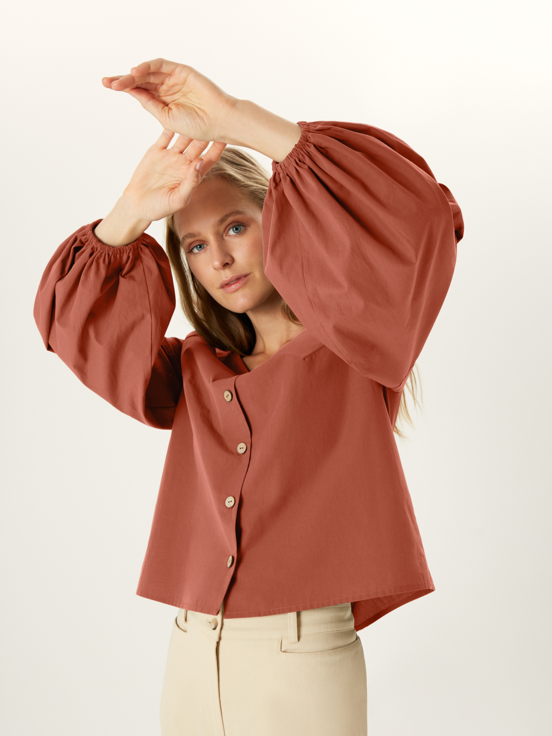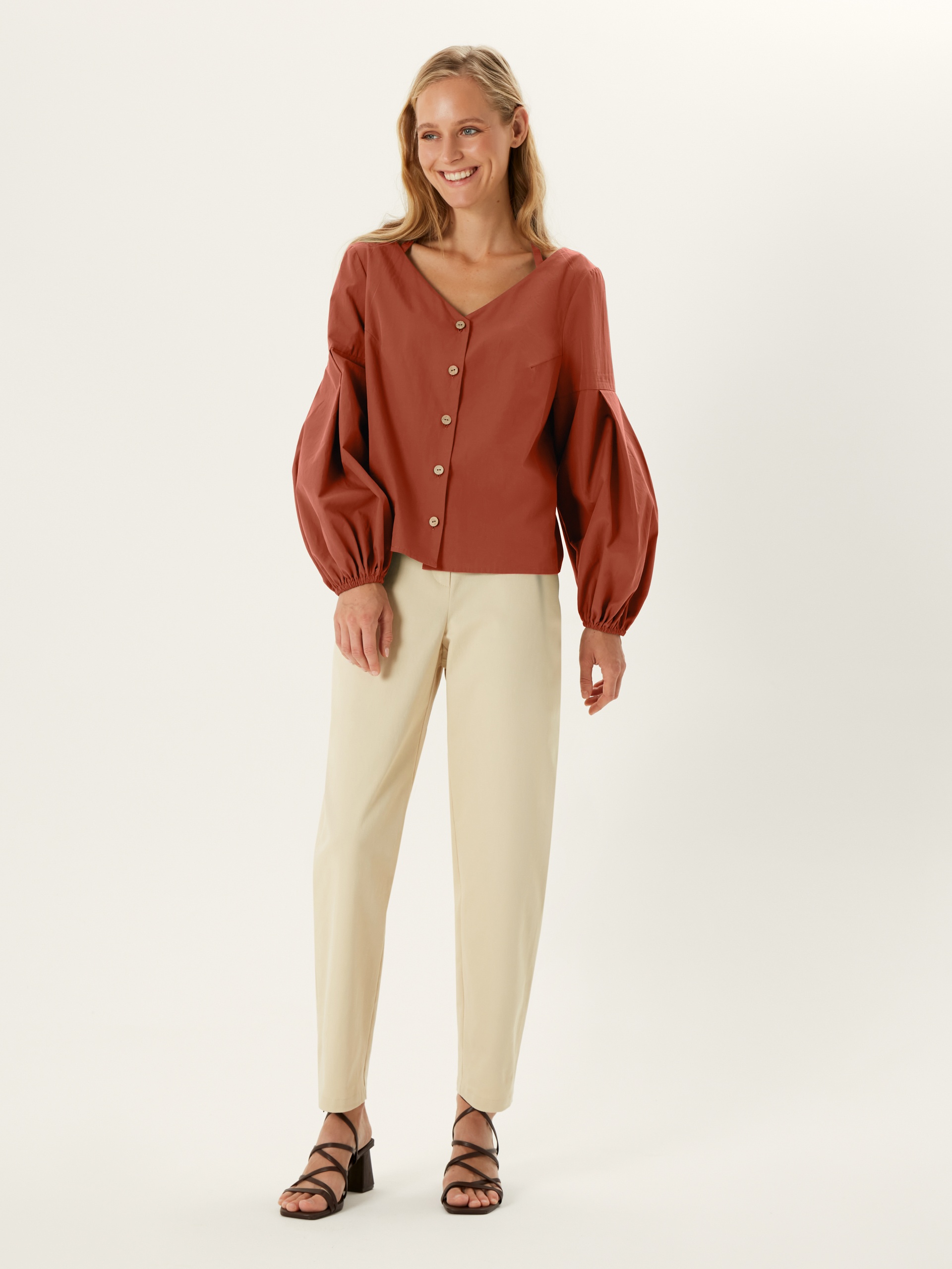 Блуза прямого покроя с V-образным вырезом, кокосовыми пуговицами и фантазийными рукавами. По горловине идет резинка для лучшей фиксации выреза. Блуза выполнена из хлопковой ткани в цвете "красная глина".
