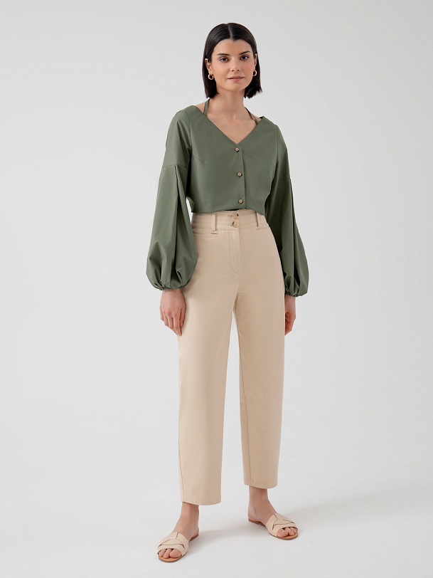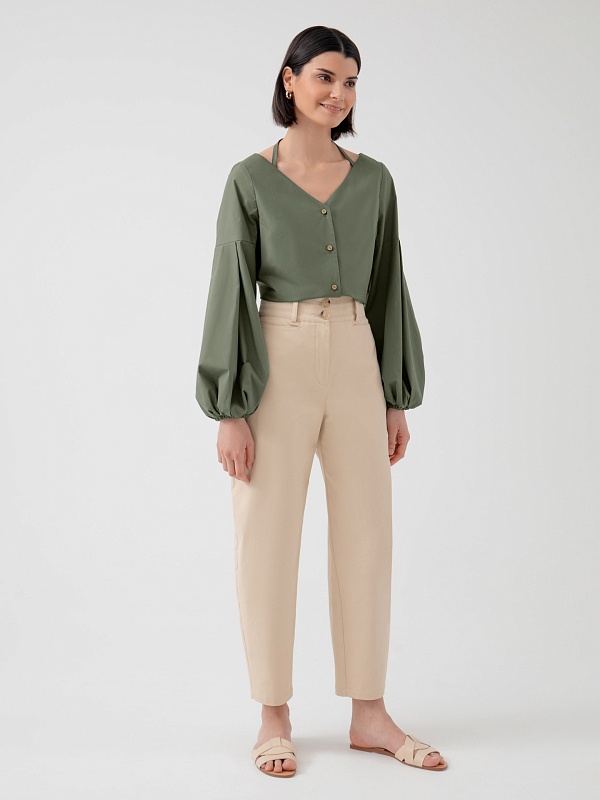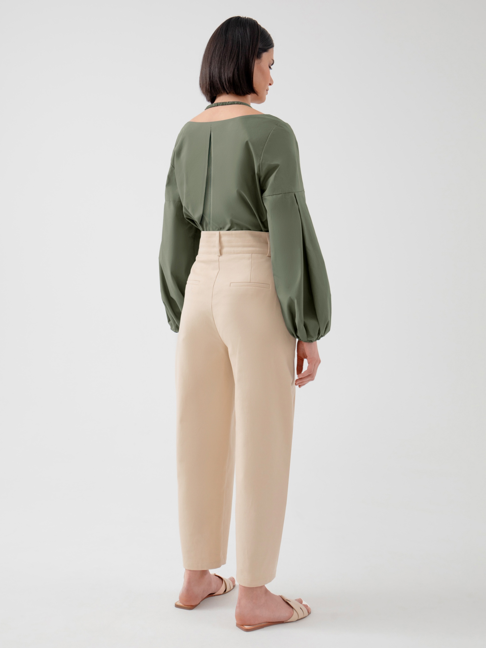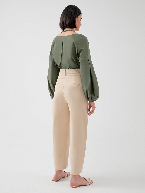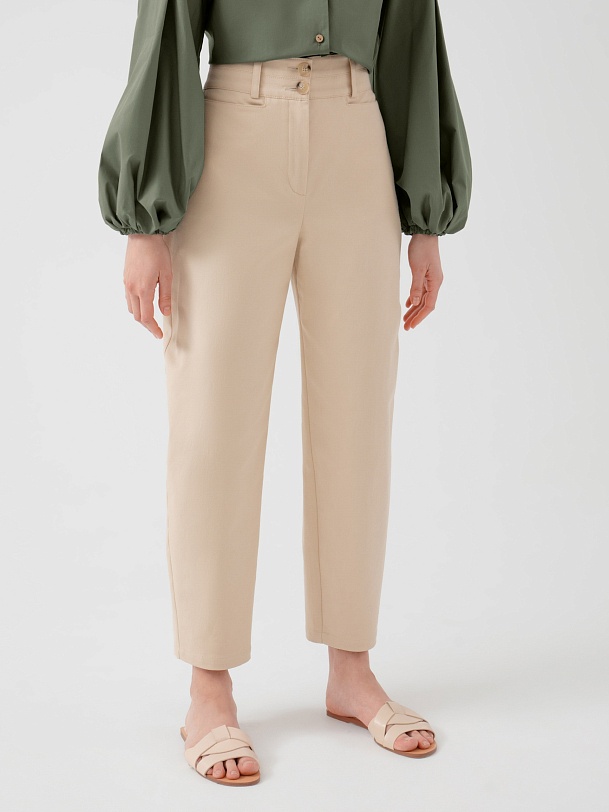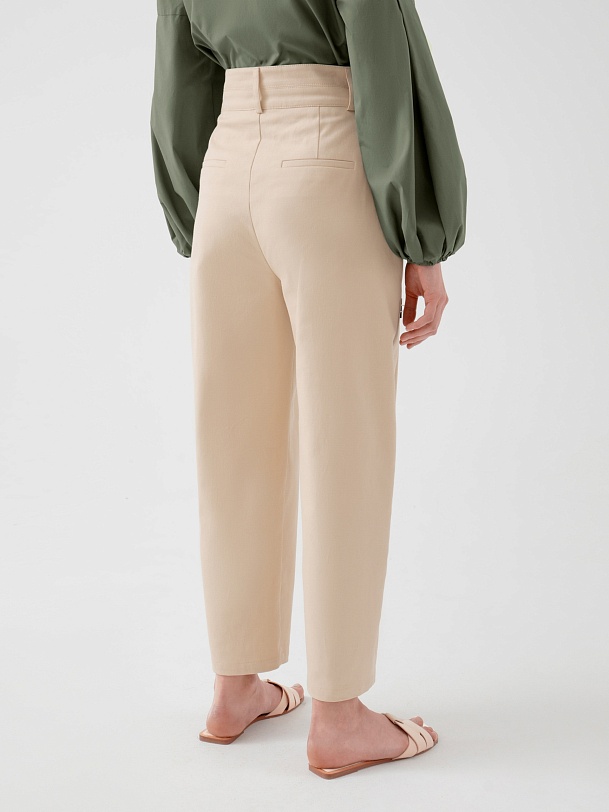 Брюки бананы из джинсовой ткани в бежевом цвете, с широким поясом и отстрочками на 2-х пуговицах. У брюк рабочие прорезные карманы-листочки по переду.