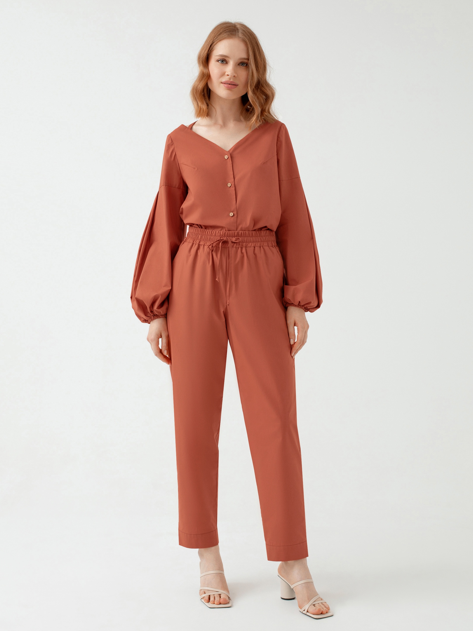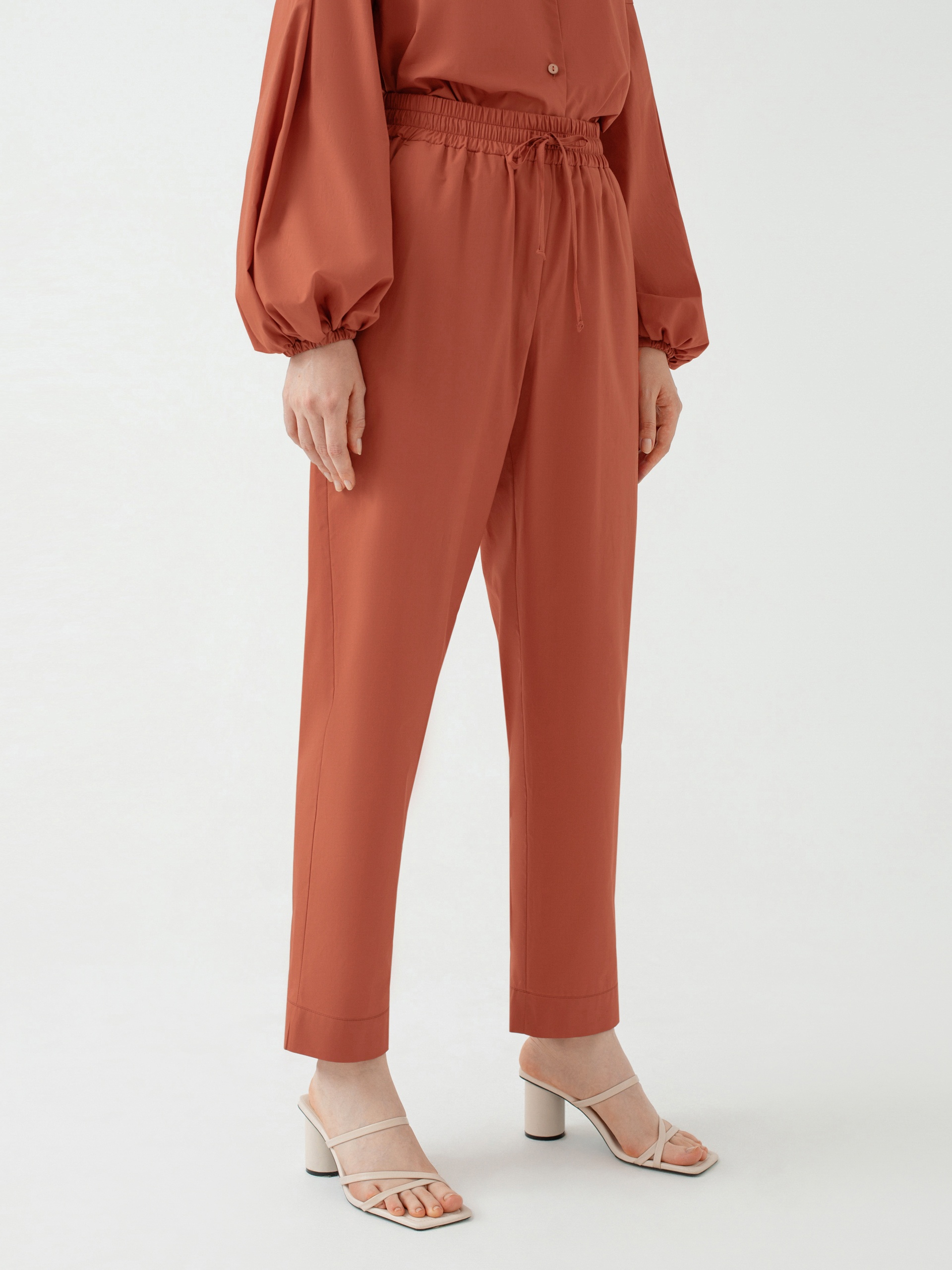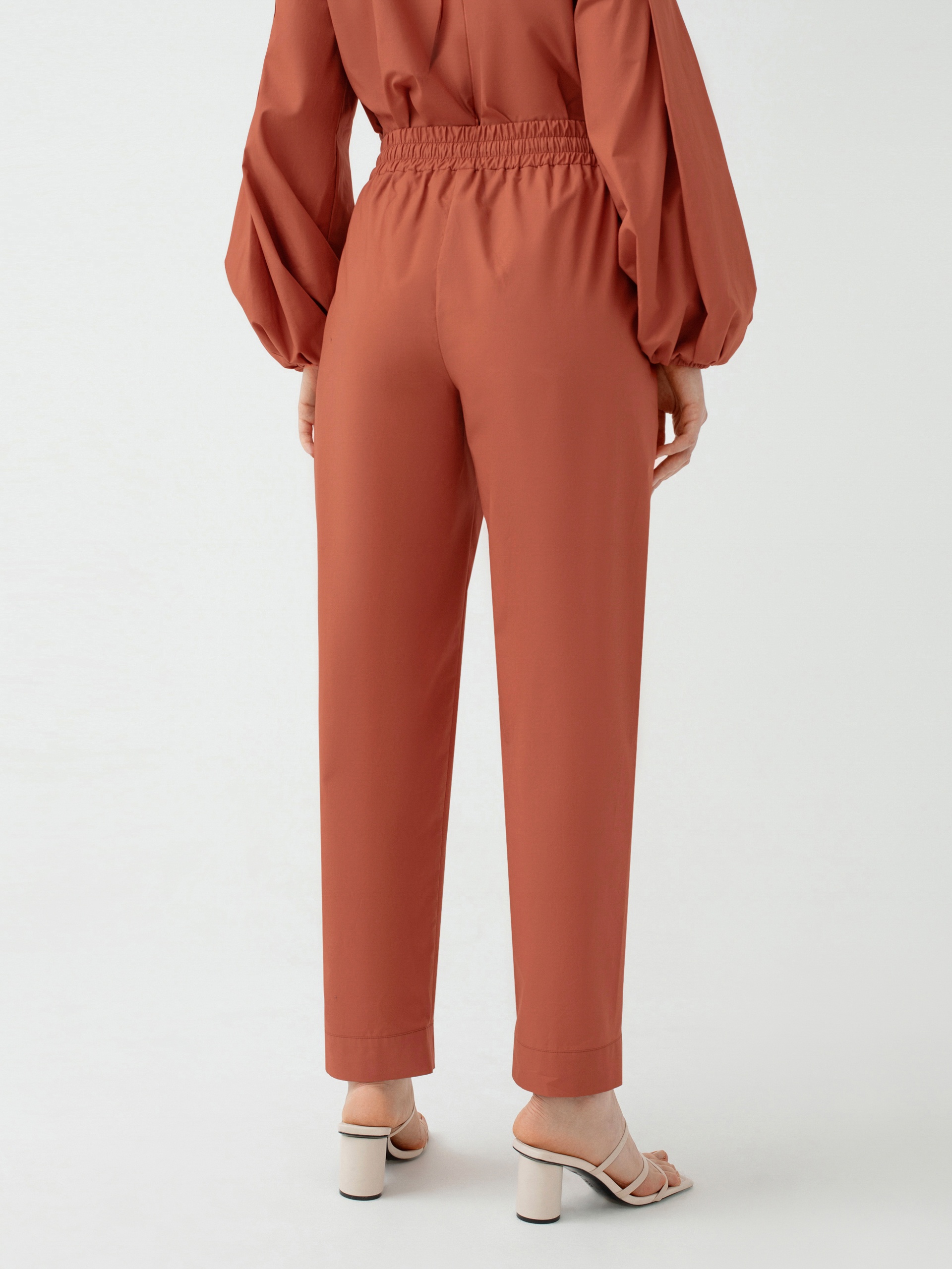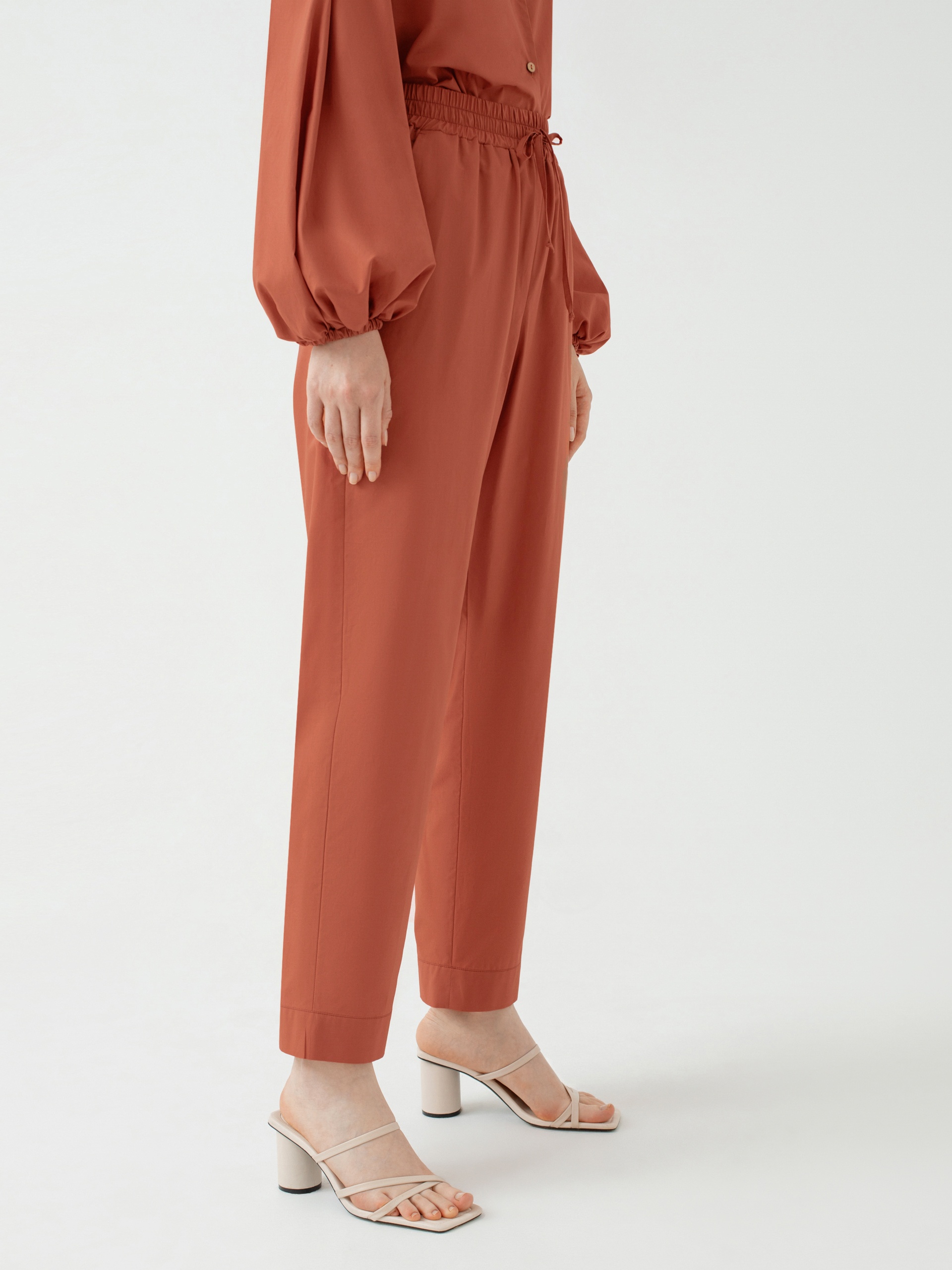 Стильные брюки из хлопковой ткани в цвете "красная глина" трендового силуэта бананы с резинкой и завязками на талии для комфортной посадки. Незаменимая модель для создания комфортных и стильных повседневных образов.