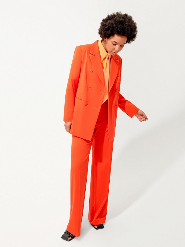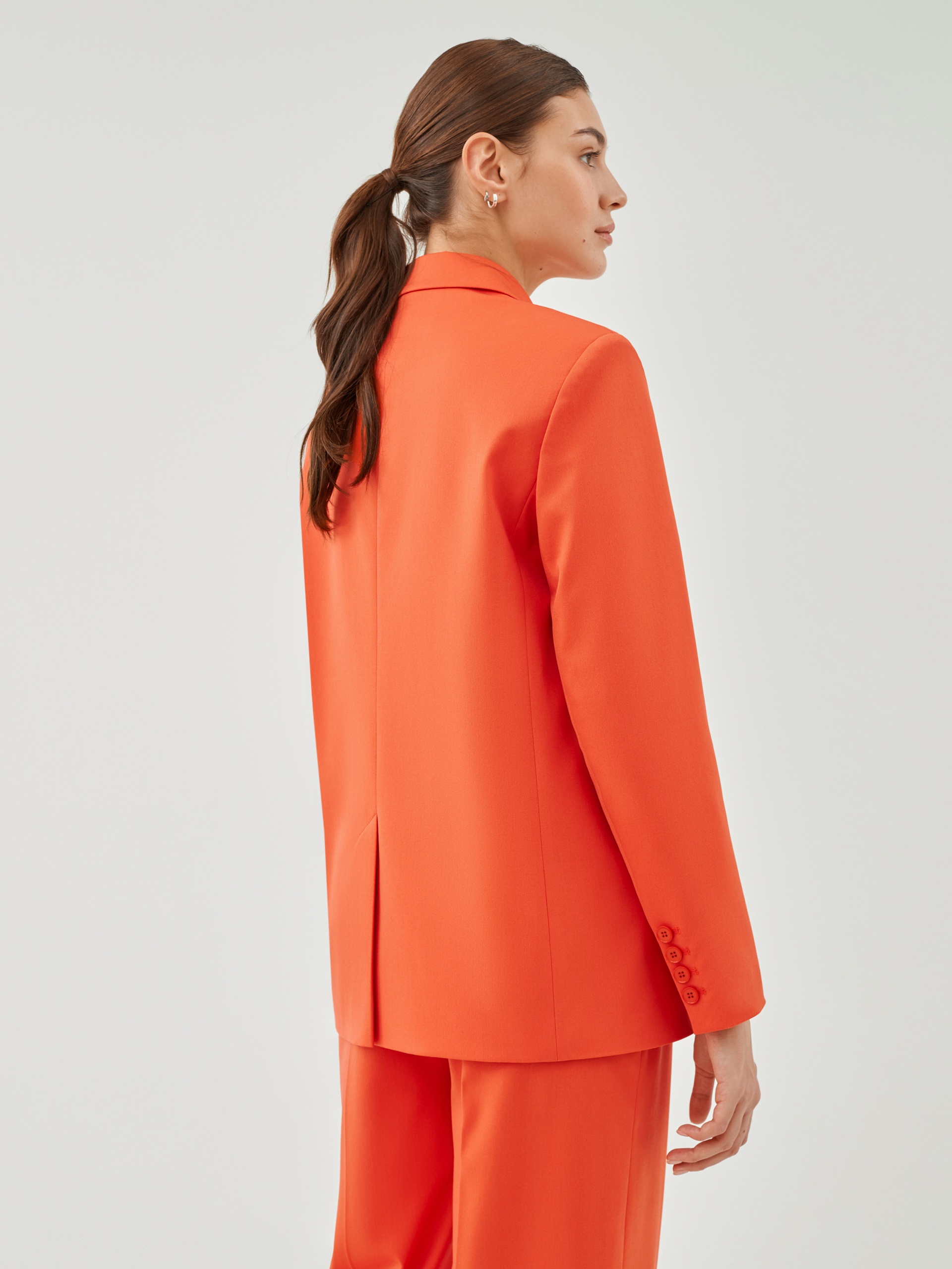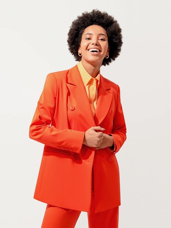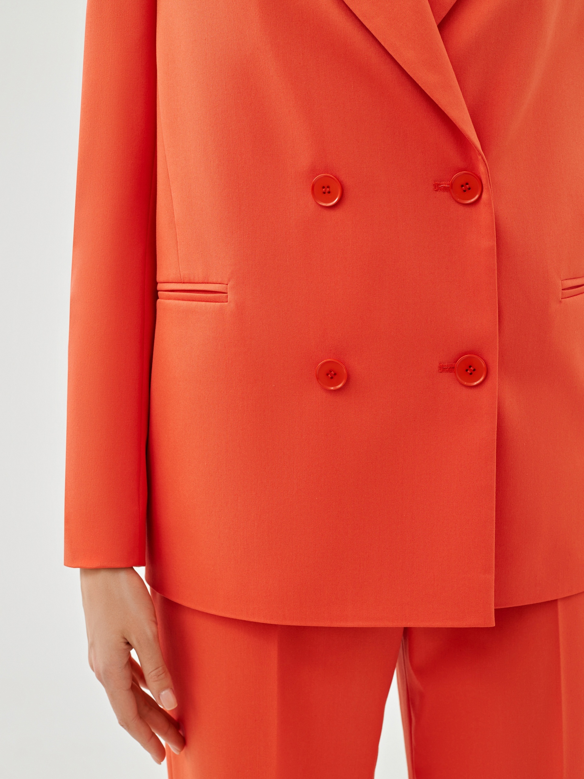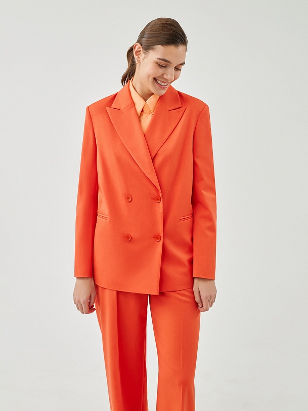 Свободный удлинённый двубортный жакет из костюмной ткани в ярком цвете "грейпфрут". С прорезными карманами листочками и пуговицами в цвет ткани. Жакет полностью на подкладке. Такой жакет составит яркий ансамбль с брюками из одной ткани, а так же будет ярким акцентом в повседневном образе с джинсами.