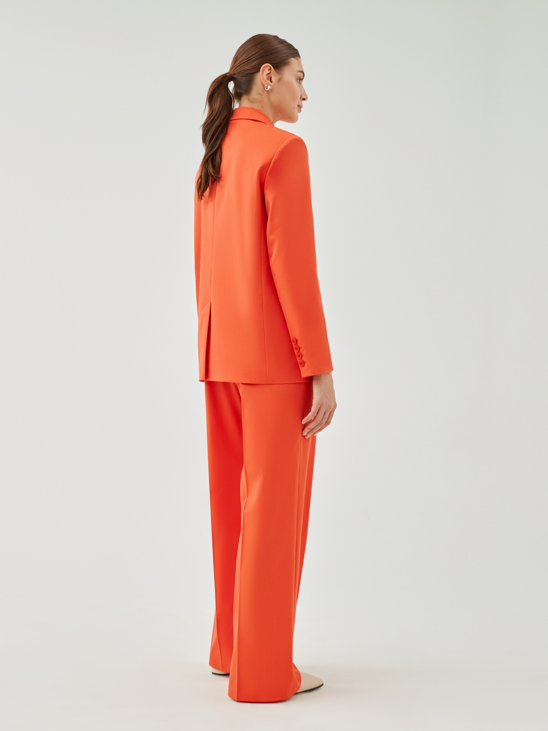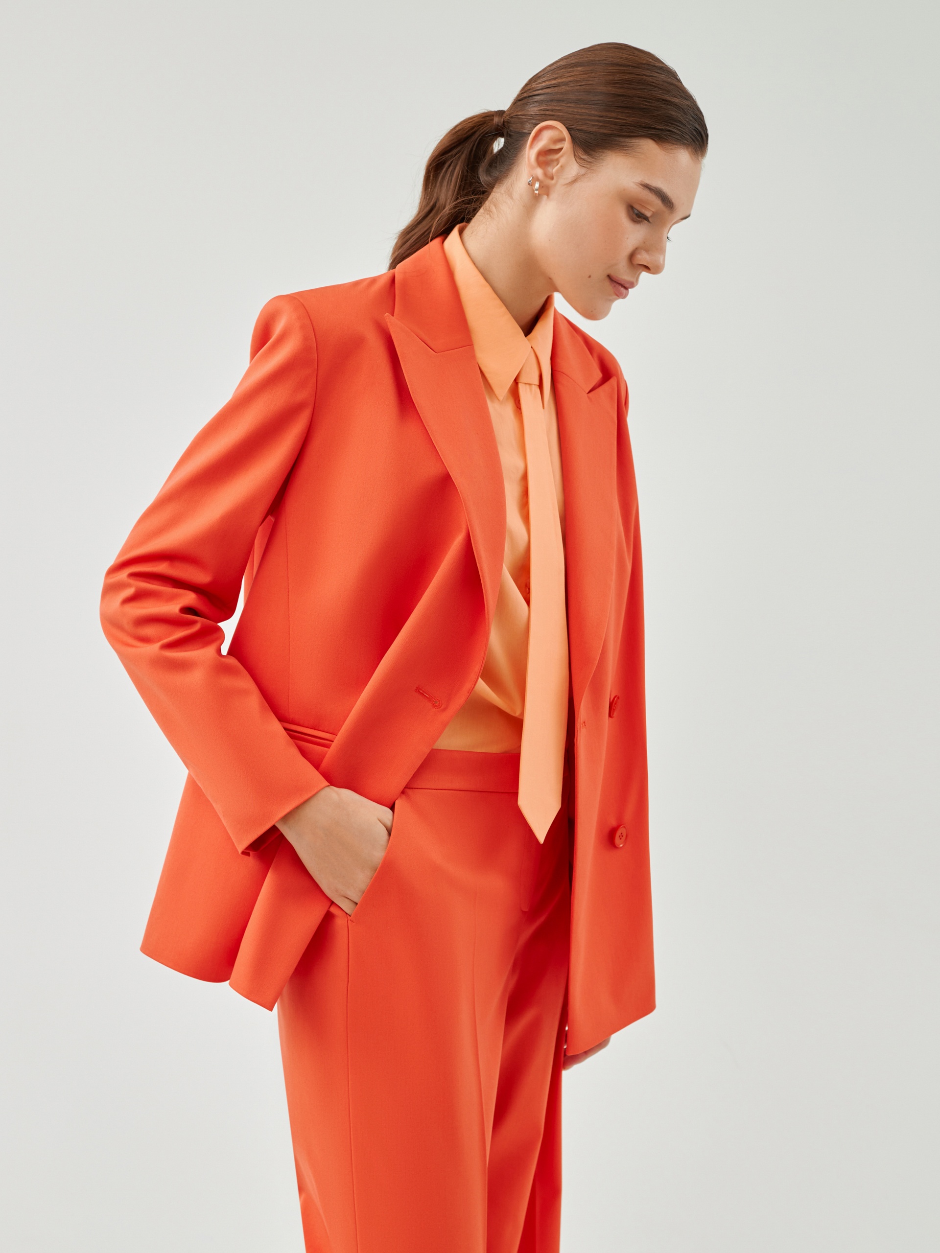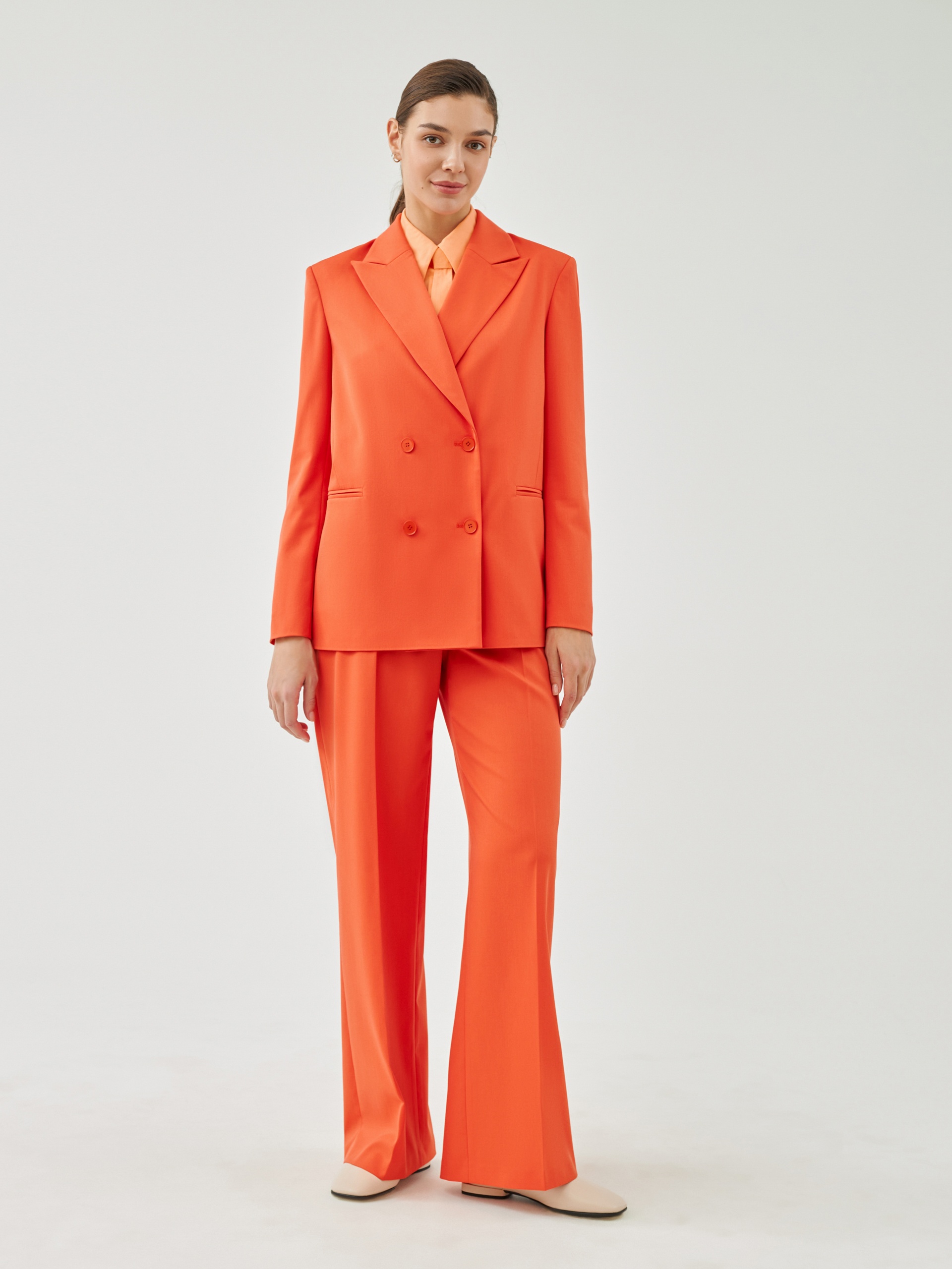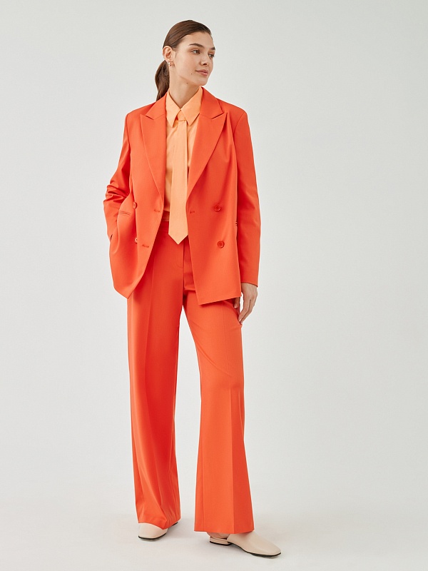 Свободный удлинённый двубортный жакет из костюмной ткани в ярком цвете "грейпфрут". С прорезными карманами листочками и пуговицами в цвет ткани. Жакет полностью на подкладке. Такой жакет составит яркий ансамбль с брюками из одной ткани, а так же будет ярким акцентом в повседневном образе с джинсами.