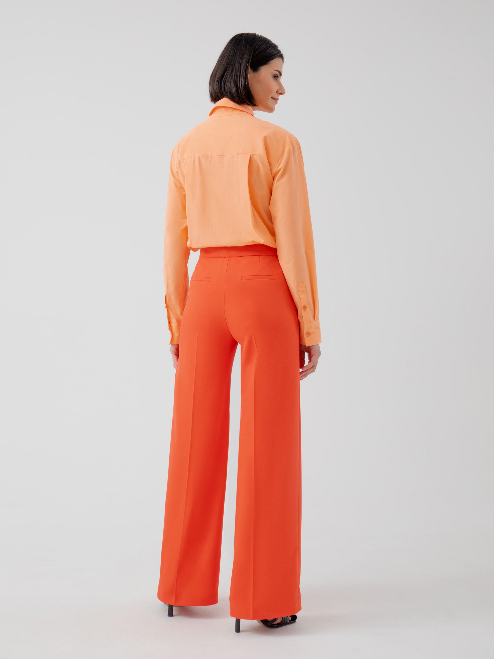 Классические прямые брюки со стрелками на завышенной посадке из костюмной ткани в ярком цвете "грейпфрут". Брюки с рабочими карманами по бокам. Застежка спереди на молнию, обтяжную пуговицу и крючок. Модель идеально подойдёт для создания ярких образов в комплекте с жакетом из подобной ткани.